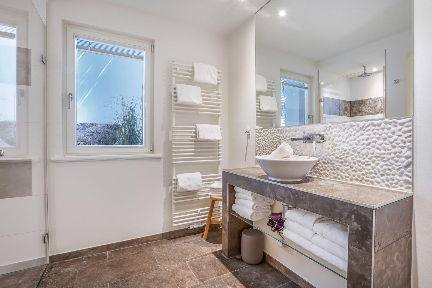 Das Schlafzimmer bietet Ihnen eine gemütliche Oase der Ruhe. Hier können Sie sich in das bequeme Bett kuscheln oder auf der angrenzenden Terrasse, die mit einem gemütlichen Strandkorb ausgestattet ist die Sonne genießen. Das separate Badezimmer erwartet Sie mit einer großzügigen Dusche, die Ihnen nach einem Tag am Strand eine erfrischende Erholung bietet.