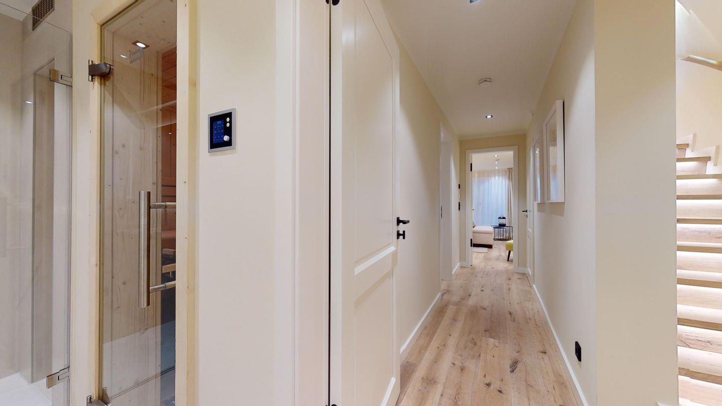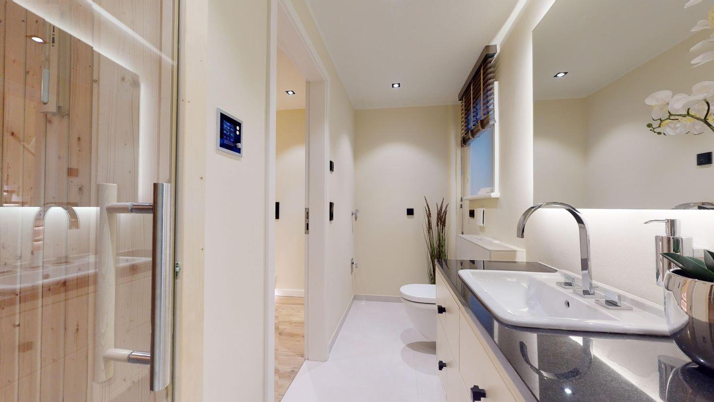 Das moderne Badezimmer ist mit einer Regendusche und einer privaten Sauna ausgestattet – für entspannte Wellness-Momente in Ihrem eigenen Urlaubsdomizil.