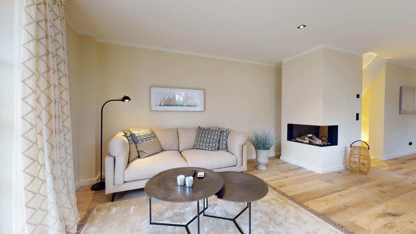Im Erdgeschoss erwartet Sie ein heller, offener Wohn- und Essbereich mit integrierter Küche – der perfekte Ort für gesellige Stunden mit Familie oder Freunden. Die gemütliche Sofaecke mit Gaskamin lädt zum Verweilen ein, und der eingebaute Weinkühlschrank sorgt dafür, dass Ihre Lieblingsweine stets perfekt temperiert sind. Ein Gäste-WC ergänzt den Komfort auf dieser Ebene.