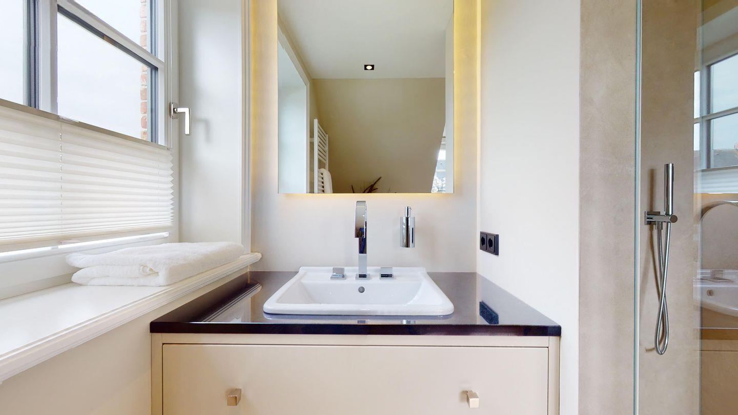 Das moderne Badezimmer ist mit einer Regendusche ausgestattet und verfügt über Tageslicht, das eine angenehme Atmosphäre schafft.