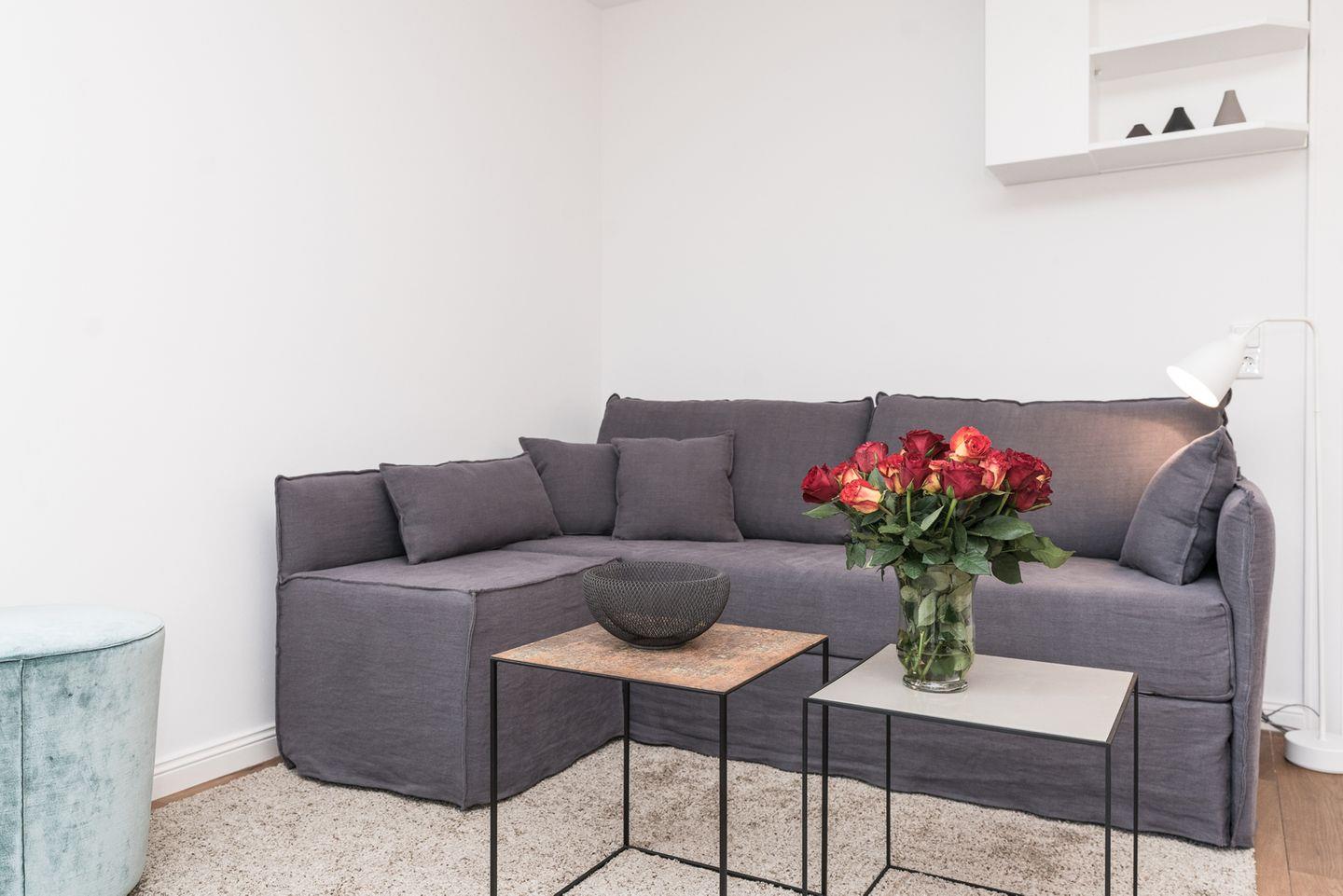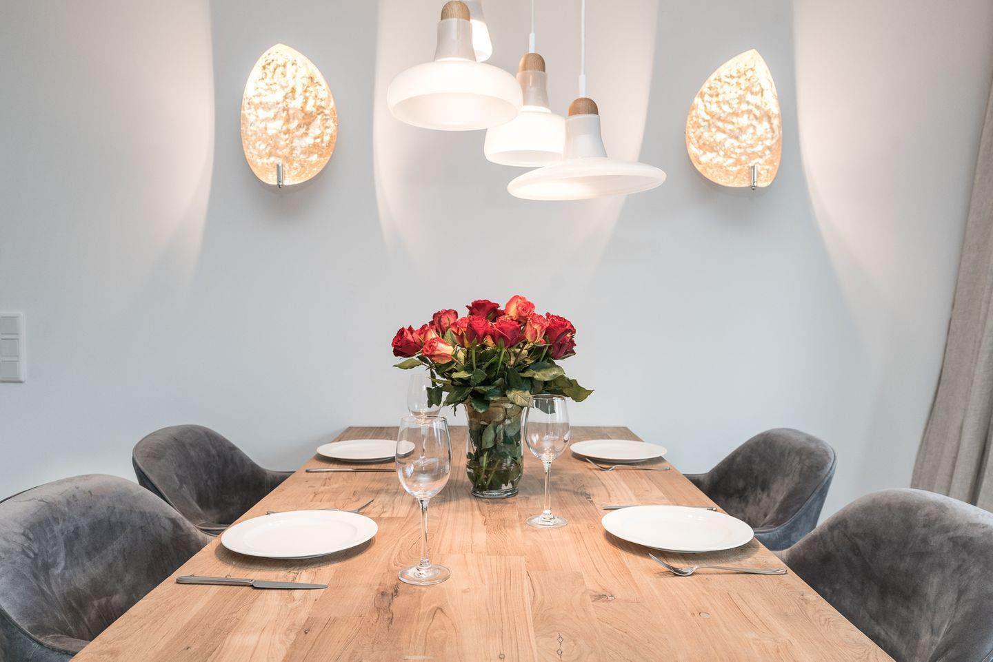 Schon beim Betreten spüren Sie die angenehme Atmosphäre dieser mit Liebe zum Detail gestalteten Unterkunft: Ein lichtdurchfluteter Wohn- und Essbereich empfängt Sie mit gemütlicher Eckcouch, Smart-TV und einem großzügigen Esstisch, der zu geselligen Abenden oder gemeinsamen Mahlzeiten einlädt.