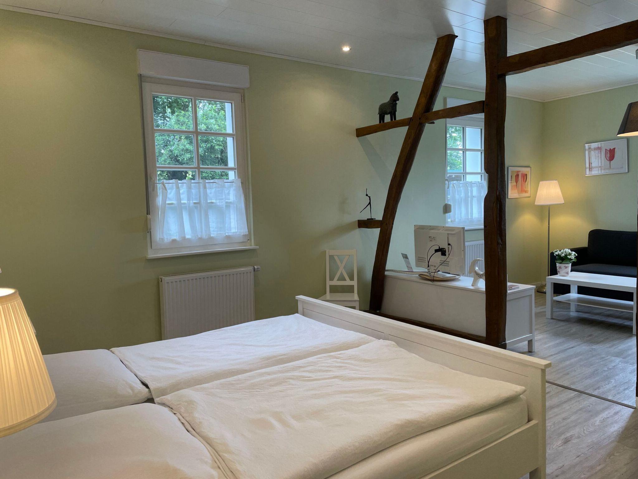 We are situated in a quiet and idyllic location on the outskirts of Hückeswagen/Remscheid-Lennep, in a residential street right next to the forest. The Bergische Panoramasteig for hikers is right on the doorstep, as well as the entrance and exit to the Bergische Panorama cycle path. Pets can be brought along for a fee and the flat was completely renovated in 2018 and furnished to a high standard. It is located on the ground floor, has a separate entrance and has underfloor heating throughout as well as additional radiators. All rooms can be darkened with roller shutters and the flat is designed for 2 people, but there is also a very comfortable, large spring-core sofa bed (1.60x2.00) in the living room for additional guests. The living room and bedroom are open-plan, the HD TV can be easily rotated so that you can watch TV either from the bed or from the couch, and the bedroom has a large double bed (1.80x2.00). The duvet and pillows are made of vegan kapok and the kitchen has 2 seats. Spices, tea, coffee and food in the cupboards are of course free to use. The bathroom has a level-access shower with a gentle rain shower. Towels and sufficient utensils for personal hygiene are provided.