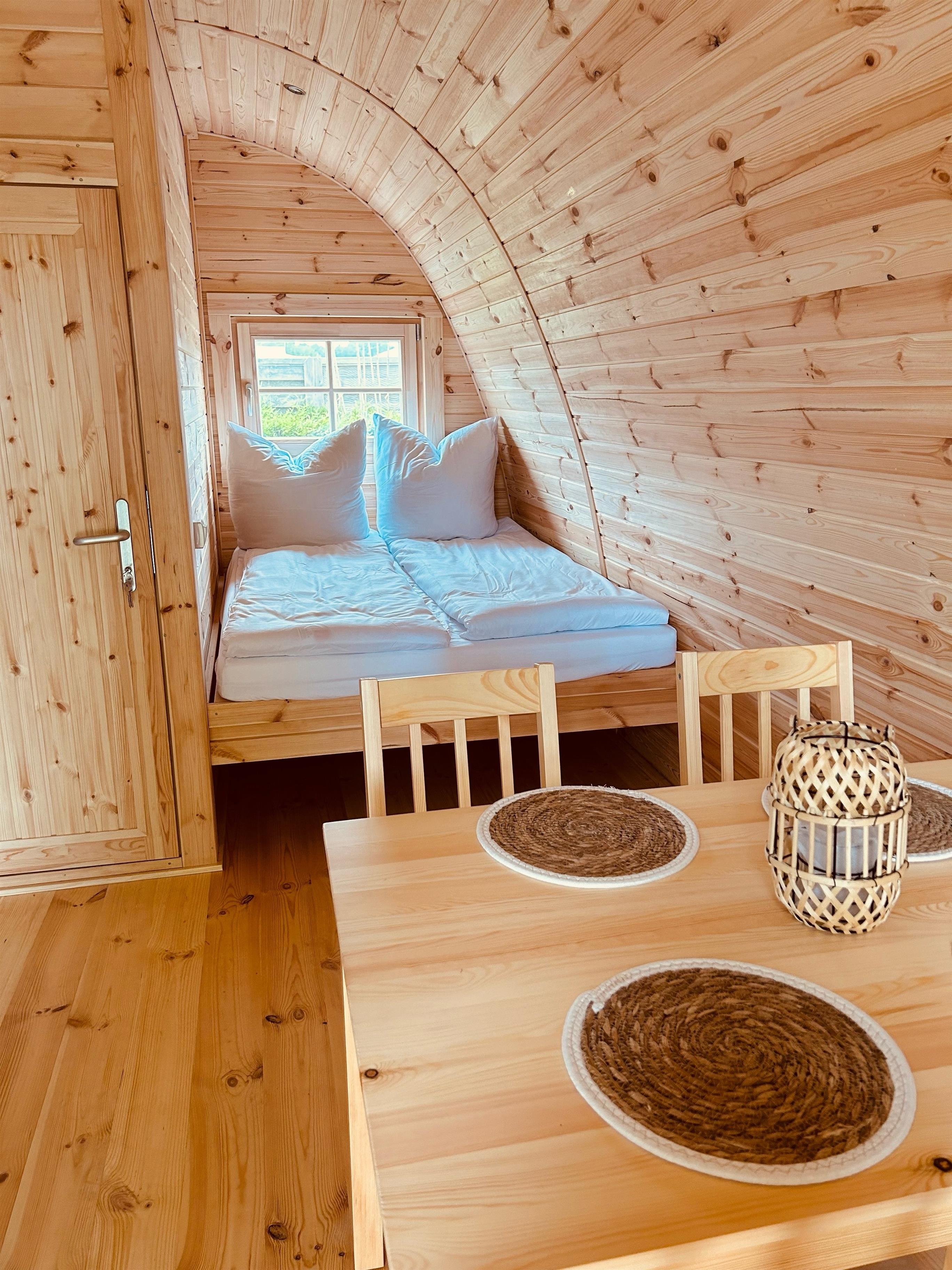 Im POD finden bis zu vier Personen einen Schlafplatz. Bitte beachten Sie, dass das obere Bett im Etagenbett sehr klein und schmal ist. Dieses Bett ist eher nur für Kleinkinder nutzbar.