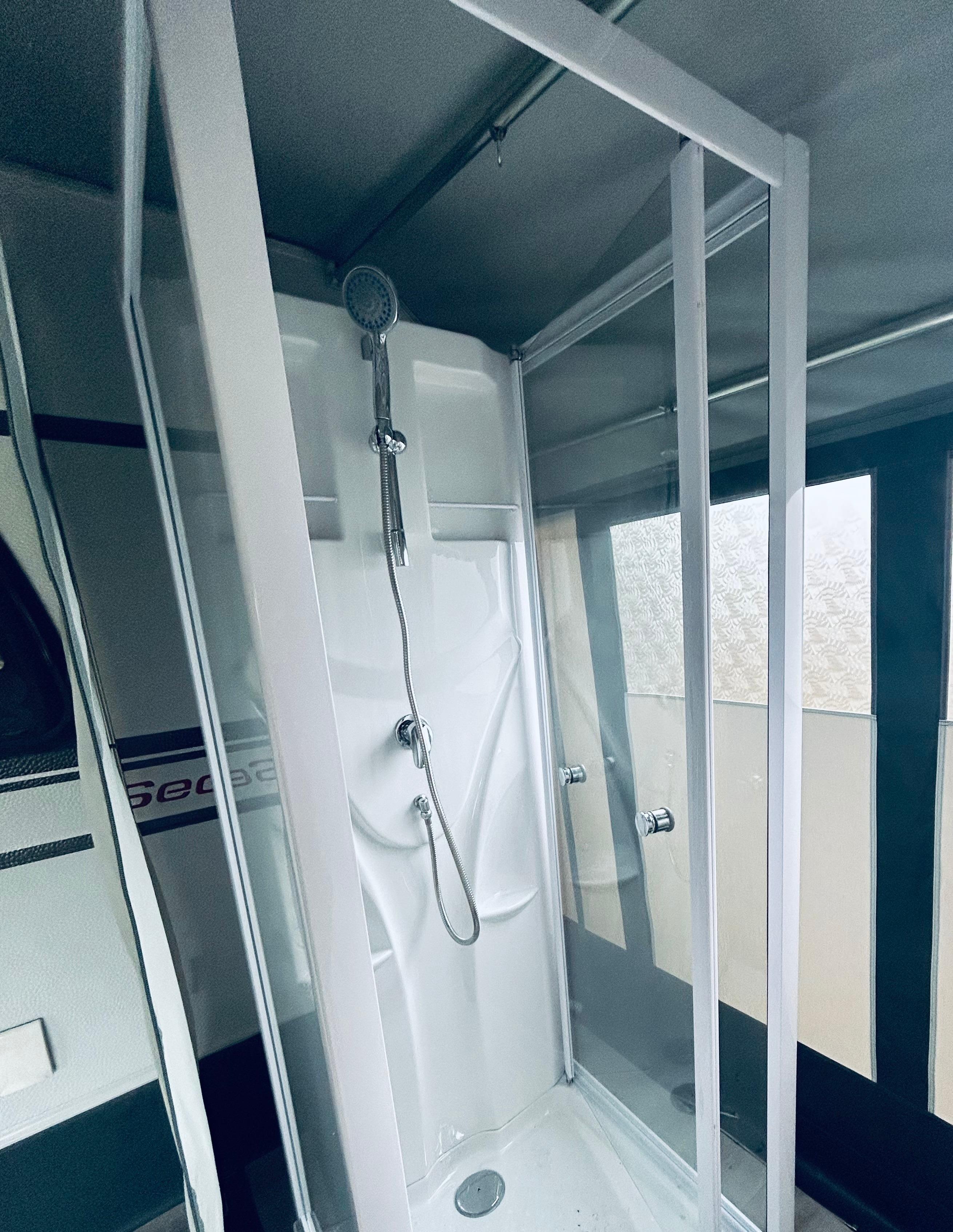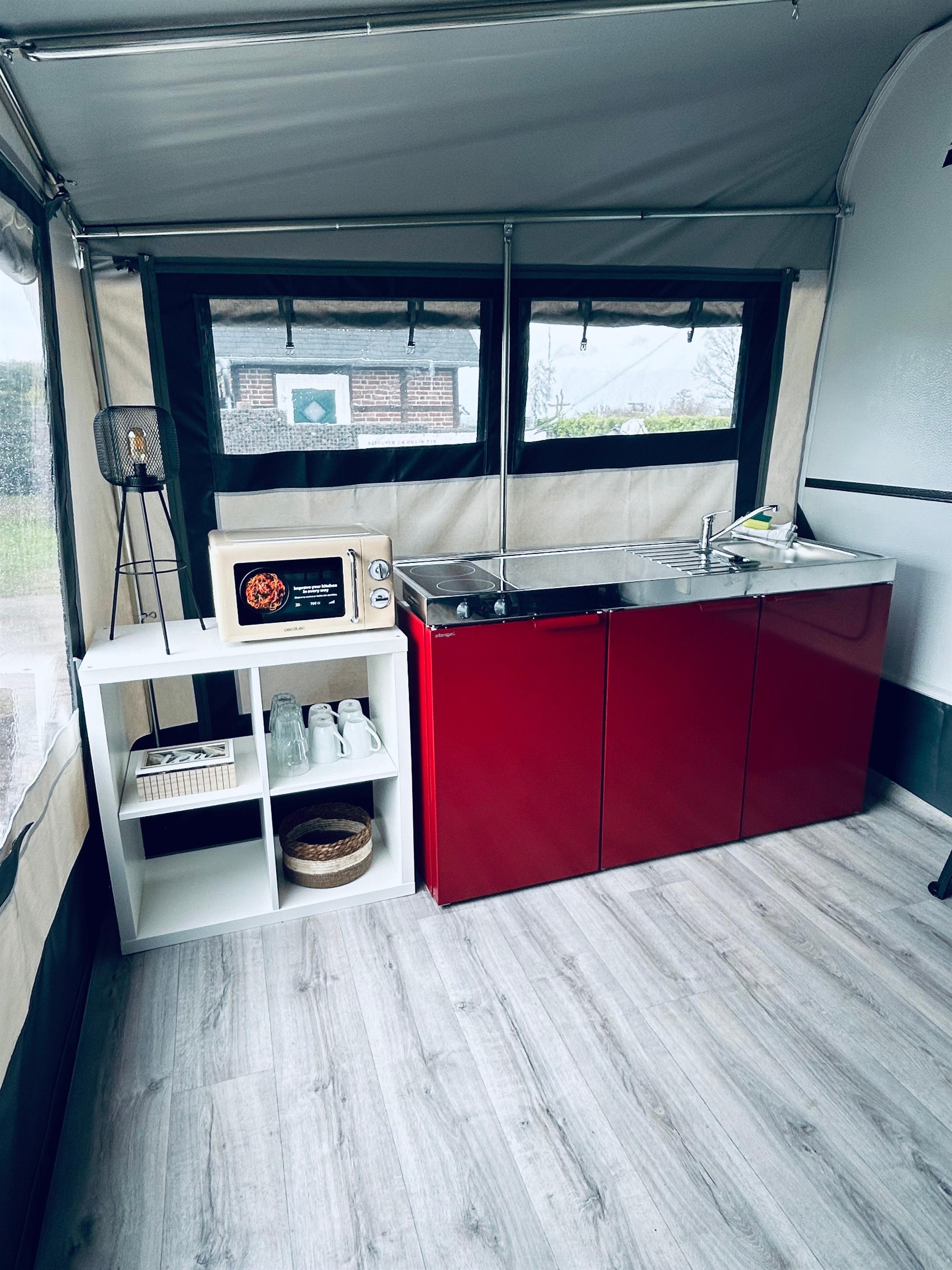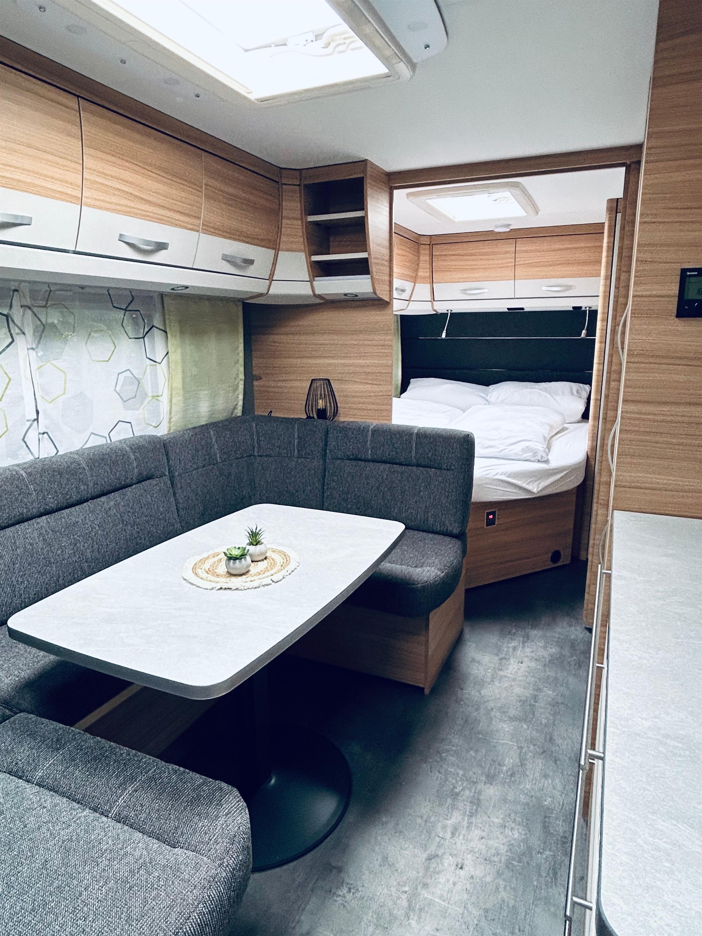 Küchenzeile mit Spüle & Küchenschränken, Kochfeld, Kühlschrank, Kaffeemaschine, Wasserkocher, Toaster, Besteck, Geschirr, Bettwäsche, TV, Heizung, Dusche im Vorzelt, Toilette im Wohnwagen, Tisch & Stühle