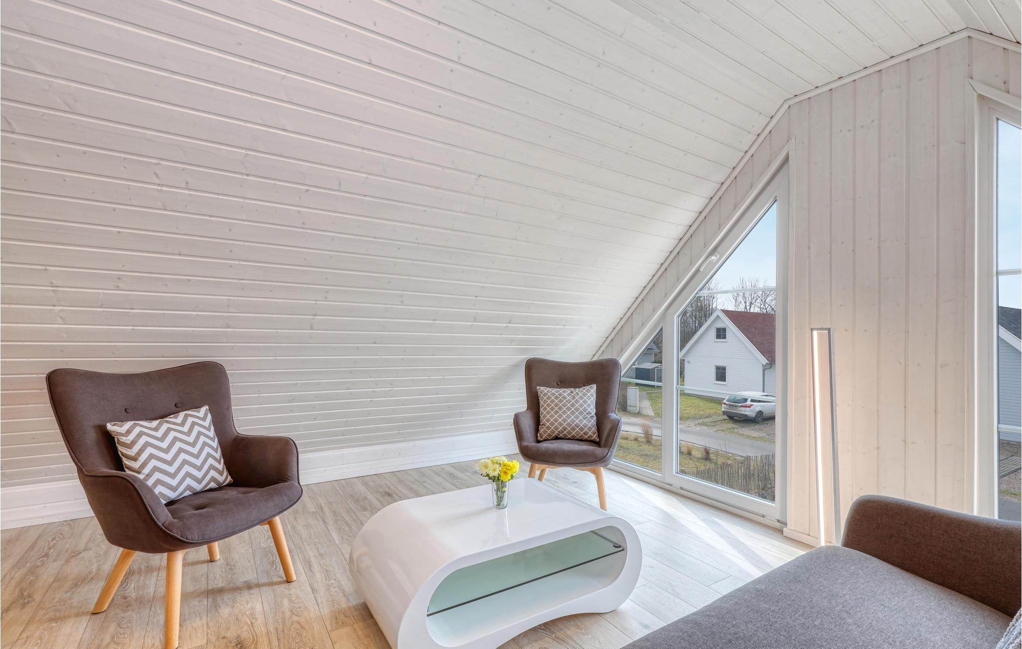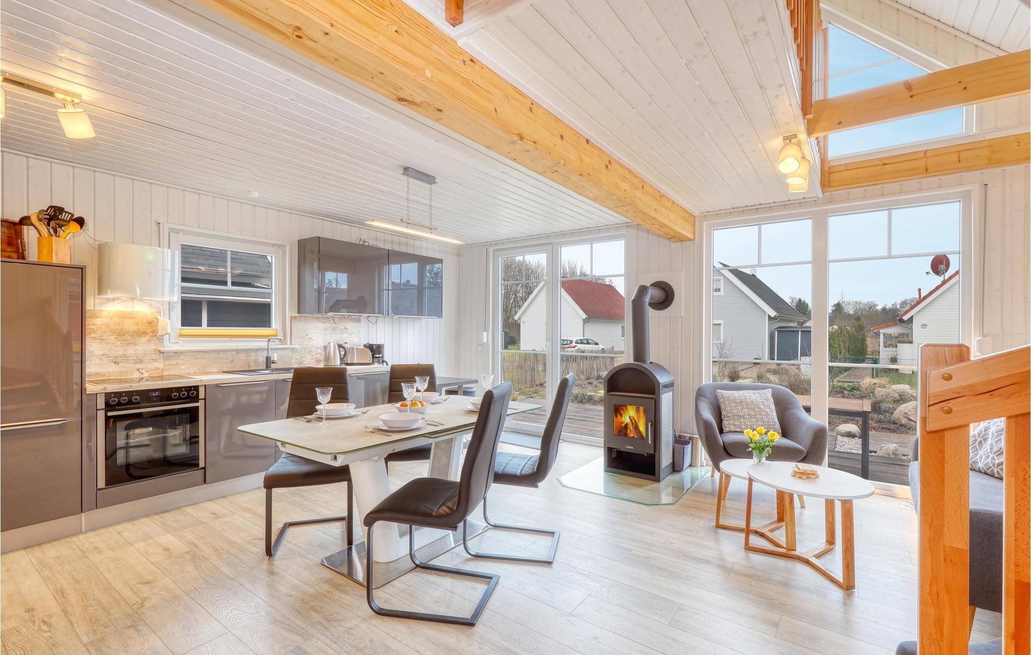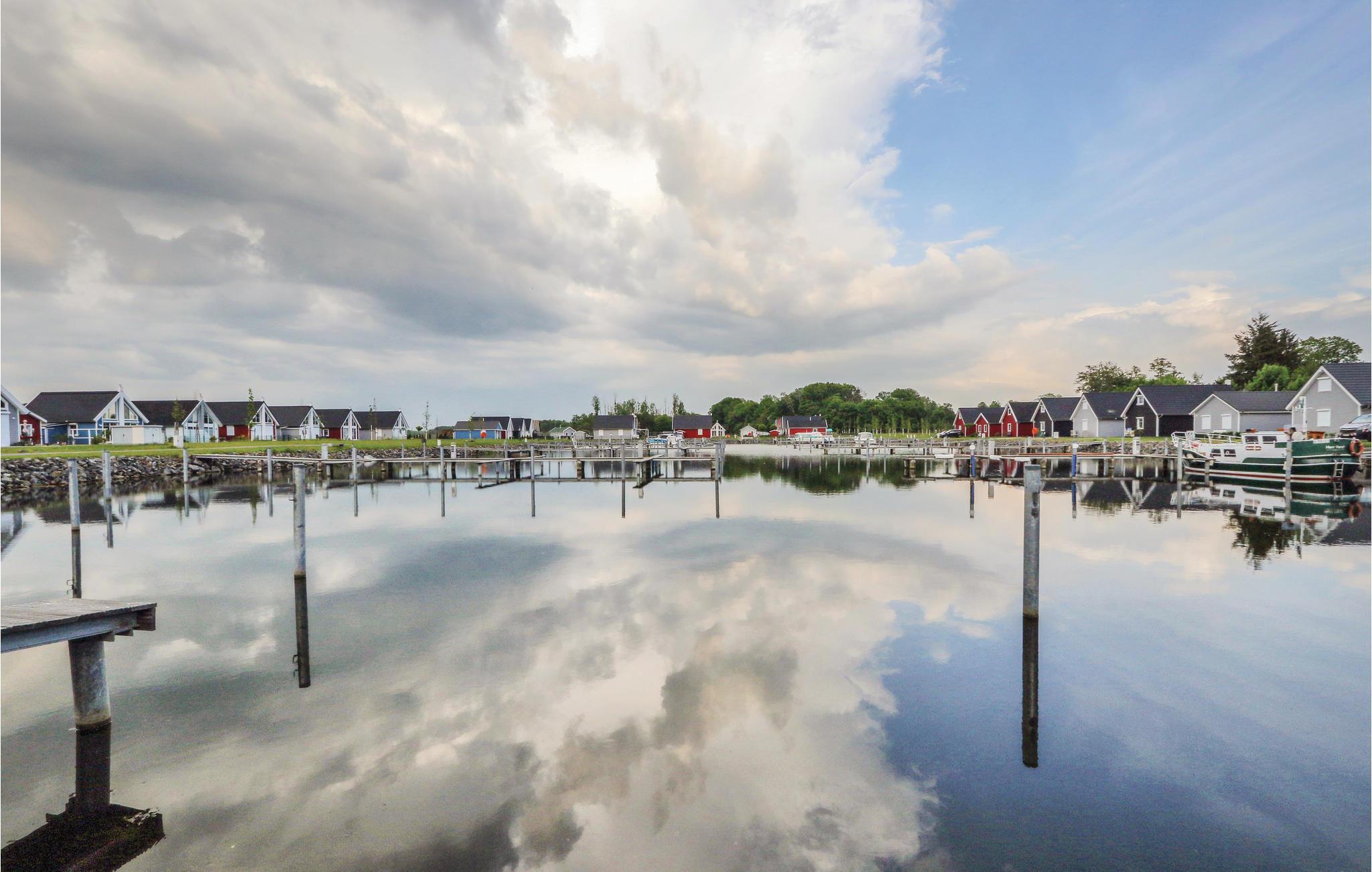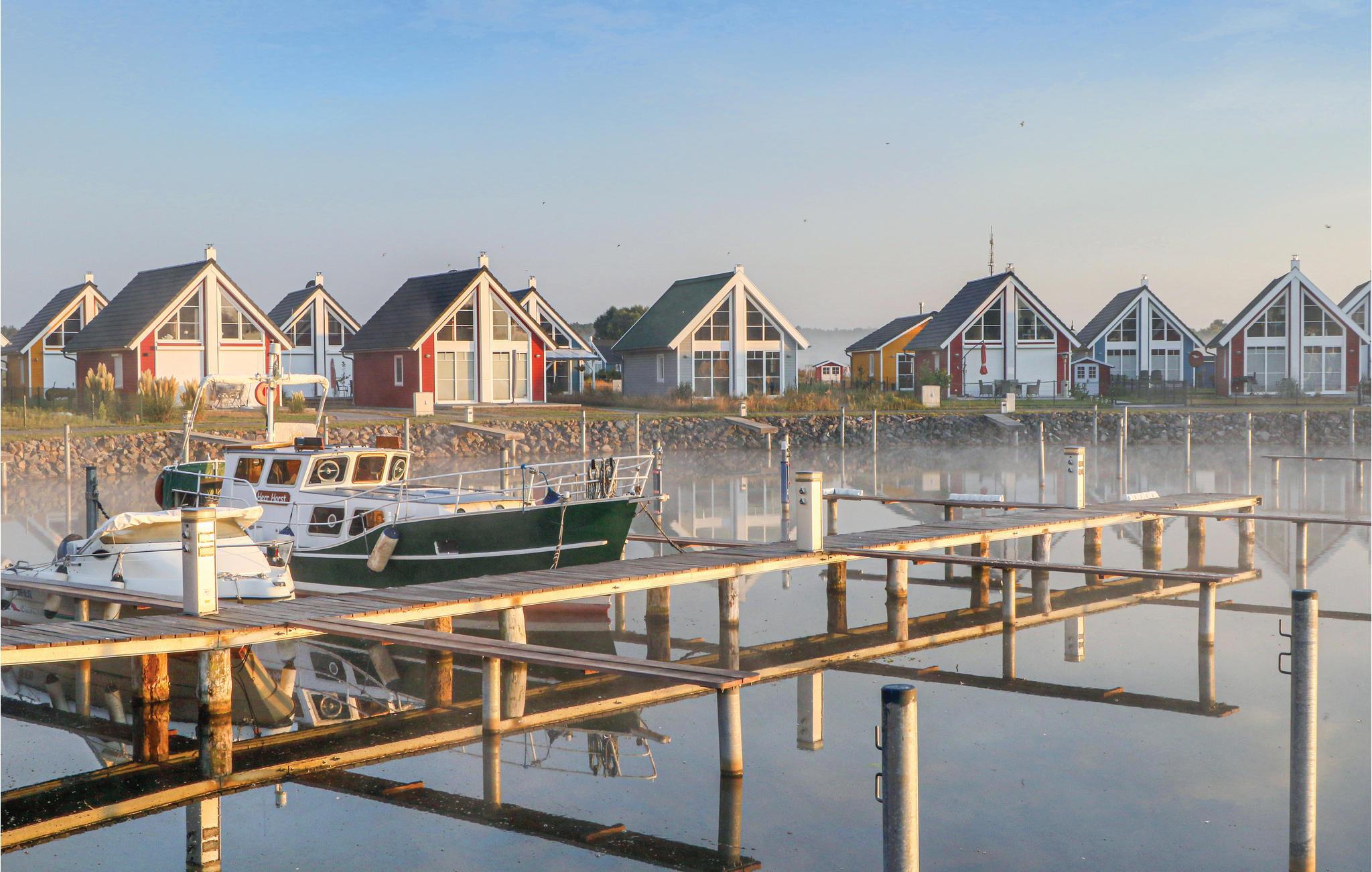 Selv om vinteren er havnelandsbyen Zerpenschleuse alltid verdt et besøk. I feriehuset kan du varme deg opp igjen foran den koselige knitrende ovnen i stuen etter en tur langs den isete innsjøen eller gjennom den snødekte skogen. Du kan også slappe av i velværedusjen i det romslige badet i første etasje. Du kan trygt oppbevare syklene dine i hageskuret. Ved siden av ligger huset DBB453, ideelt hvis du vil tilbringe ferien som en gruppe eller med flere familier.