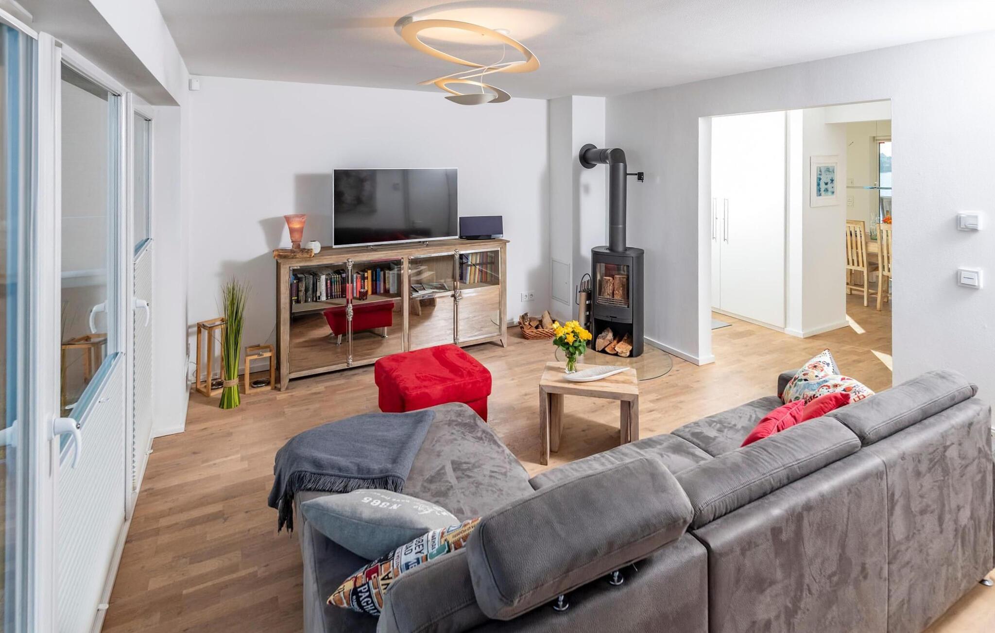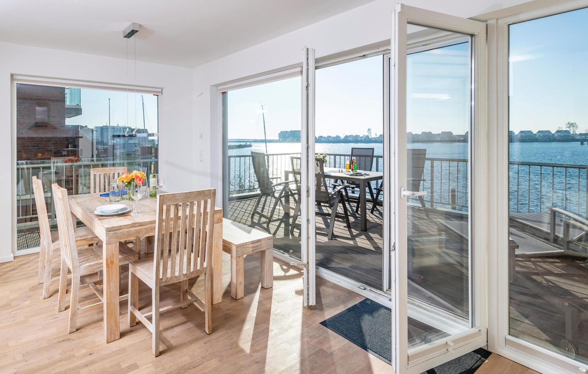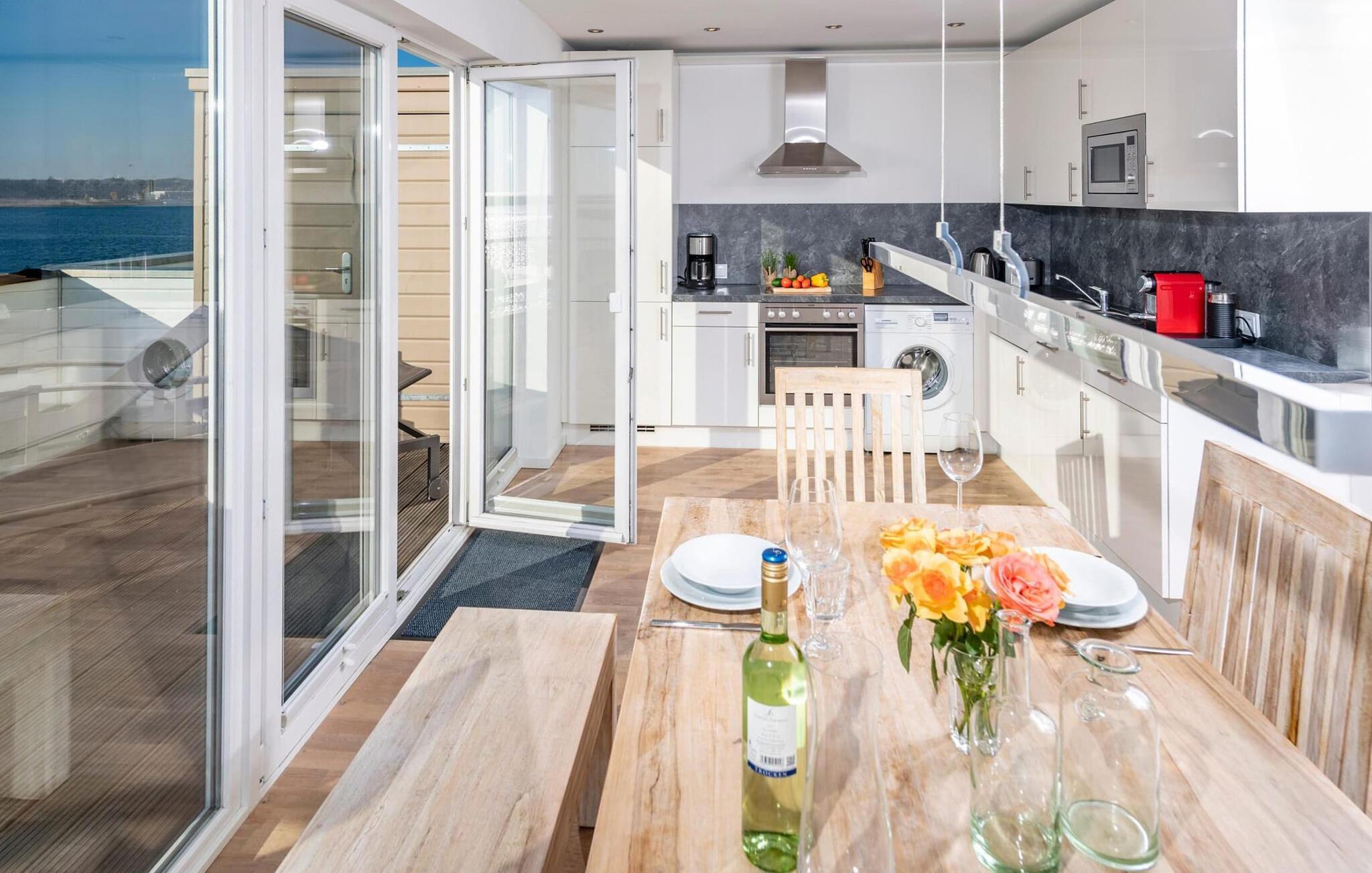 Ferieleiligheten er innredet med svært høy standard og stilfull, moderne innredning. Den tilbyr alt du trenger for en vellykket ferie ved sjøen, med sofistikert innredning på to oppholdsplan. Den åpne stue-/spisestuen i underetasjen med vinduer fra gulv til tak, sittegruppe og spisebord er husets midtpunkt. Her kan du nyte koselige stunder foran vedovnen med vidstrakt utsikt over Schlei og elvemunningen. Måltider som tilberedes sammen i det tilstøtende fullt utstyrte kjøkkenet, kan nytes med full utsikt over havnen.