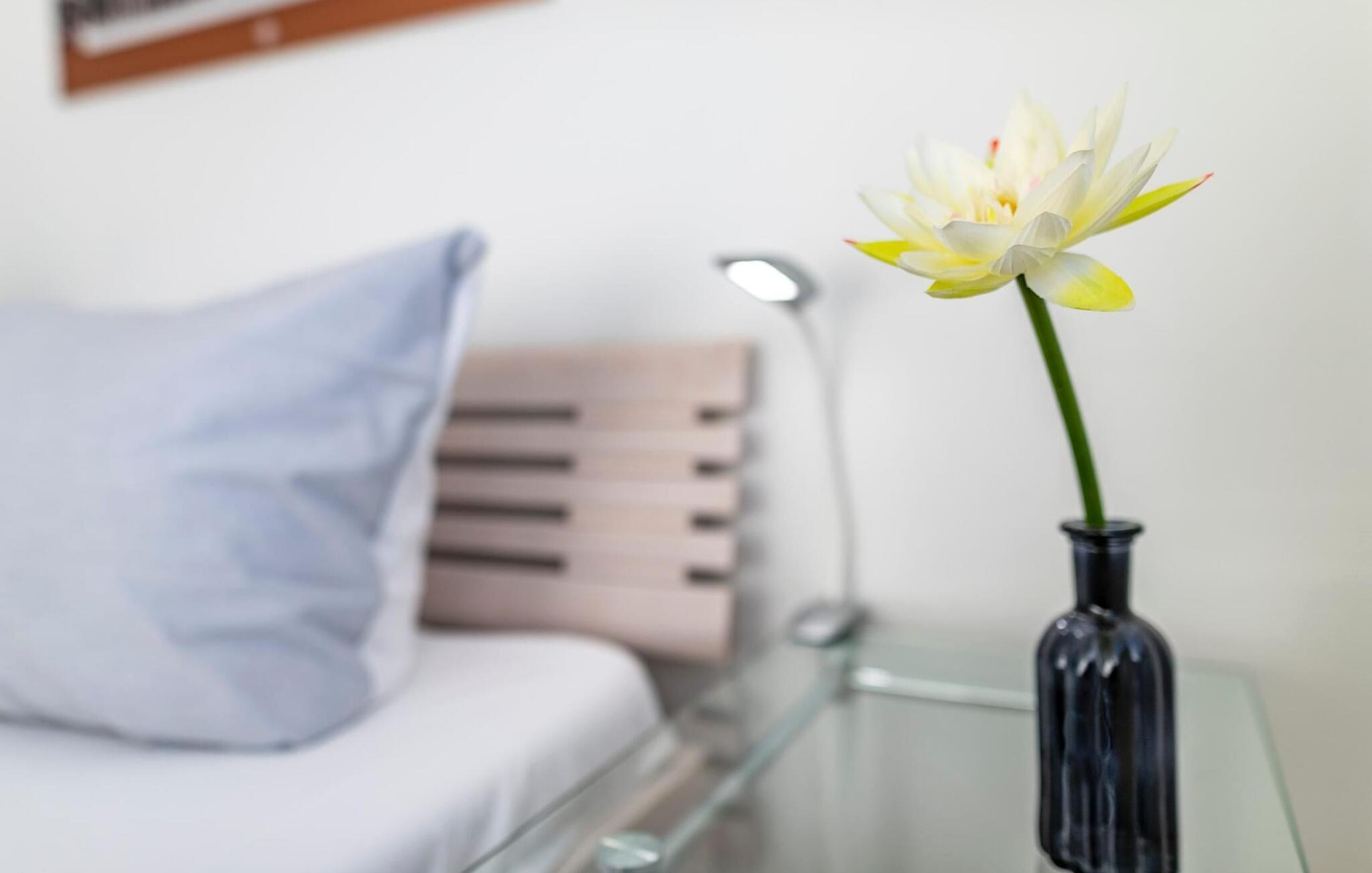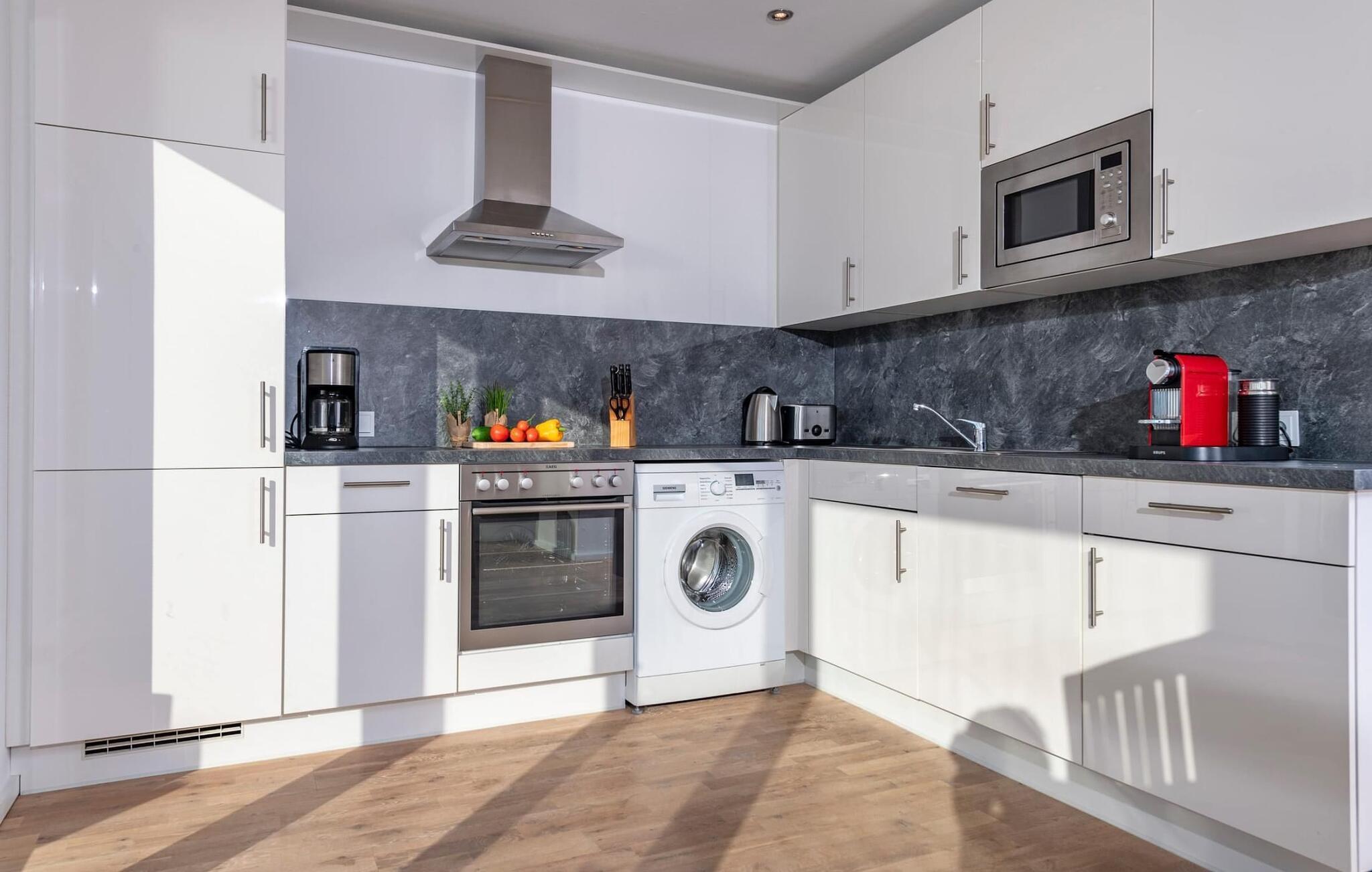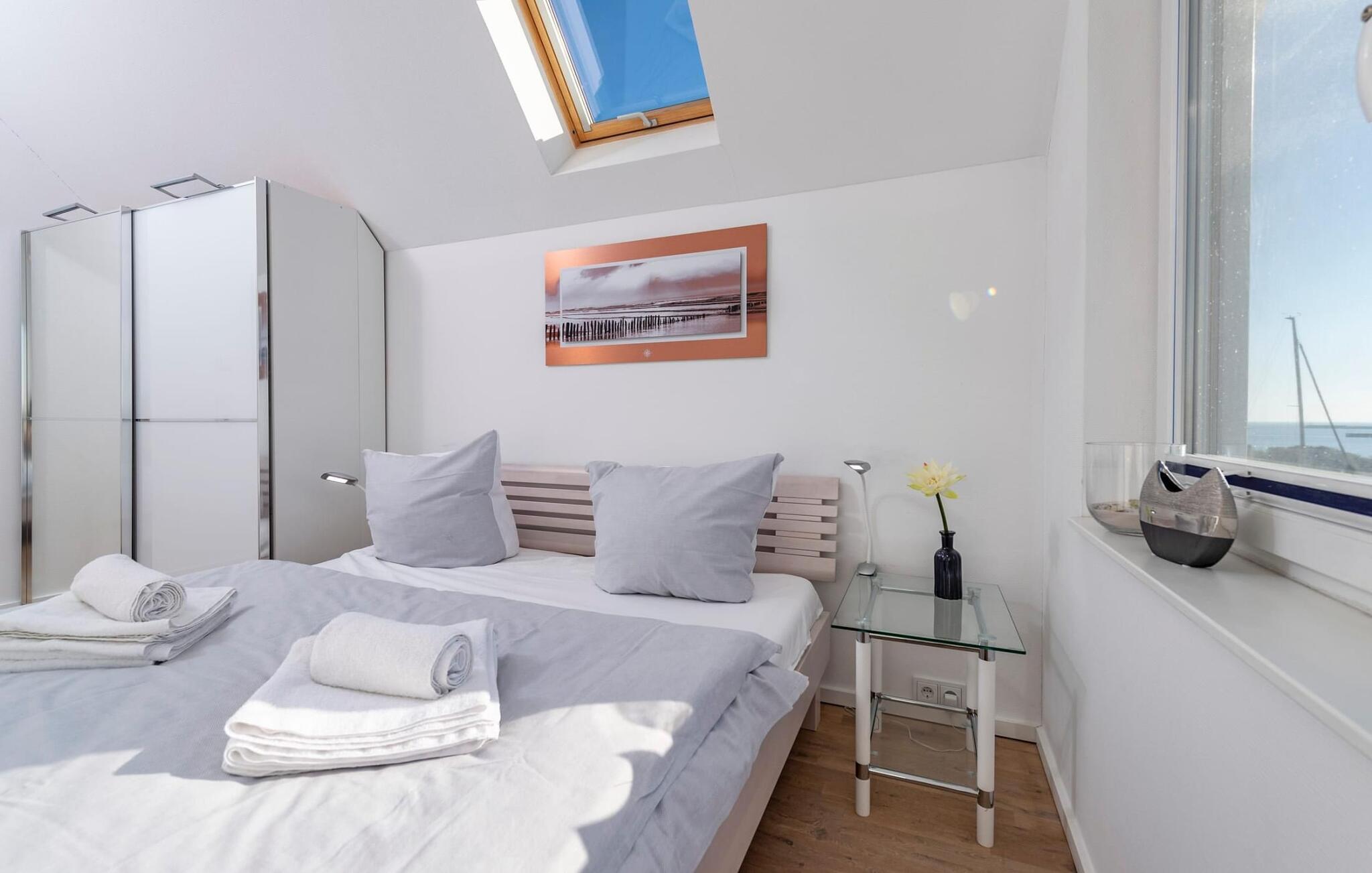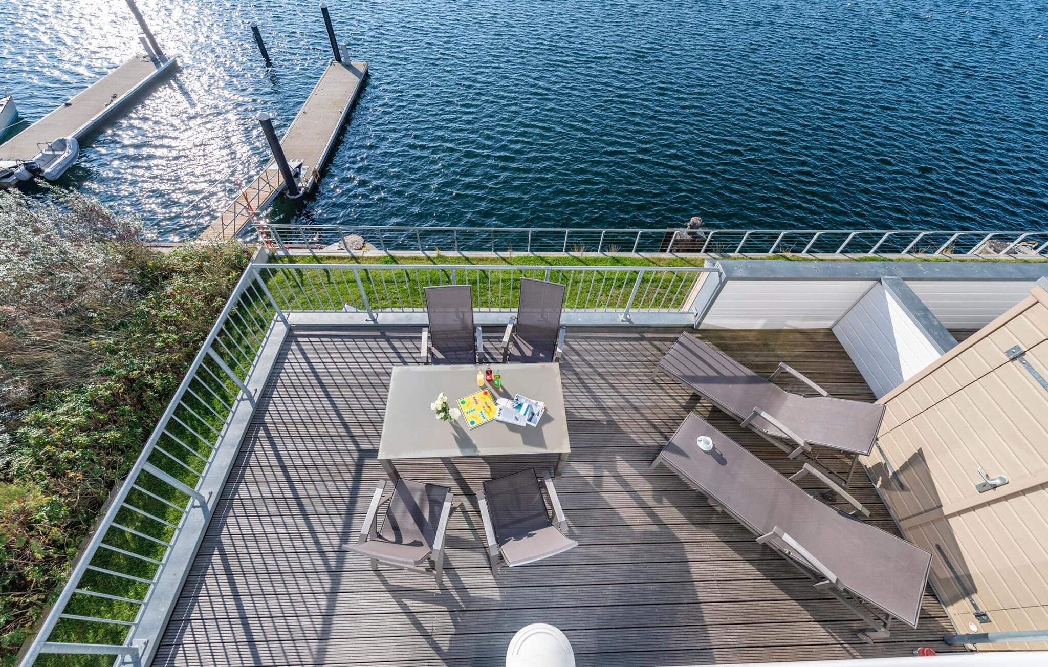 Ferieleiligheten er innredet med svært høy standard og stilfull, moderne innredning. Den tilbyr alt du trenger for en vellykket ferie ved sjøen, med sofistikert innredning på to oppholdsplan. Den åpne stue-/spisestuen i underetasjen med vinduer fra gulv til tak, sittegruppe og spisebord er husets midtpunkt. Her kan du nyte koselige stunder foran vedovnen med vidstrakt utsikt over Schlei og elvemunningen. Måltider som tilberedes sammen i det tilstøtende fullt utstyrte kjøkkenet, kan nytes med full utsikt over havnen.