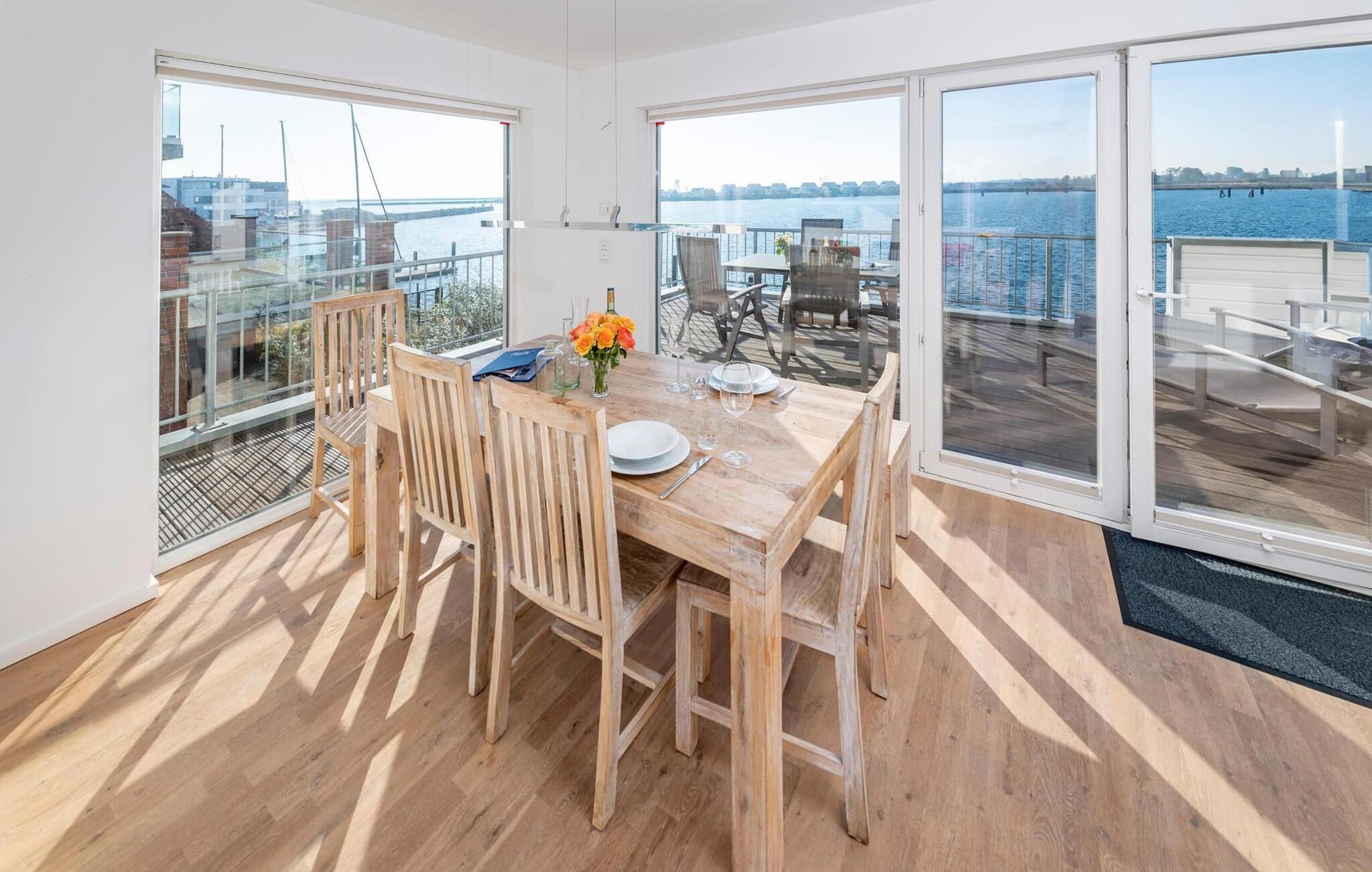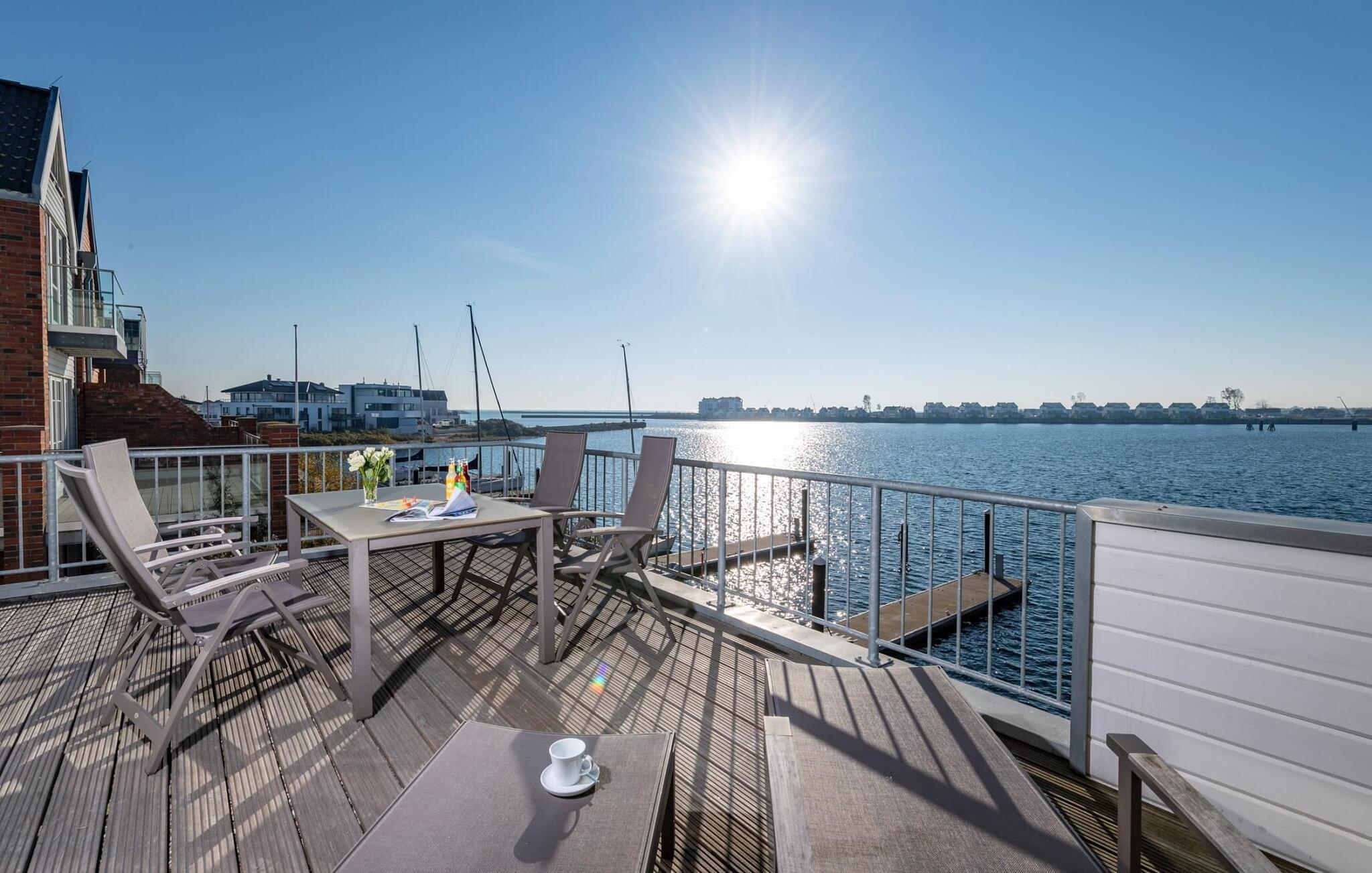 Måltidene kan nytes med full utsikt over havnen. Denne ubegrensede feriefølelsen fortsetter på den tilstøtende terrassen som vender mot sør-sørvest.