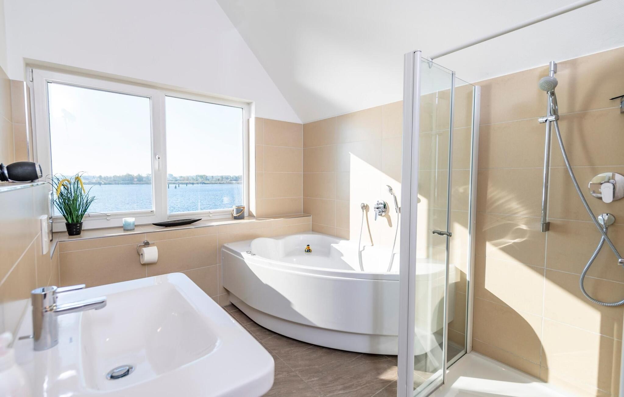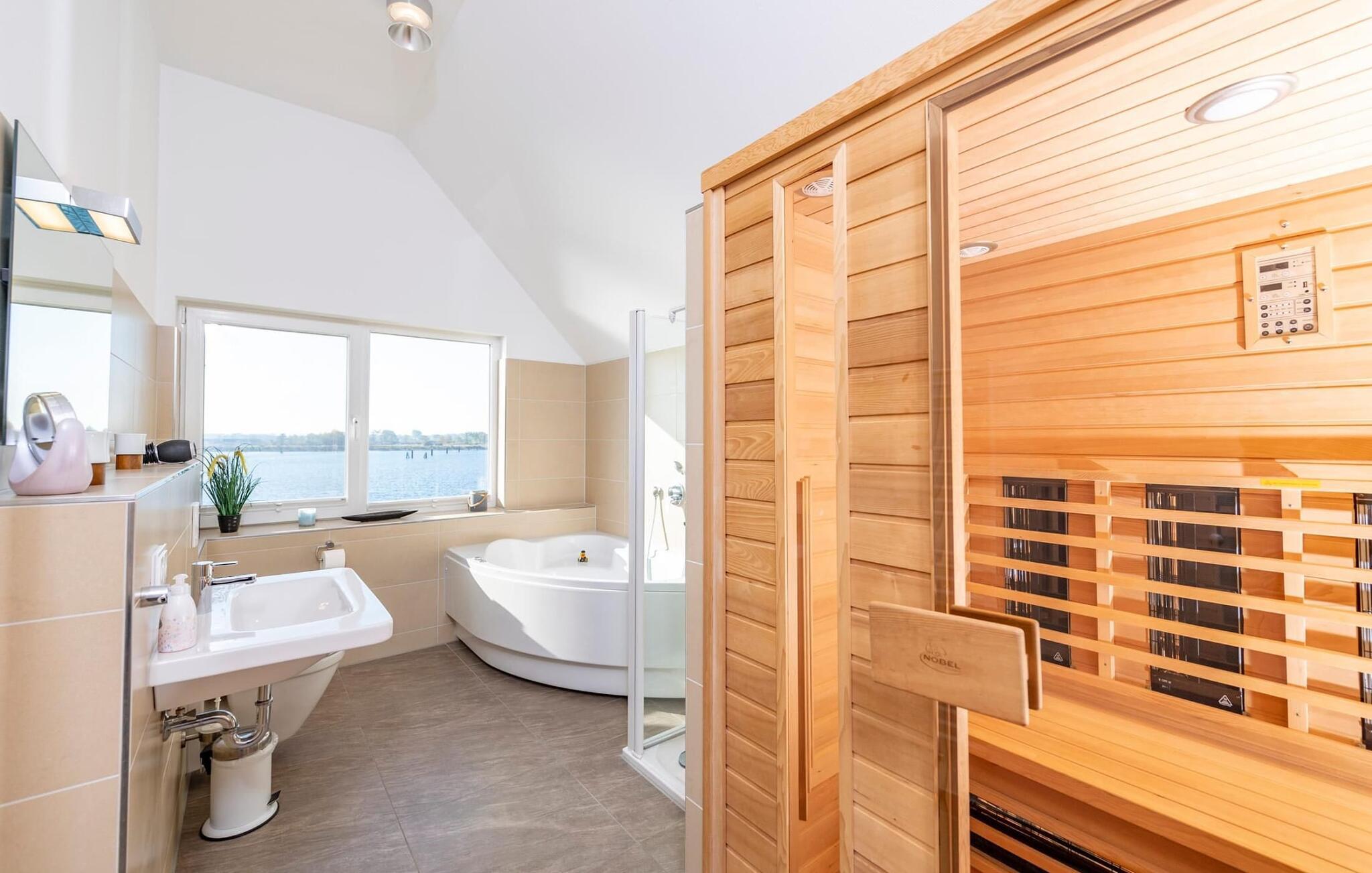 På det romslige hovedbadet er det boblebad, dusj og infrarød badstue (varmekabinett) med lysterapifunksjon med utsikt over havnen.