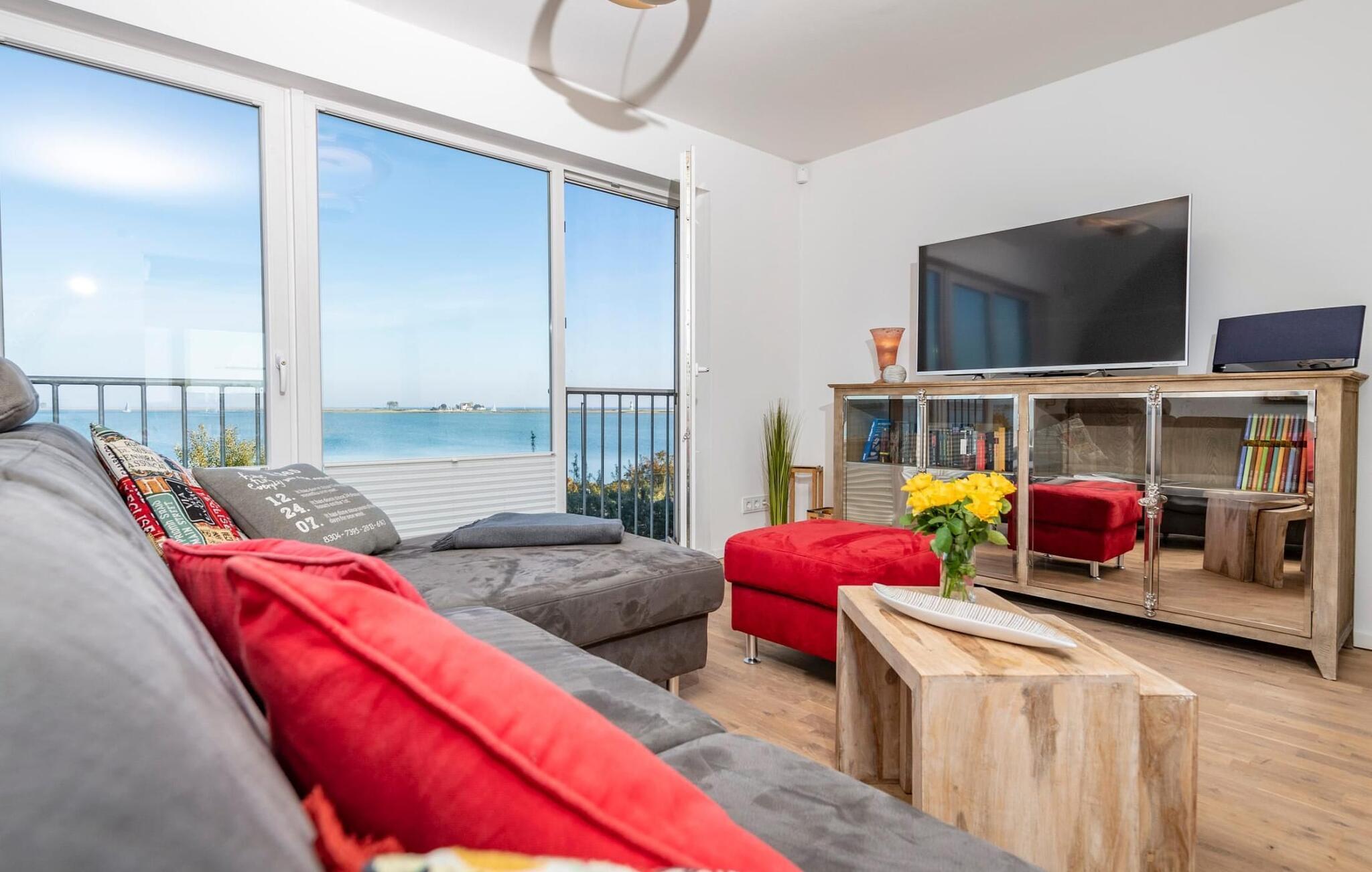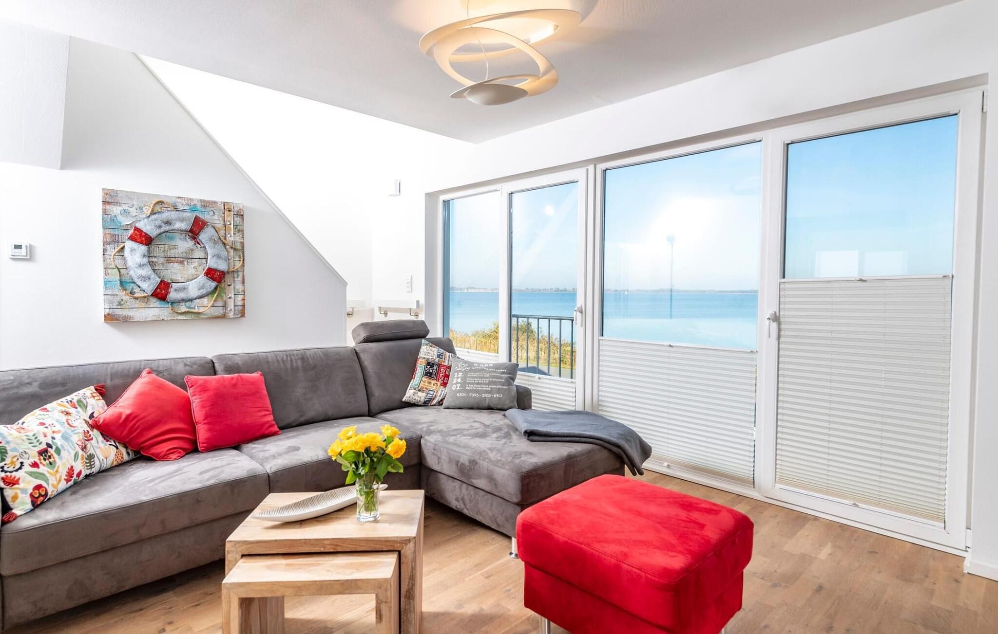 Vårt favorittsted: den komfortable sittegruppen i oppholdsrommet foran vedovnen med vidstrakt utsikt over idylliske Schlei og Schleimünde fyrtårn.