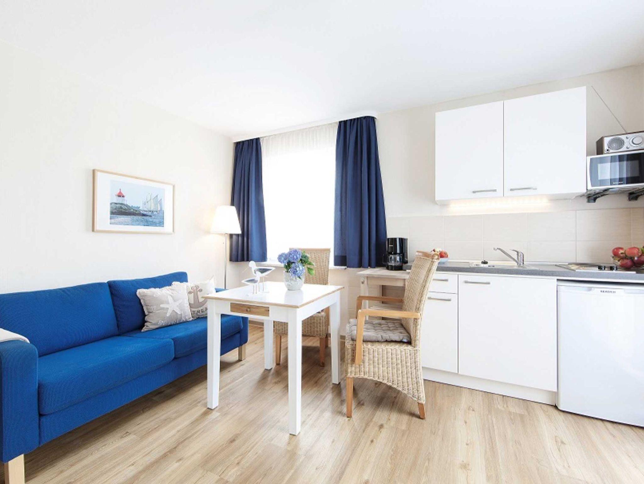 Dieses Appartement im ersten Obergeschoss bietet 2 Personen einen angenehmen Urlaub. Im Wohnzimmer mit integrierter Kochzeile finden unsere Gäste einen Essplatz sowie ein Sofa zum Lesen oder Fernsehen. Ein Schlafzimmer mit zwei Einzelbetten und das Duschbad mit WC ergänzen dieses Appartement (ca. 30 m²). Selbstverständlich gehört auch zu dieser Unterkunft ein Balkon.