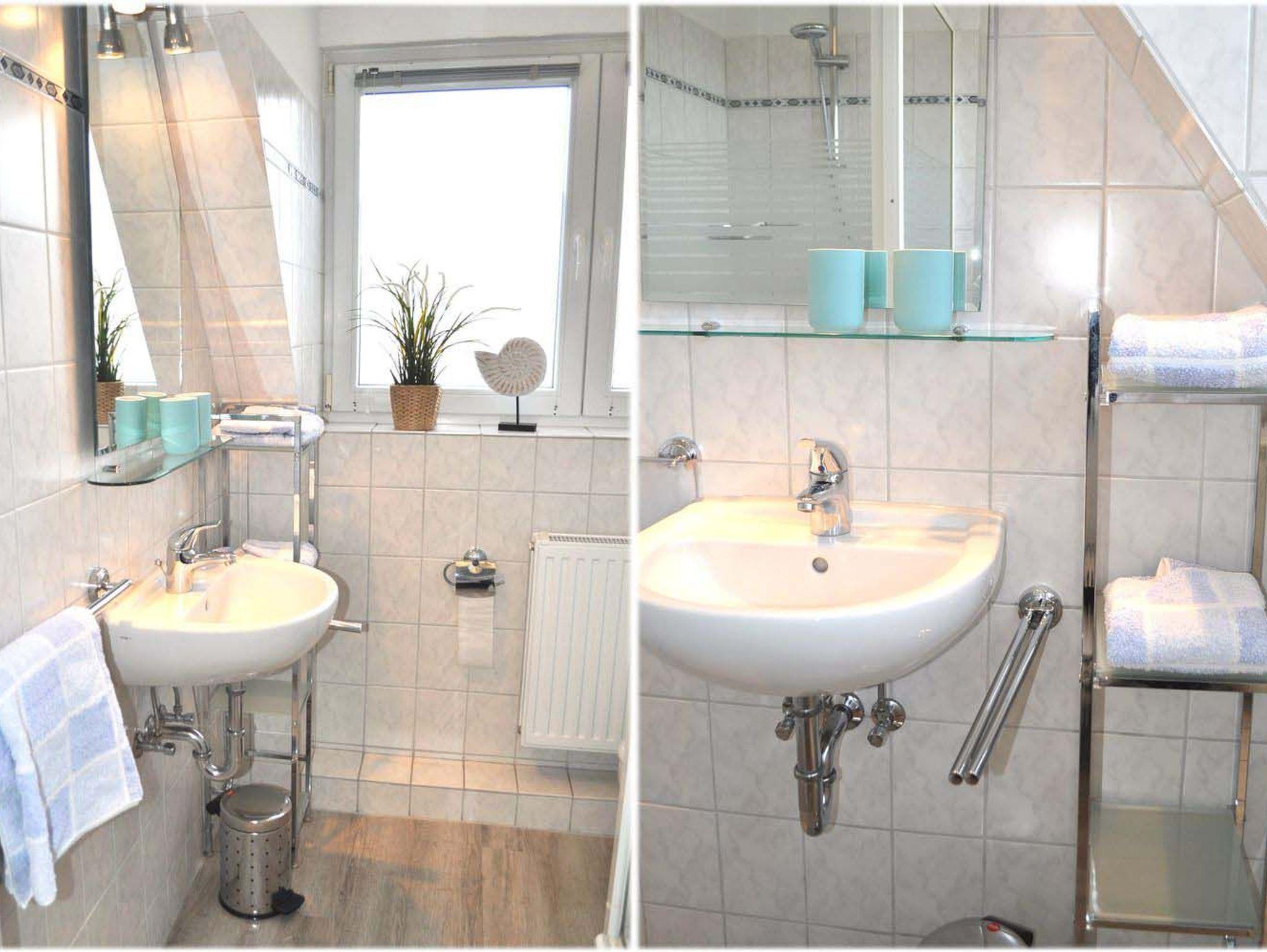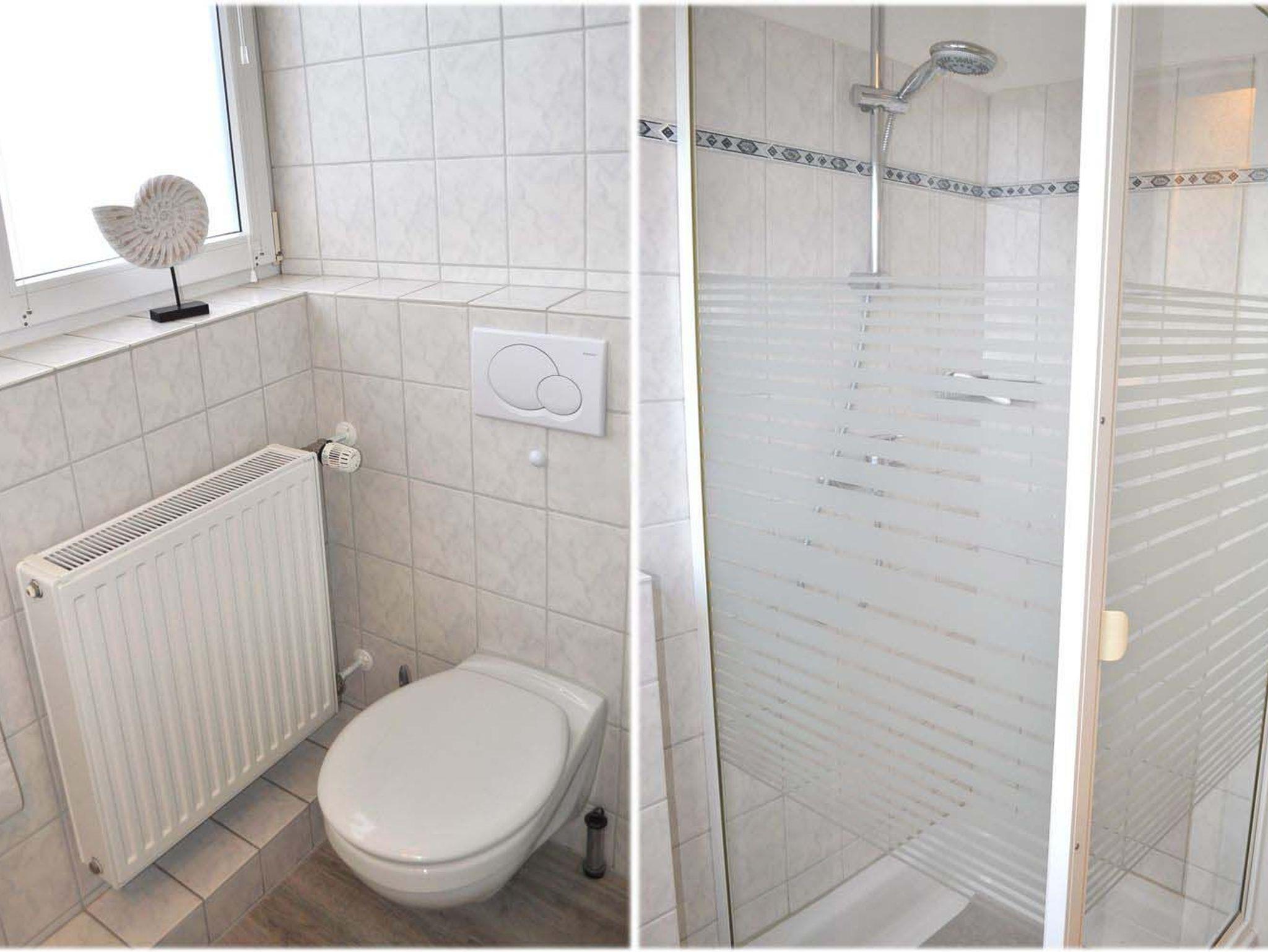 Bad 1: Dusche, Duschkabine, Fön, Regal, Spiegel, Waschbecken, WC
