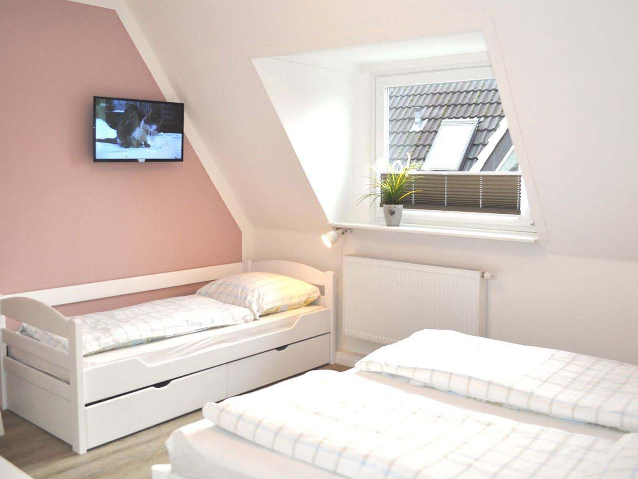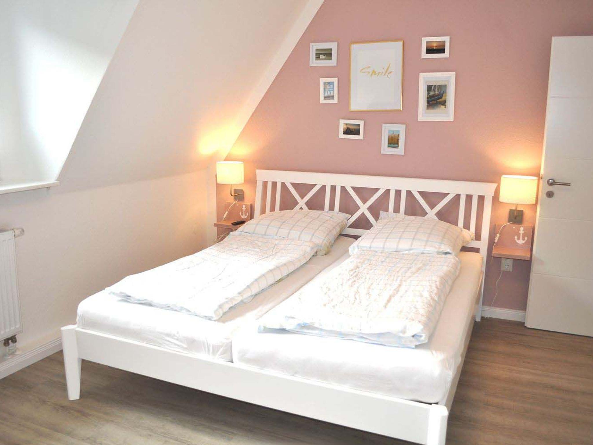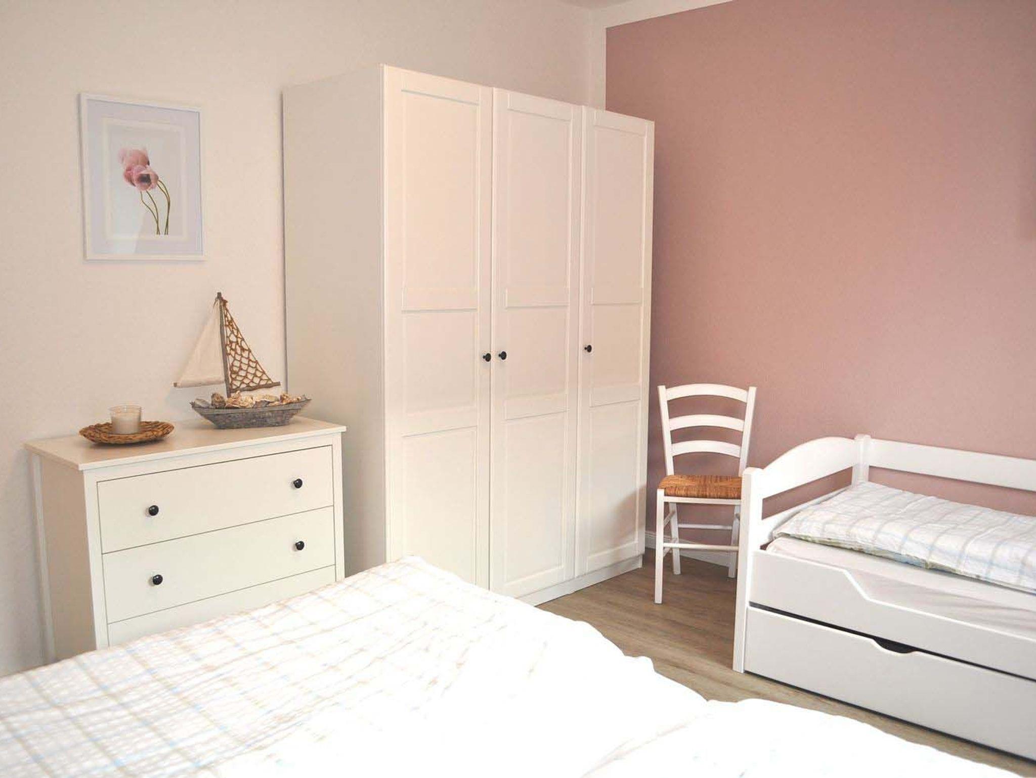 Schlafzimmer 1: 2 Ablagen, 3 Wandlampen, Doppelbett 2,00 x 1,80 m, 2 Matratzen, Einzelbett 2,00 x 0,90 m, Flachbildschirm, Kabel-TV, Kleiderschrank, Kommode, Verdunklungsplissee