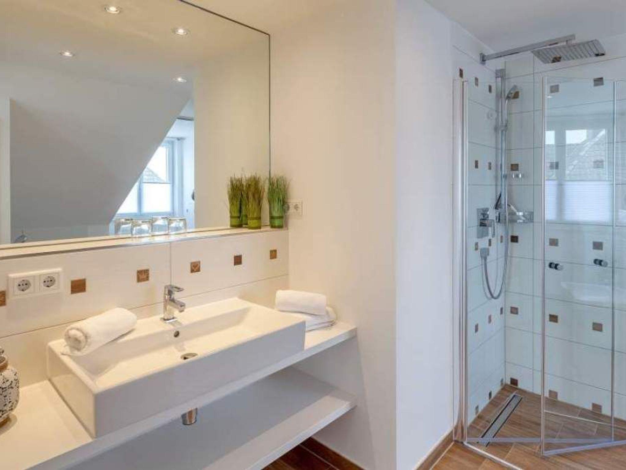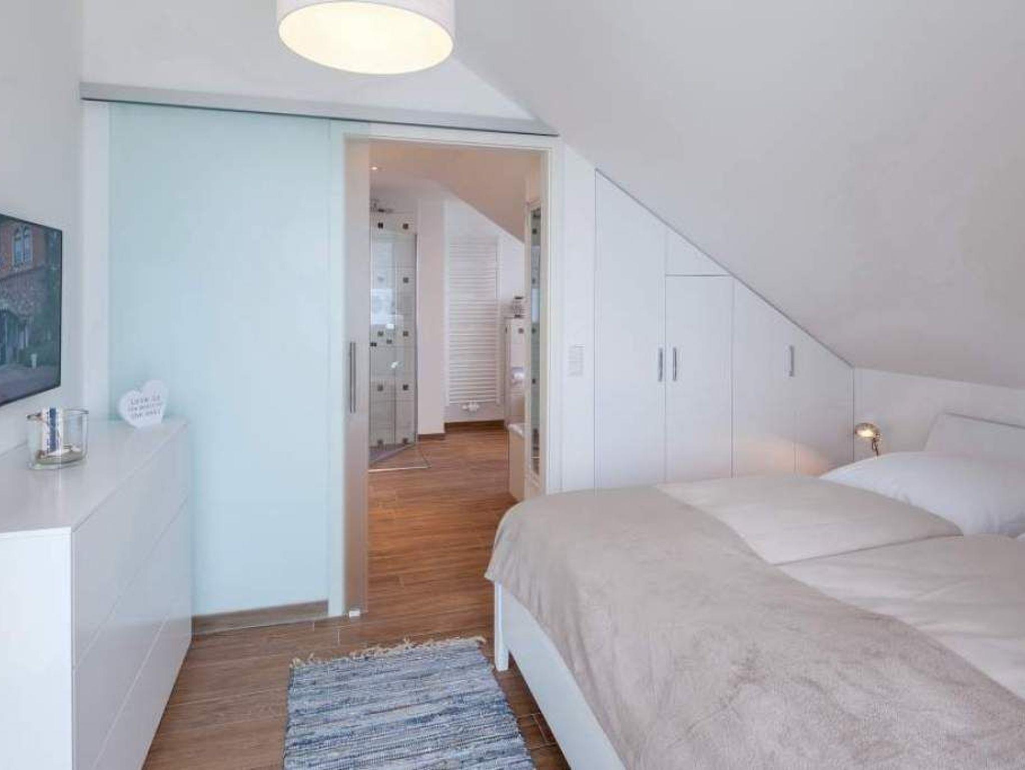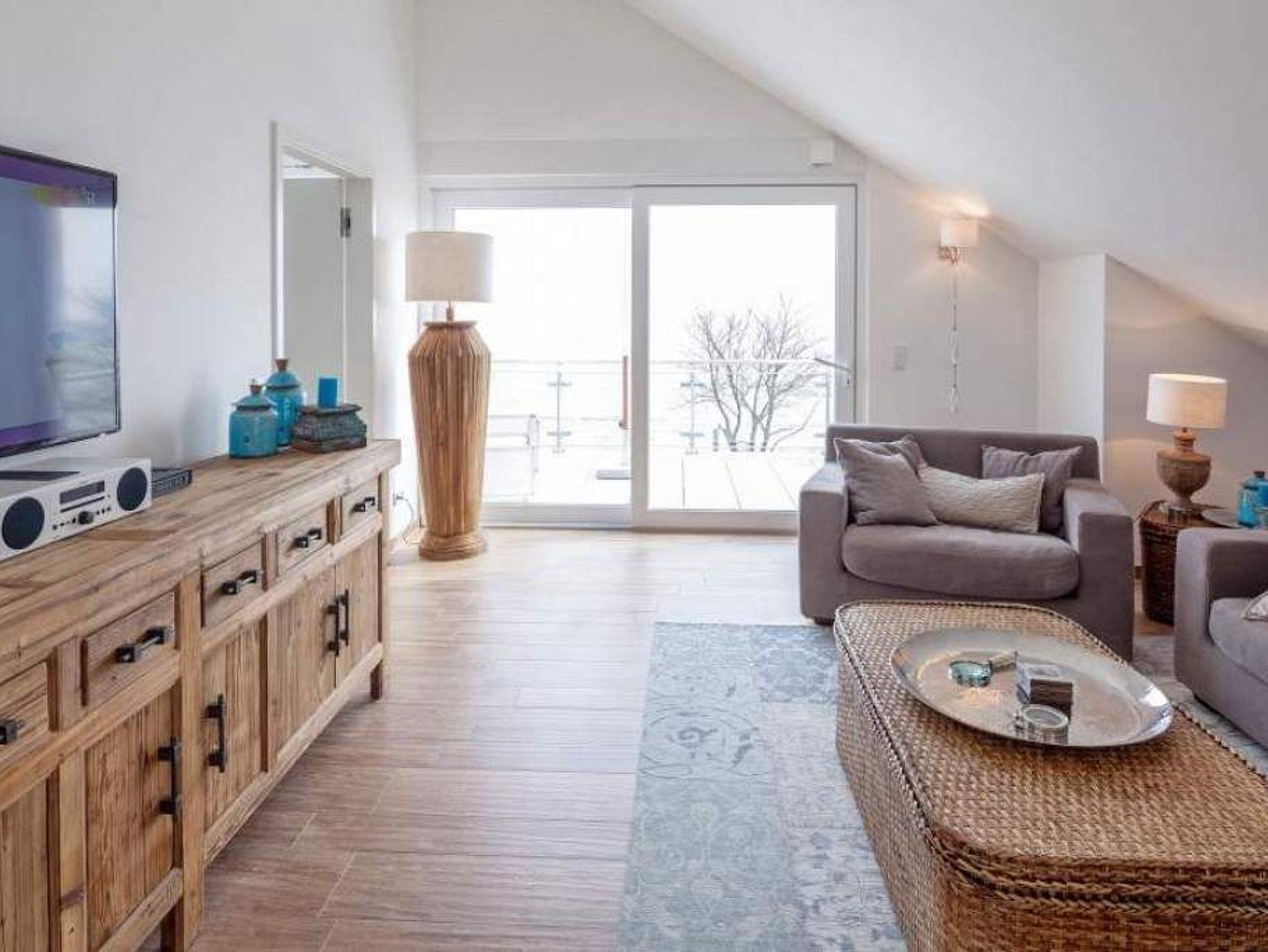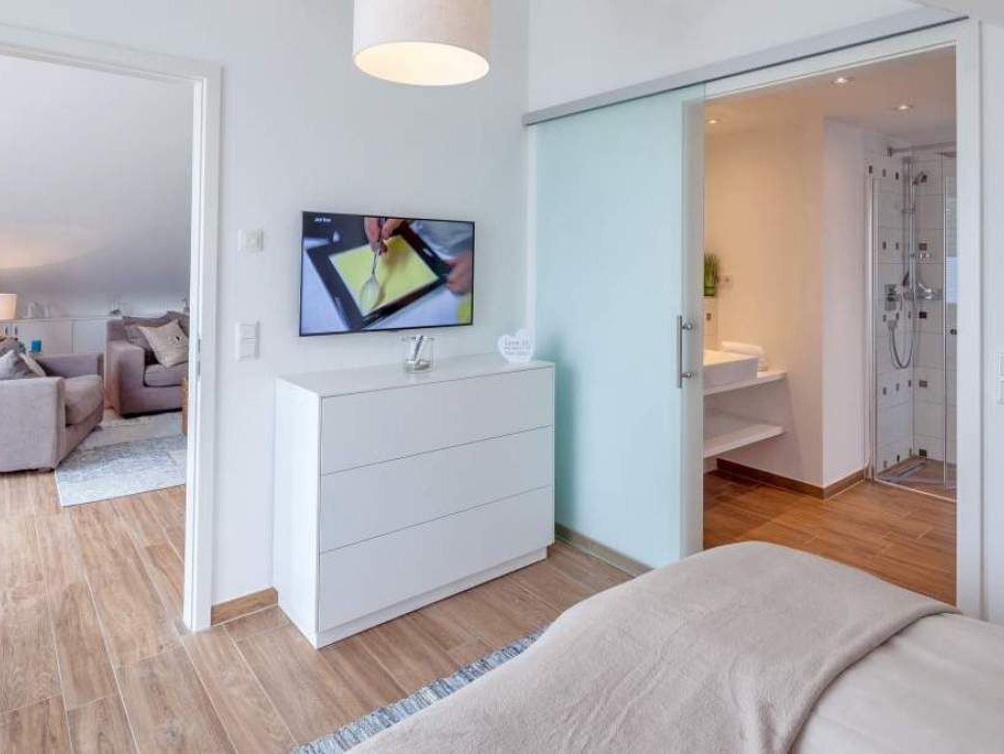 Diese moderne Ferienwohnung ist hochwertig und geschmackvoll eingerichtet. Der Wohnbereich ist mit Blu-ray-Player, CD-Player, Flachbildfernseher und kostenlosem WLAN ausgestattet. Die offene Küche ist komplett eingerichtet und lässt keine Wünsche offen. Beide Schlafzimmer sind mit Doppelbetten (1,60 m x 2,00 m, einzelne Matratzen) und TV-Flachbildschirmen ausgestattet. Zur Verdunkelung sind elektrische Rollläden angebracht. Die beiden Bäder sind mit jeweils einer bodentiefen Dusche ausgestattet. In einem der Bäder befindet sich zusätzlich eine Badewanne. Im kleineren Bad steht Ihnen eine Waschmaschine zur Verfügung. Ein Föhn, Handtuchheizkörper, Kosmetikspiegel und Fußbodenheizung sind selbstverständlich. Die Dachterrassen sind mit einer Sonneninsel, Tisch und Stühlen, 2 Sonnenliegen sowie einem Sonnenschutz ausgestattet.