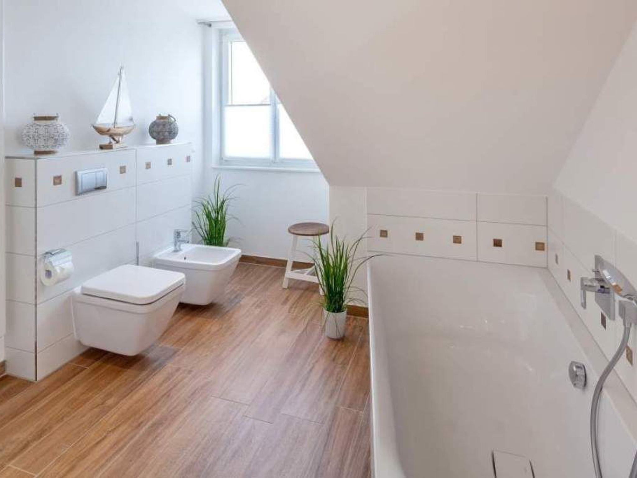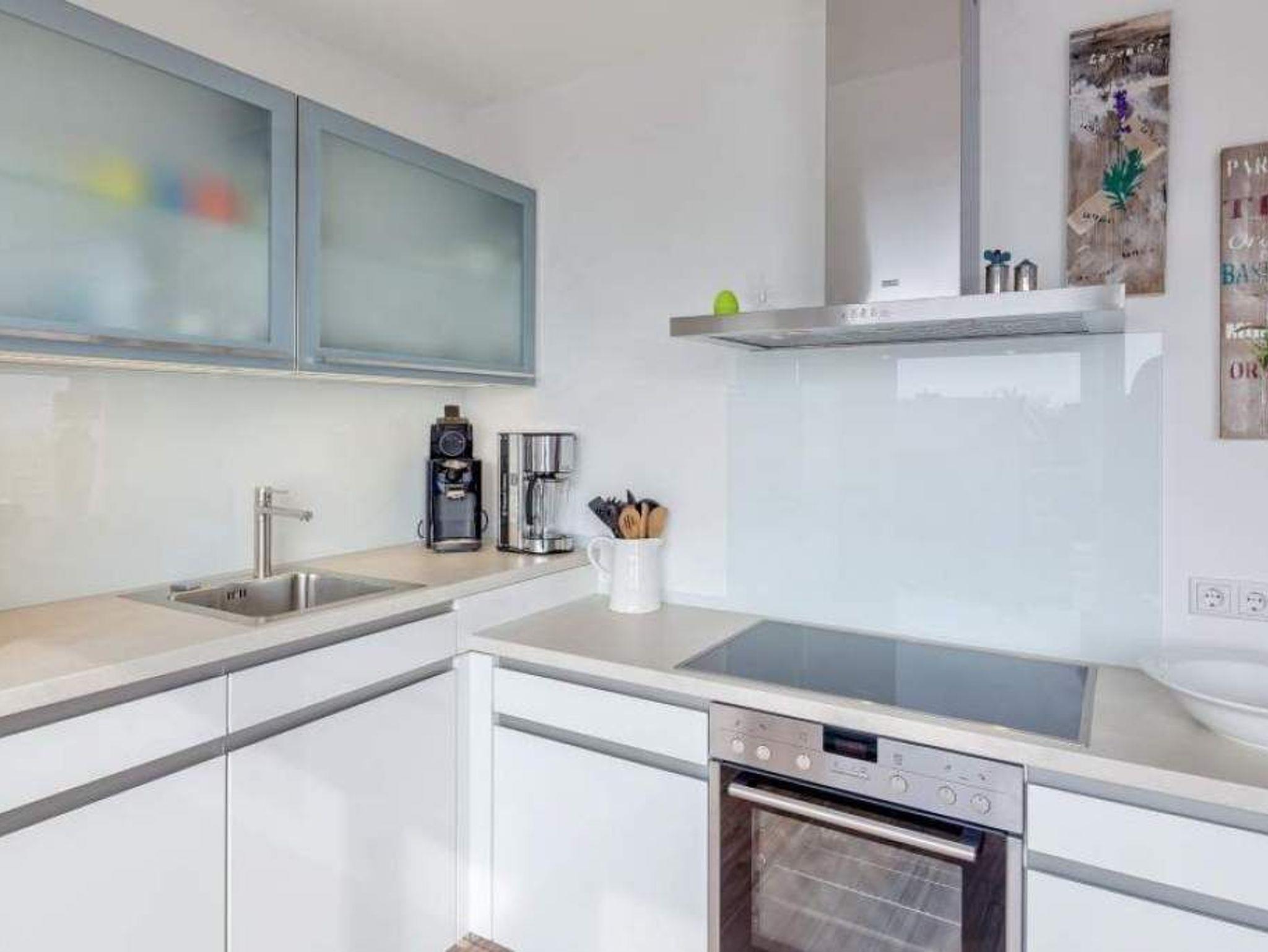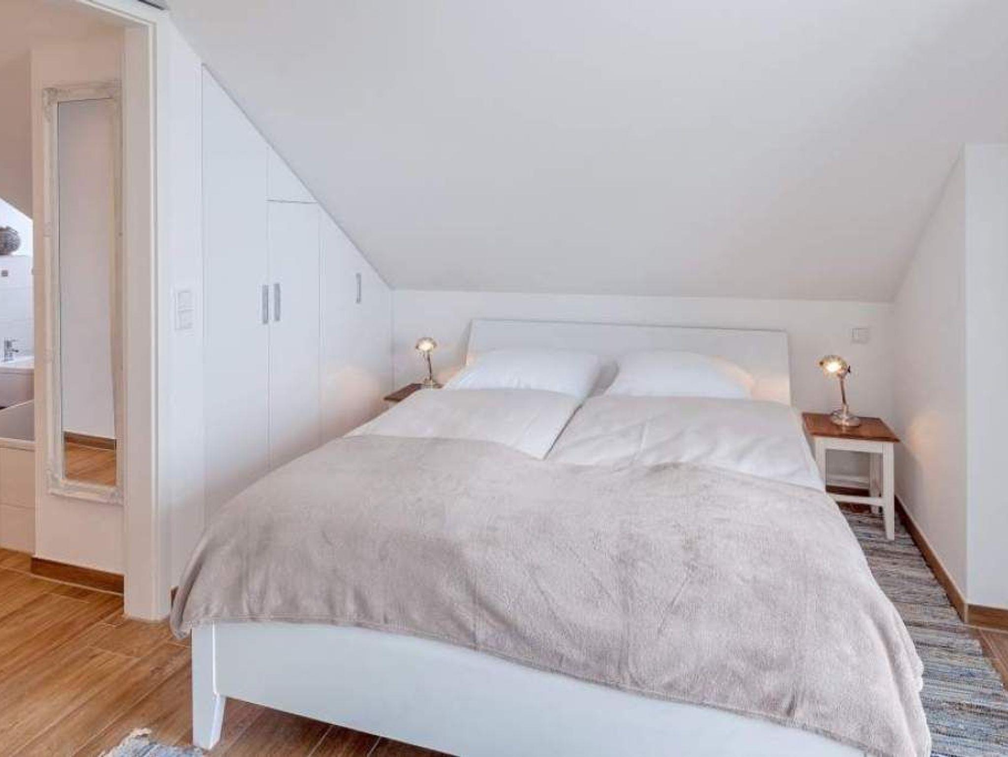 Diese moderne Ferienwohnung ist hochwertig und geschmackvoll eingerichtet. Der Wohnbereich ist mit Blu-ray-Player, CD-Player, Flachbildfernseher und kostenlosem WLAN ausgestattet. Die offene Küche ist komplett eingerichtet und lässt keine Wünsche offen. Beide Schlafzimmer sind mit Doppelbetten (1,60 m x 2,00 m, einzelne Matratzen) und TV-Flachbildschirmen ausgestattet. Zur Verdunkelung sind elektrische Rollläden angebracht. Die beiden Bäder sind mit jeweils einer bodentiefen Dusche ausgestattet. In einem der Bäder befindet sich zusätzlich eine Badewanne. Im kleineren Bad steht Ihnen eine Waschmaschine zur Verfügung. Ein Föhn, Handtuchheizkörper, Kosmetikspiegel und Fußbodenheizung sind selbstverständlich. Die Dachterrassen sind mit einer Sonneninsel, Tisch und Stühlen, 2 Sonnenliegen sowie einem Sonnenschutz ausgestattet.