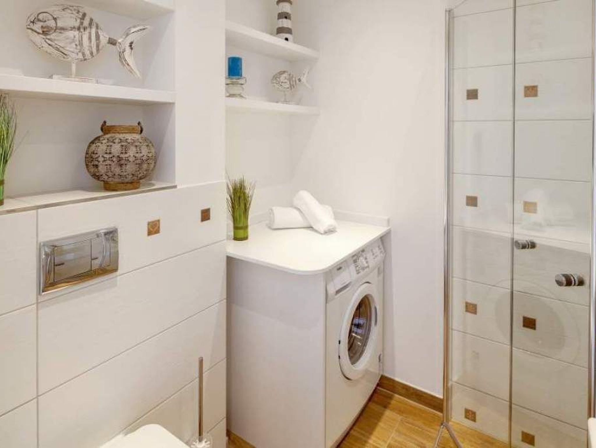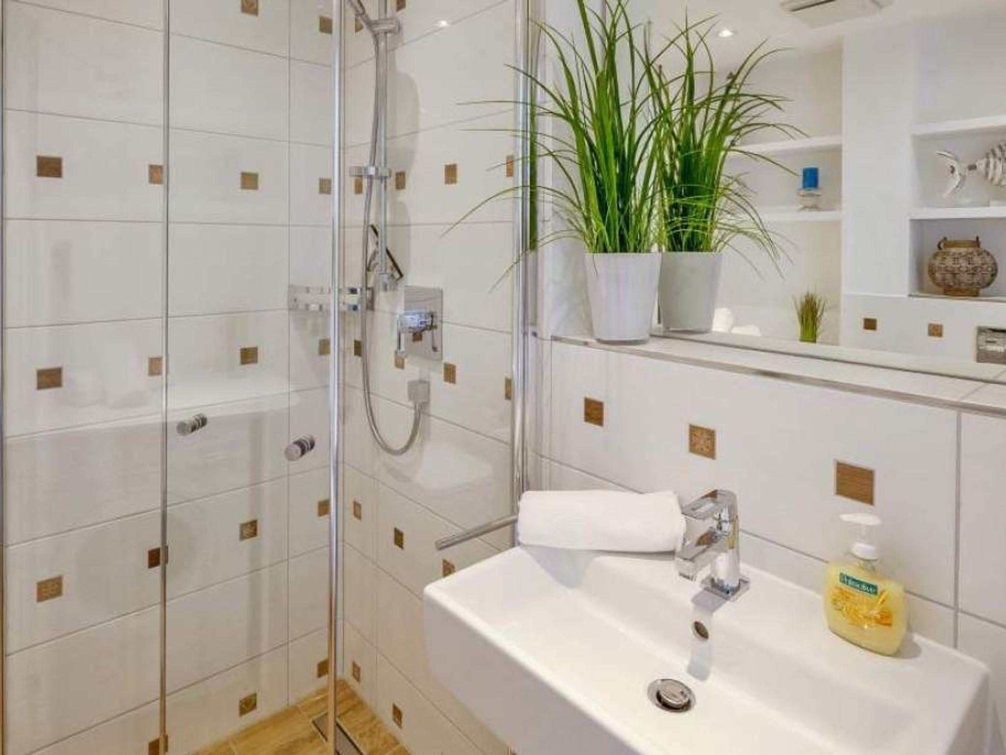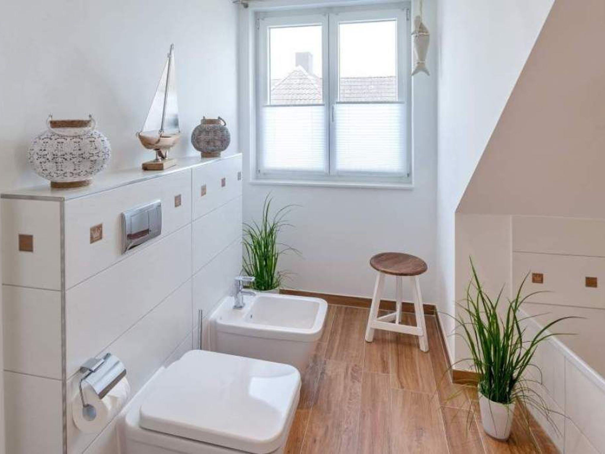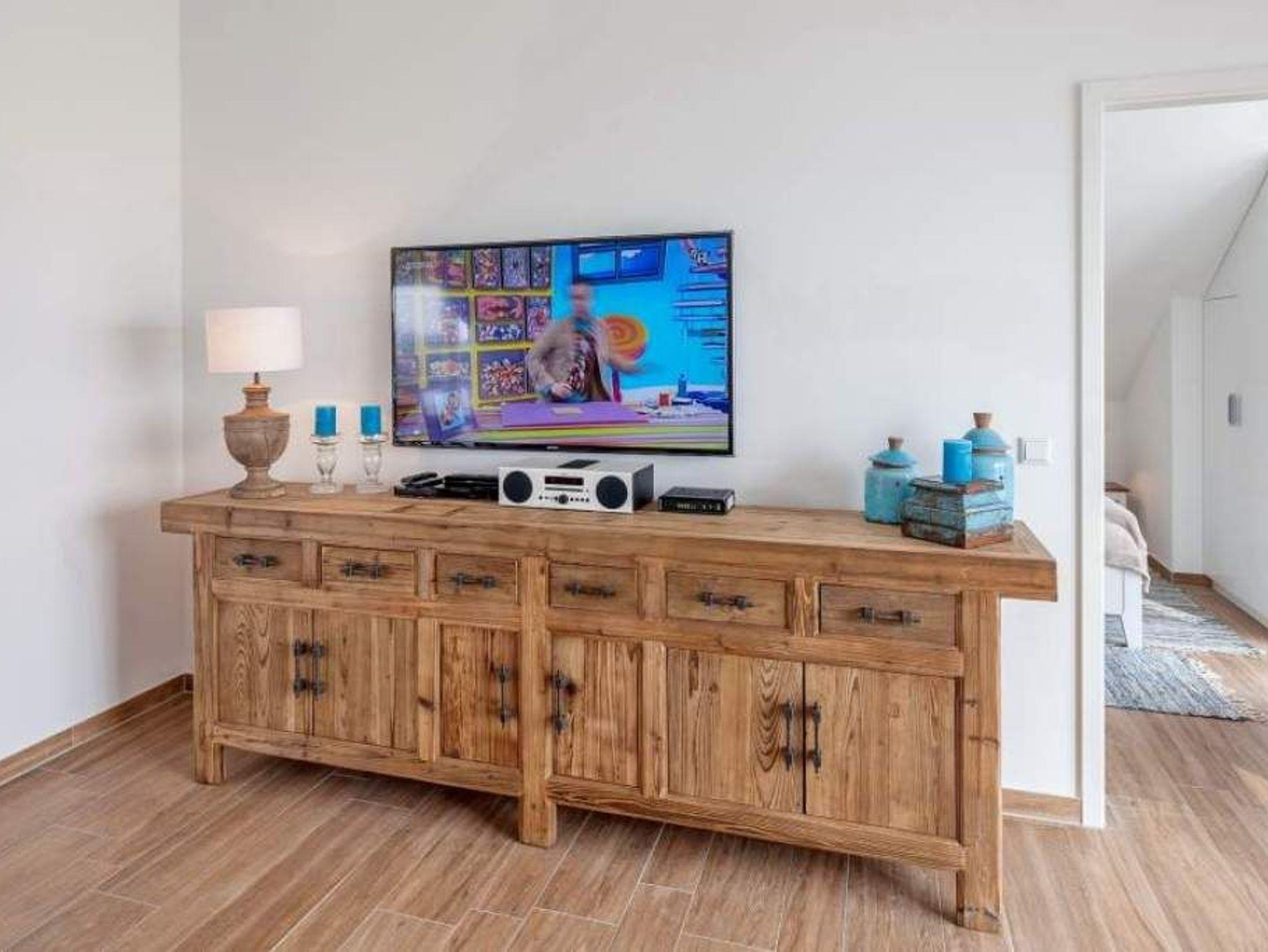 Diese moderne Ferienwohnung ist hochwertig und geschmackvoll eingerichtet. Der Wohnbereich ist mit Blu-ray-Player, CD-Player, Flachbildfernseher und kostenlosem WLAN ausgestattet. Die offene Küche ist komplett eingerichtet und lässt keine Wünsche offen. Beide Schlafzimmer sind mit Doppelbetten (1,60 m x 2,00 m, einzelne Matratzen) und TV-Flachbildschirmen ausgestattet. Zur Verdunkelung sind elektrische Rollläden angebracht. Die beiden Bäder sind mit jeweils einer bodentiefen Dusche ausgestattet. In einem der Bäder befindet sich zusätzlich eine Badewanne. Im kleineren Bad steht Ihnen eine Waschmaschine zur Verfügung. Ein Föhn, Handtuchheizkörper, Kosmetikspiegel und Fußbodenheizung sind selbstverständlich. Die Dachterrassen sind mit einer Sonneninsel, Tisch und Stühlen, 2 Sonnenliegen sowie einem Sonnenschutz ausgestattet.