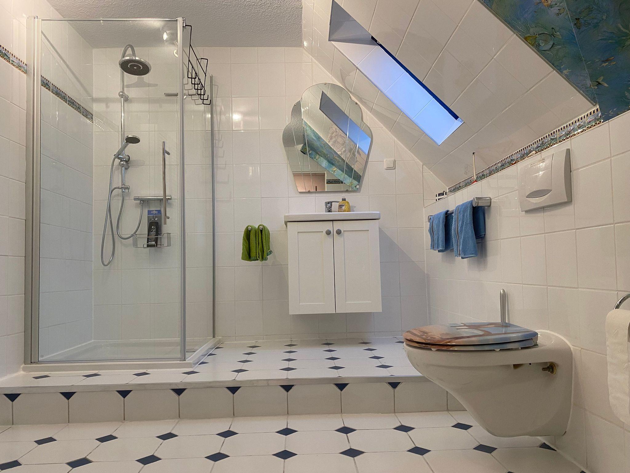 Die Dachwohnung befindet sich im 1. Stock mit einem schönen Ausblick auf den Garten. Das Wohnzimmer verfügt über eine Fernsehecke mit 55 Zoll TV, einem Essbereich und einer Schlafcouch im vorderen Bereich, worüber man auf die Loggia gelangen kann. Die Küche verfügt über eine Spülmaschine, Kaffeemaschine, Kühlschrank mit Gefrierfach, Wasserkocher, u v. m. Im großen Schlafzimmer befindet sich ein Doppelbett (200x180 cm) und im kleineren Schlafzimmer ein französisches Bett (200x140 cm). Das Bad ist mit Dusche, WC und einem Waschtisch ausgestattet.