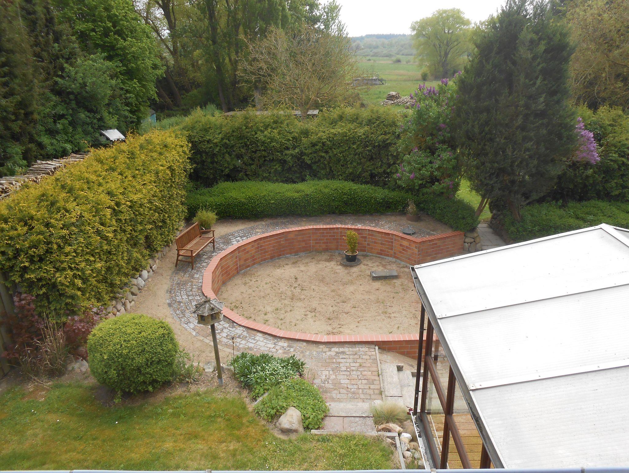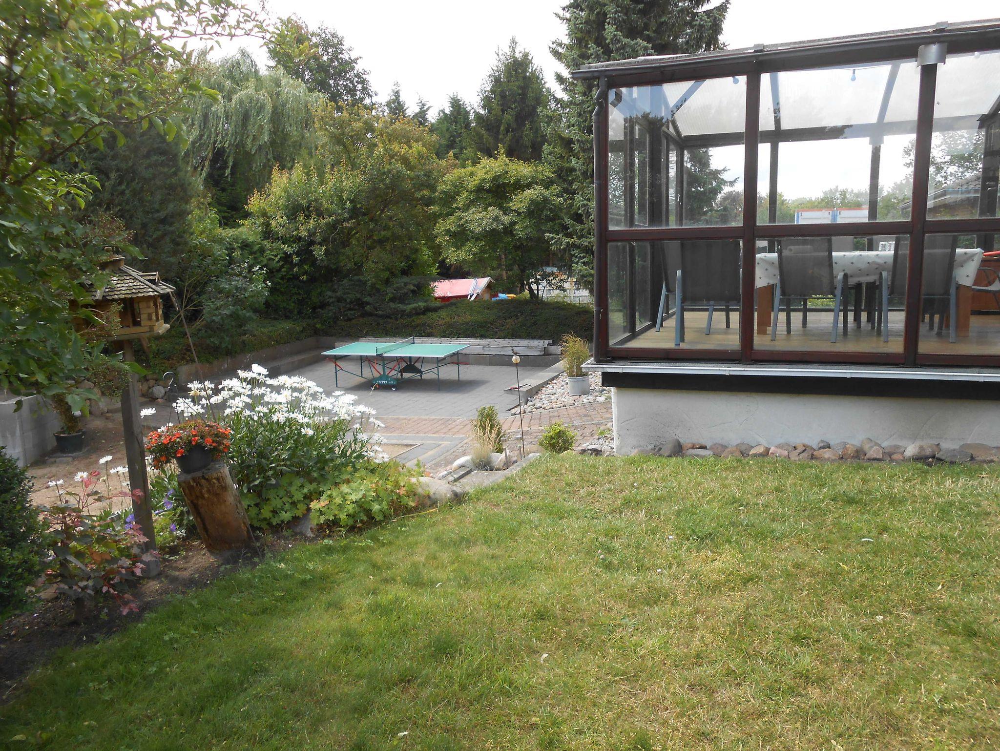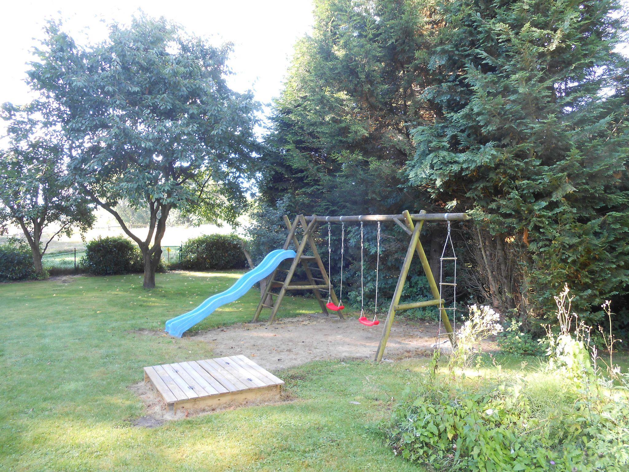 Ein Kinderspielplatz mit Schaukel und Sandkiste befindet sich im hinteren Teil des Gartens, wo auch ein Auto oder die Fahrräder im Carport stehen können.