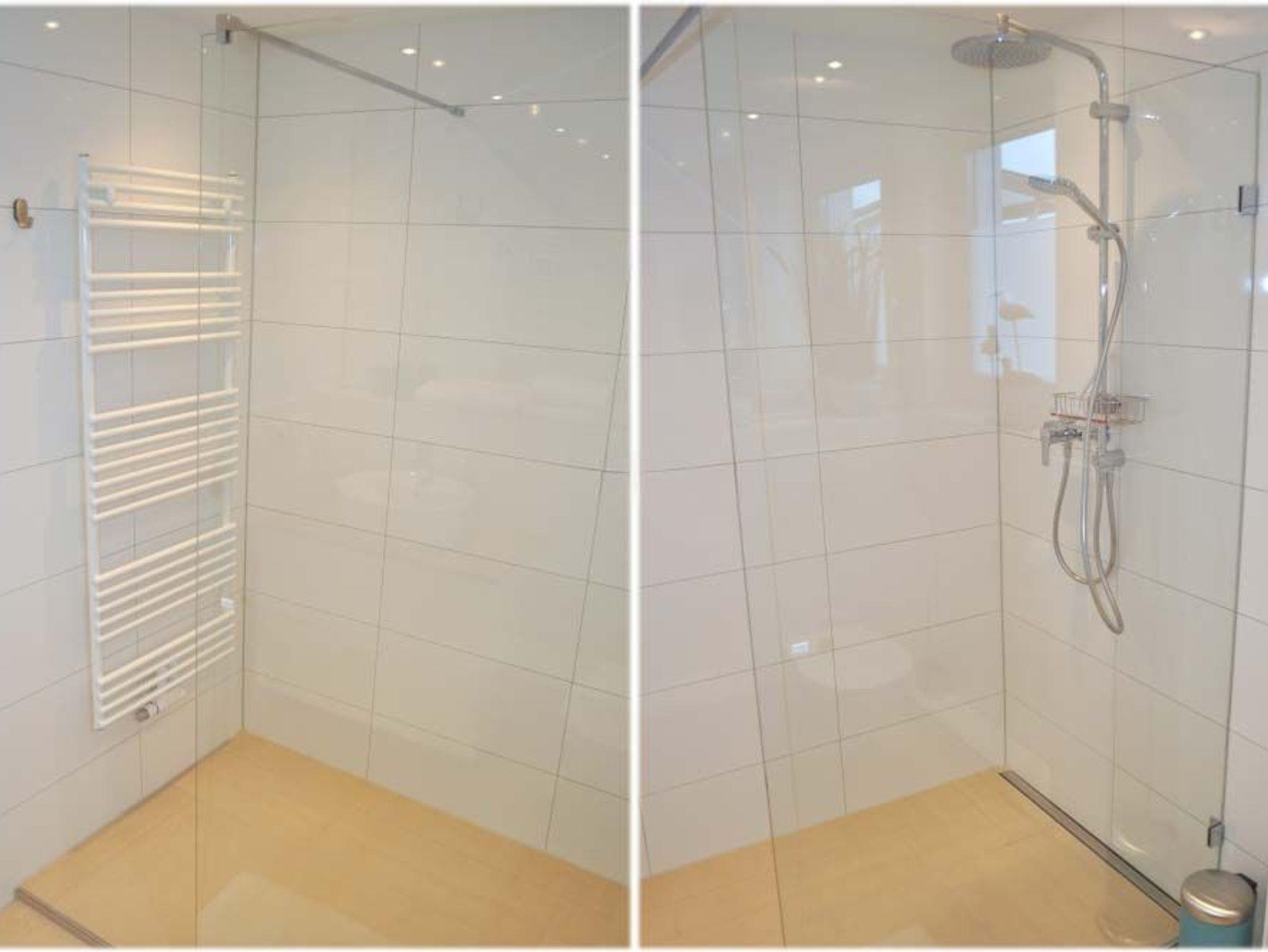 Bad 1: Dusche bodengleich, Fön, Glastrennwand, Radio, Regendusche, Spiegel, Waschtisch mit Unterschrank, WC