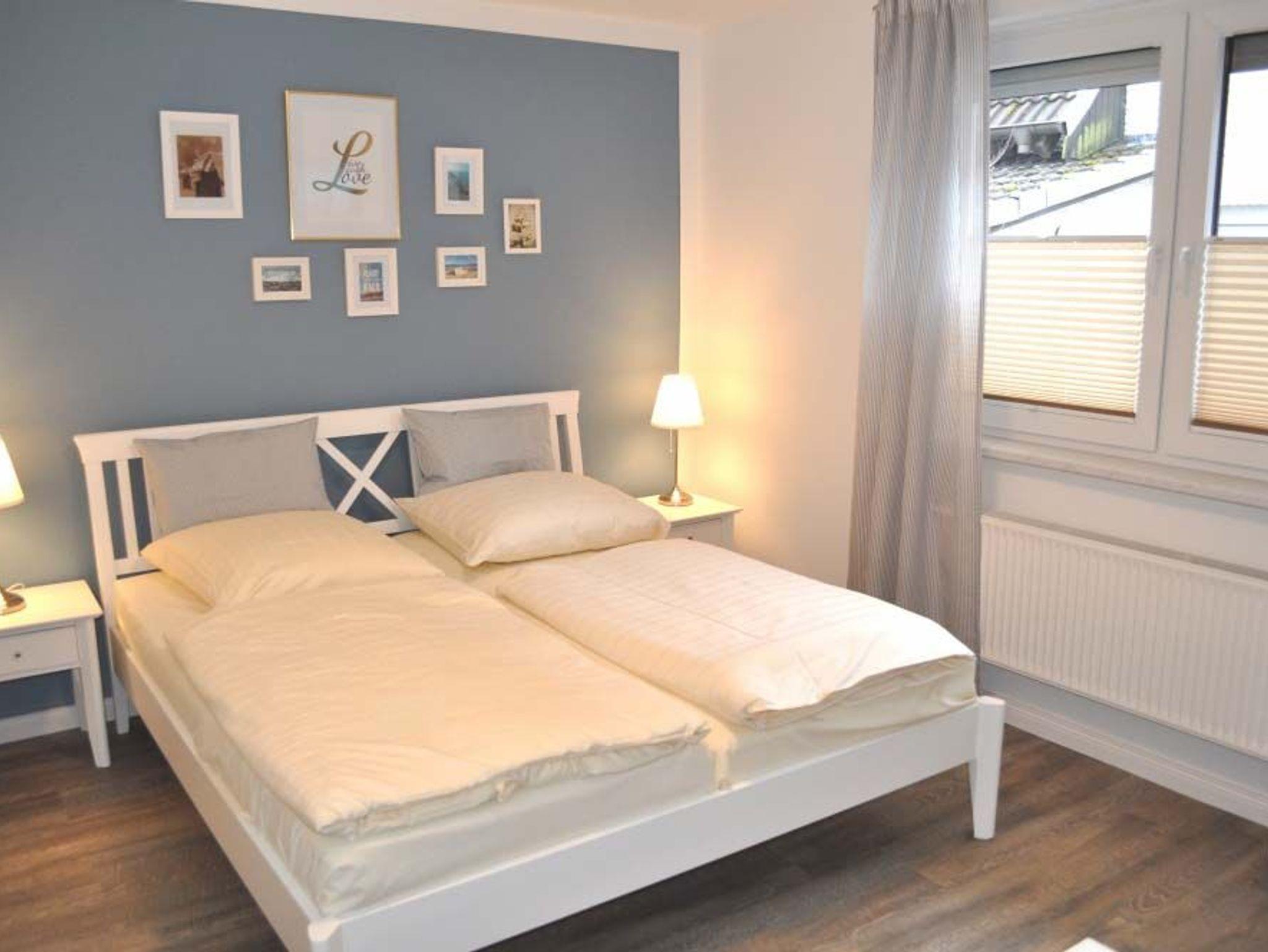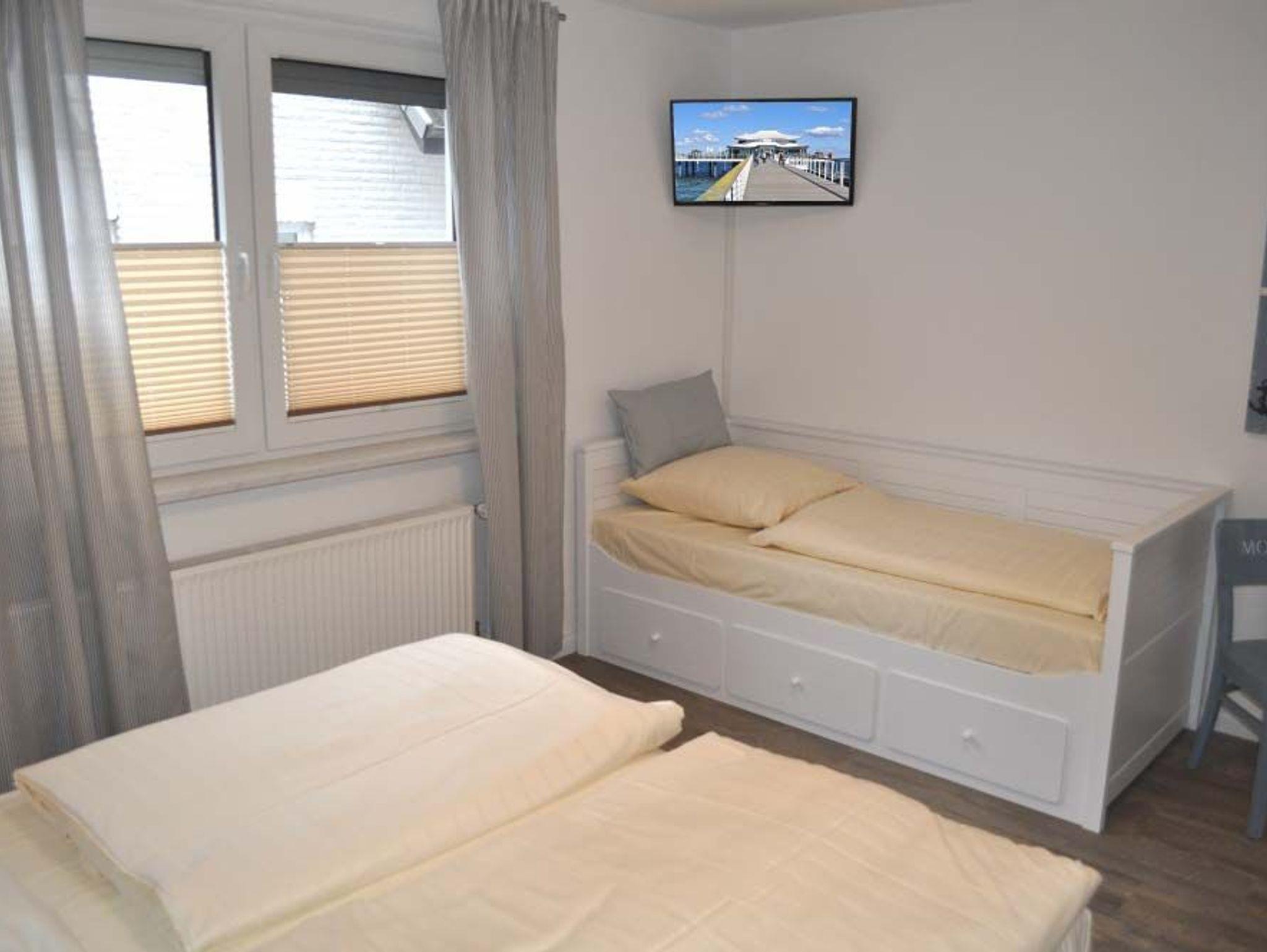 Schlafzimmer 1: 2 Matratzen, 2 Nachttische, 2 Tischlampen, Doppelbett 2,00 x 1,80 m, Einzelbett 2,00 x 0,90 m, elektrischer Rollladen und Plissees, Flachbildschirm, Kabel-TV, Kleiderschrank, Kommode, Stuhl