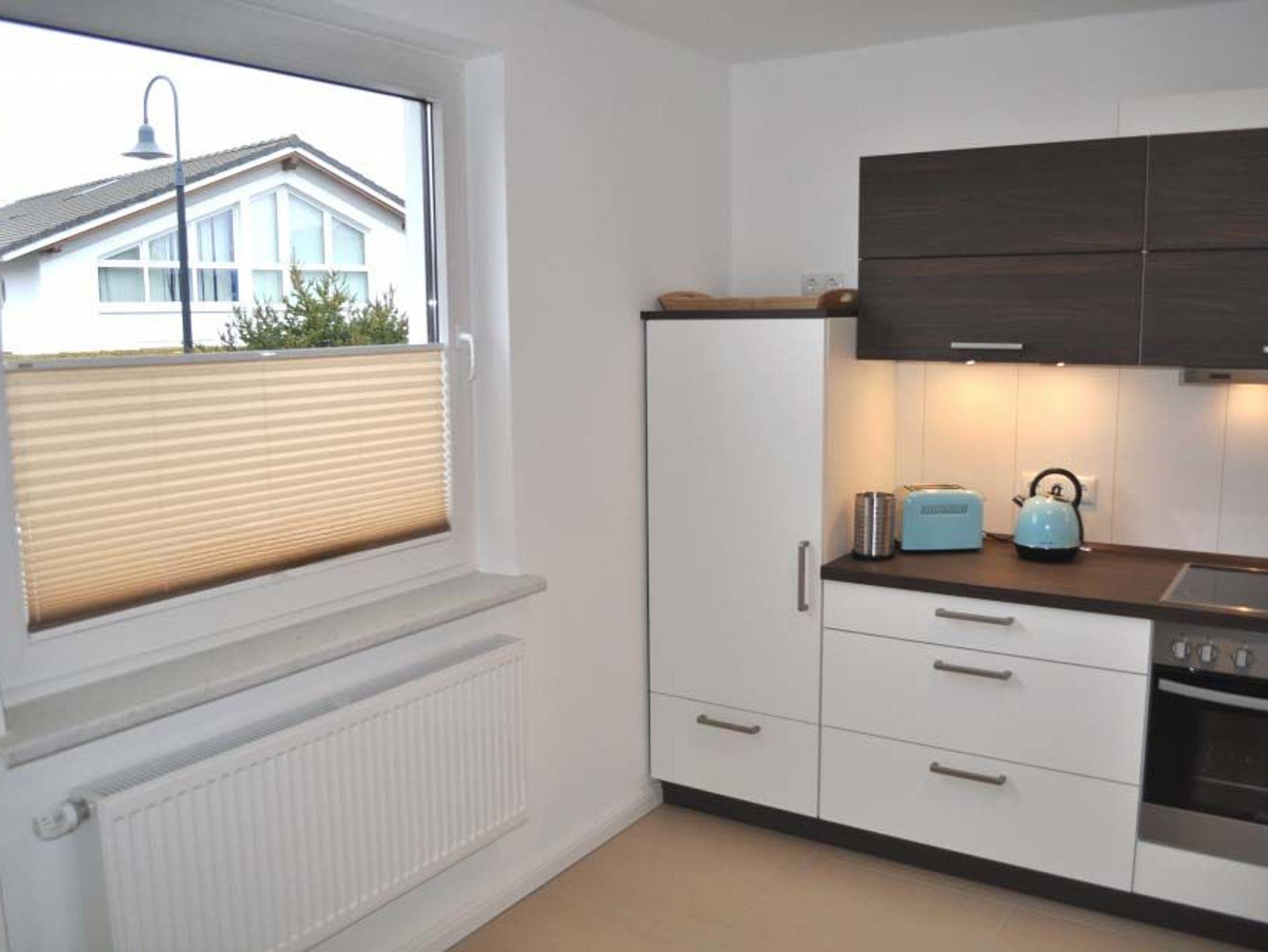 Küche: 4 Plattenherd mit Ceranfeld und Backofen, Dunstabzugshaube, Einbauküche, Geschirr, Kaffeemaschine, Kochtöpfe, Kühlschrank mit 3* Gefrierfach, Mikrowelle, Spülmaschine, Toaster, Wasserkocher