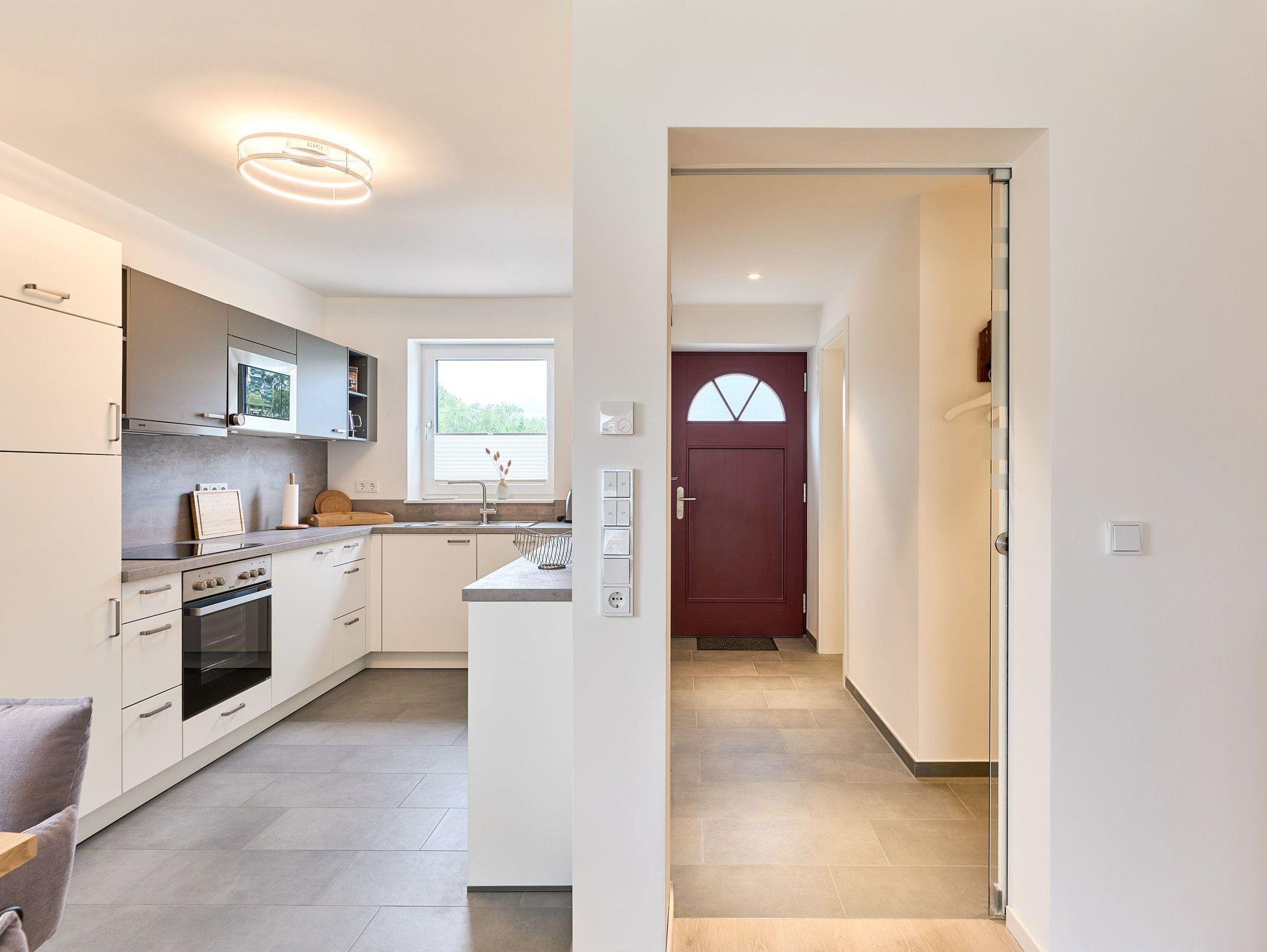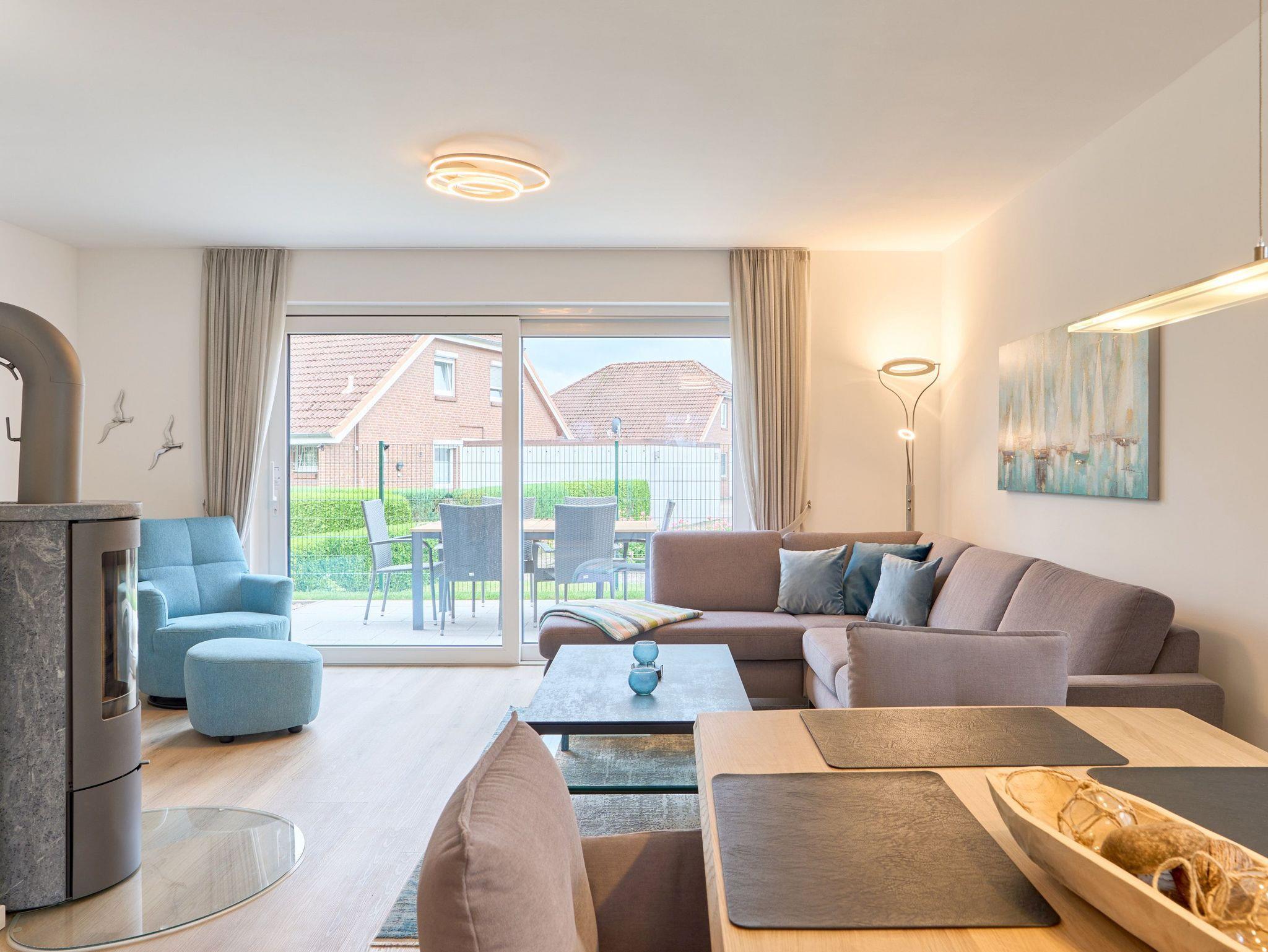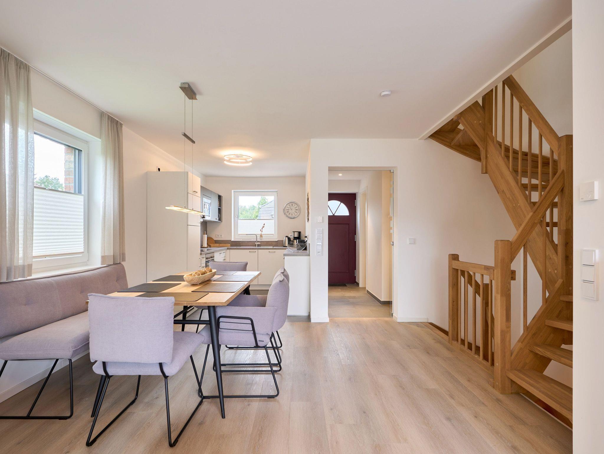 Dieses sehr ansprechende Ferienhaus hat eine Wohnfläche von ca. 100 m², auf zwei Etagen aufgeteilt. Der Eingangsbereich ist großzügig mit einer Garderobe und einem Tageslichtbad ausgestattet und ist durch eine Glastür vom Wohn-Essbereich abgetrennt. Die Küchenzeile ist großzügig in U-Form angelegt. Alles da … Geschirrspüler, Herd, Kochfeld, Kaffeemaschine, Toaster, Wasserkocher, Waschmaschine und vieles mehr. Der Essbereich bietet Platz für 6 Personen. Im Anschluss das gemütliche Wohnzimmer, mit Sofa, Tisch, Relaxsessel und einem 55-Smart-TV sowie einem Kaminofen für die kalte Jahreszeit. Vom Wohnzimmer haben Sie Zugang zur Terrasse.