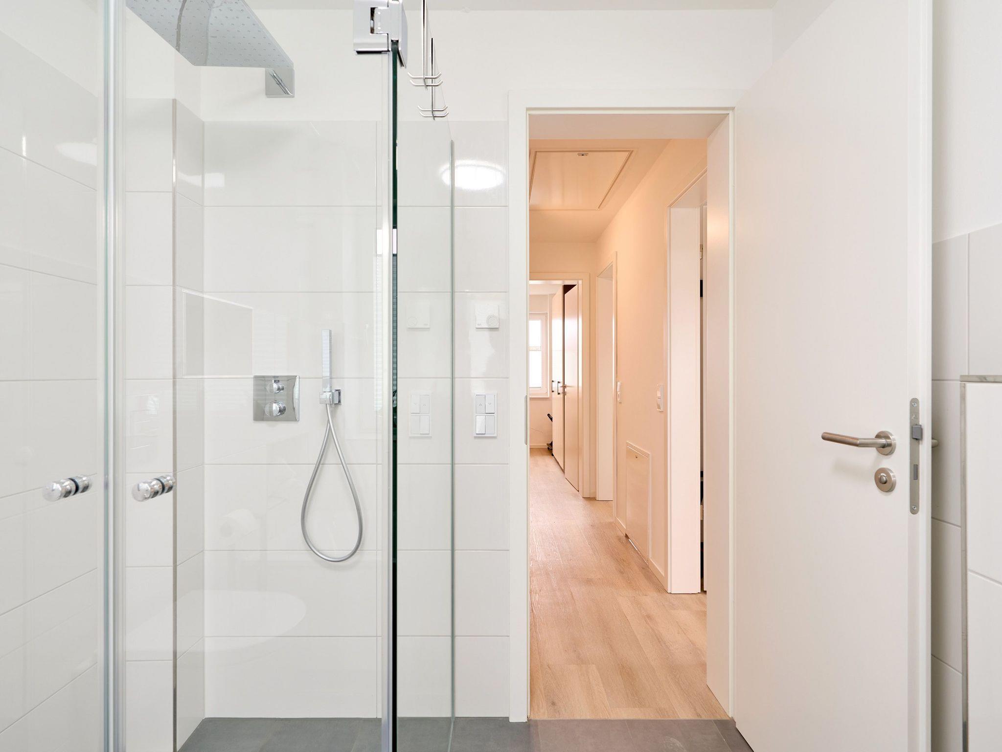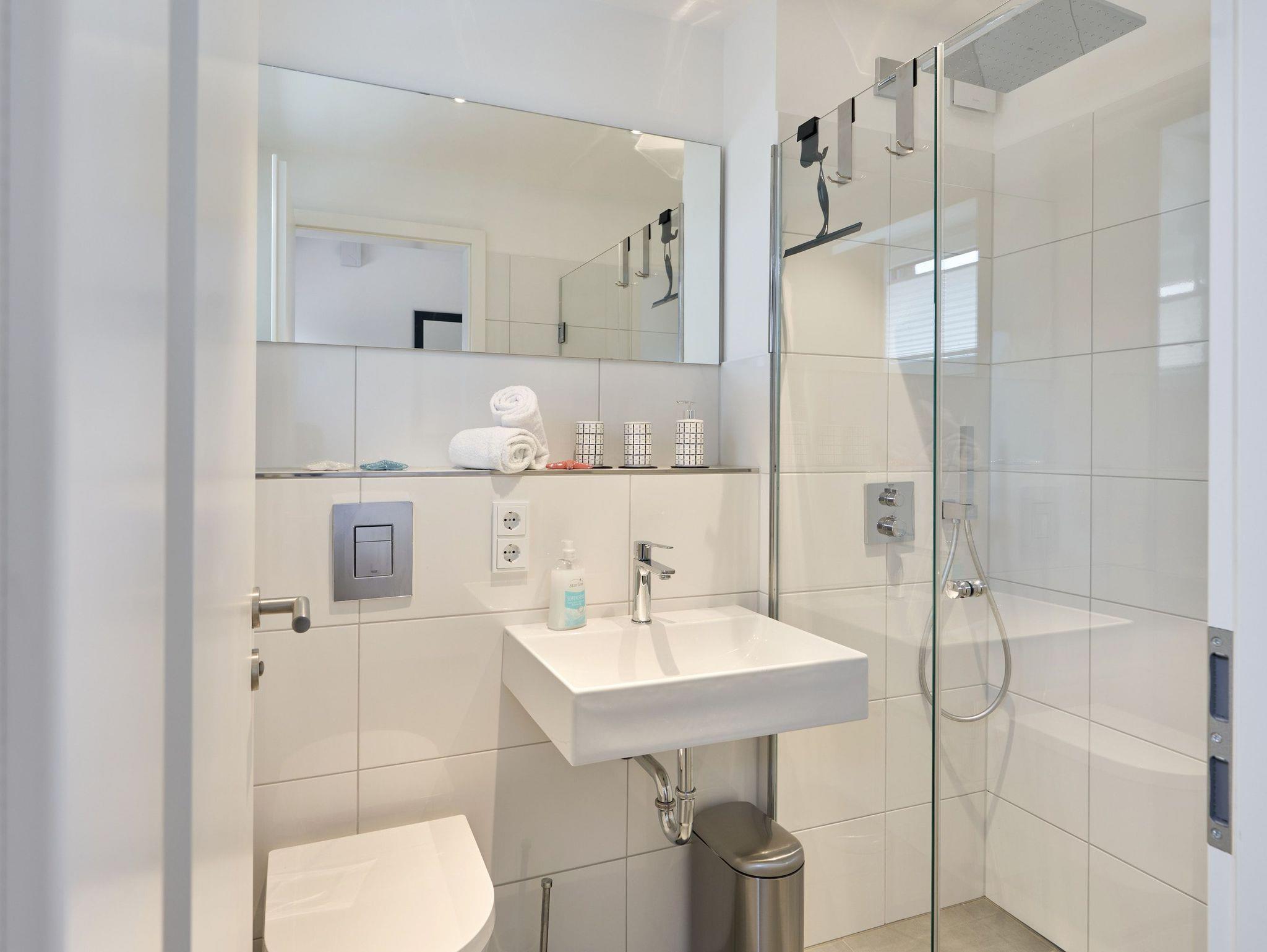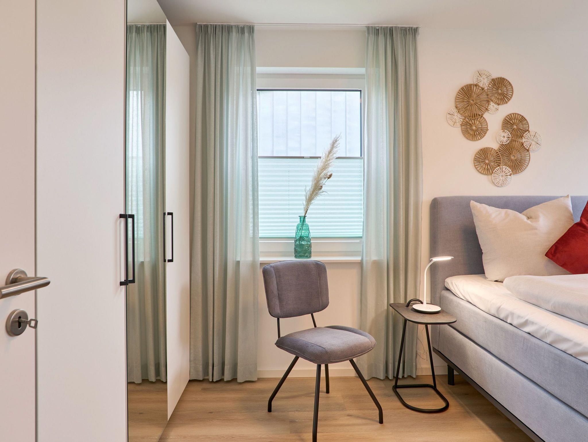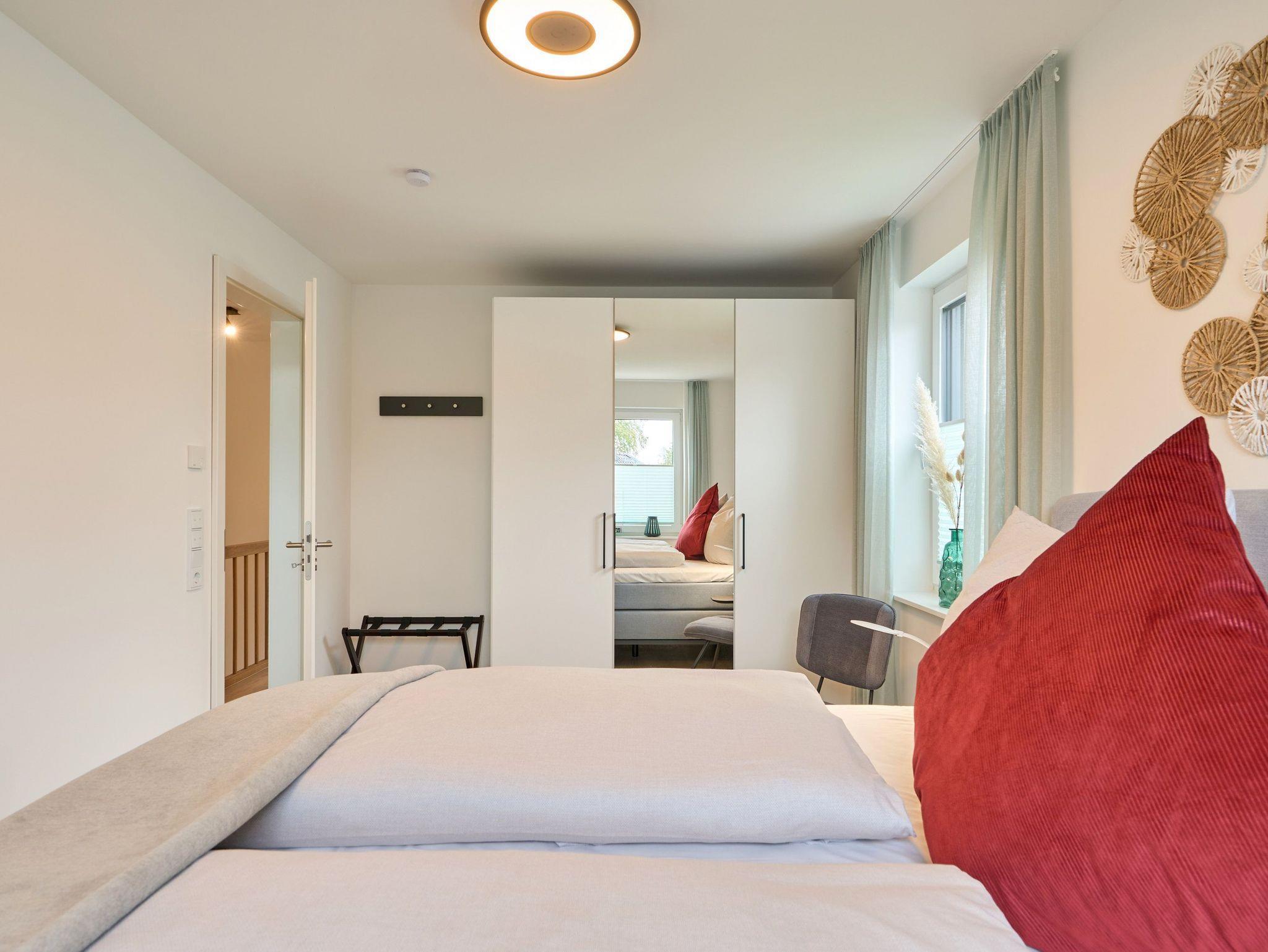 Über eine bequeme Treppe gelangen Sie in das 1. Obergeschoss. Hier befinden sich drei Schlafzimmer sowie das zweite Tageslichtbad, ausgestattet mit einer Badewanne sowie einer bodengleichen Dusche. Zwei Schlafzimmer sind mit je einem Kleiderschrank, zwei Nachttischen sowie mit einem Boxspringbett (1,80x2,00m) ausgestattet. Das dritte Schlafzimmer ist mit einem Kombibett eingerichtet, hier lässt sich aus dem Bettkasten eine weitere Schlafgelegenheit ausziehen. Alle Räume lassen sich mit elektrischen Rollläden verdunkeln.