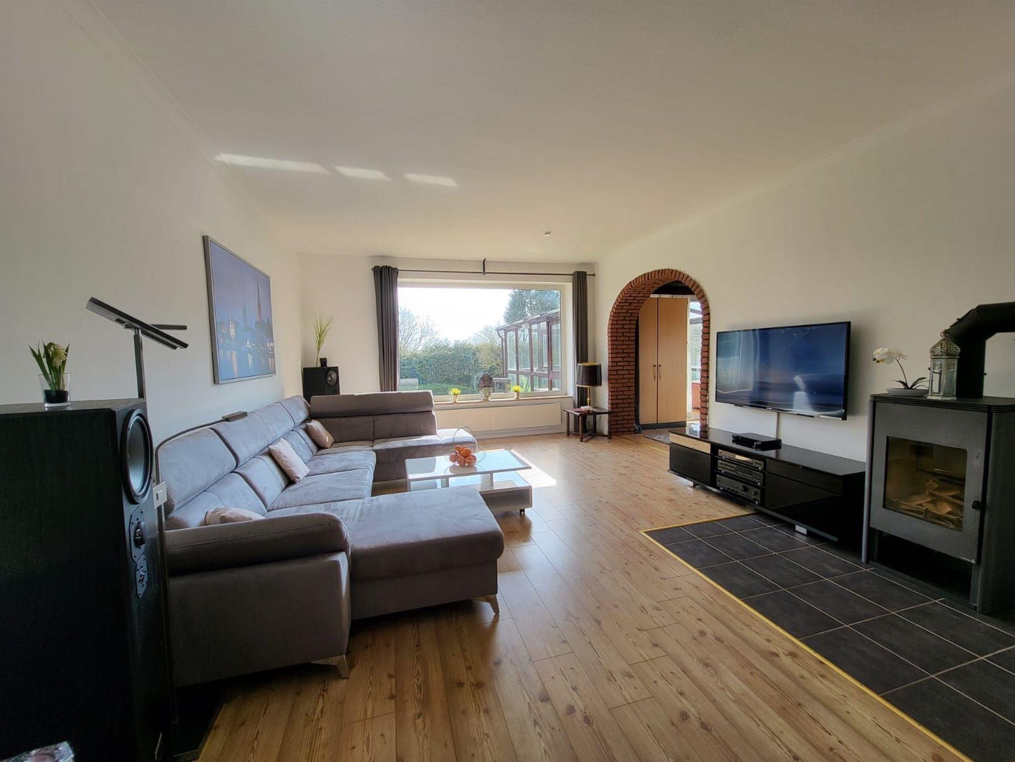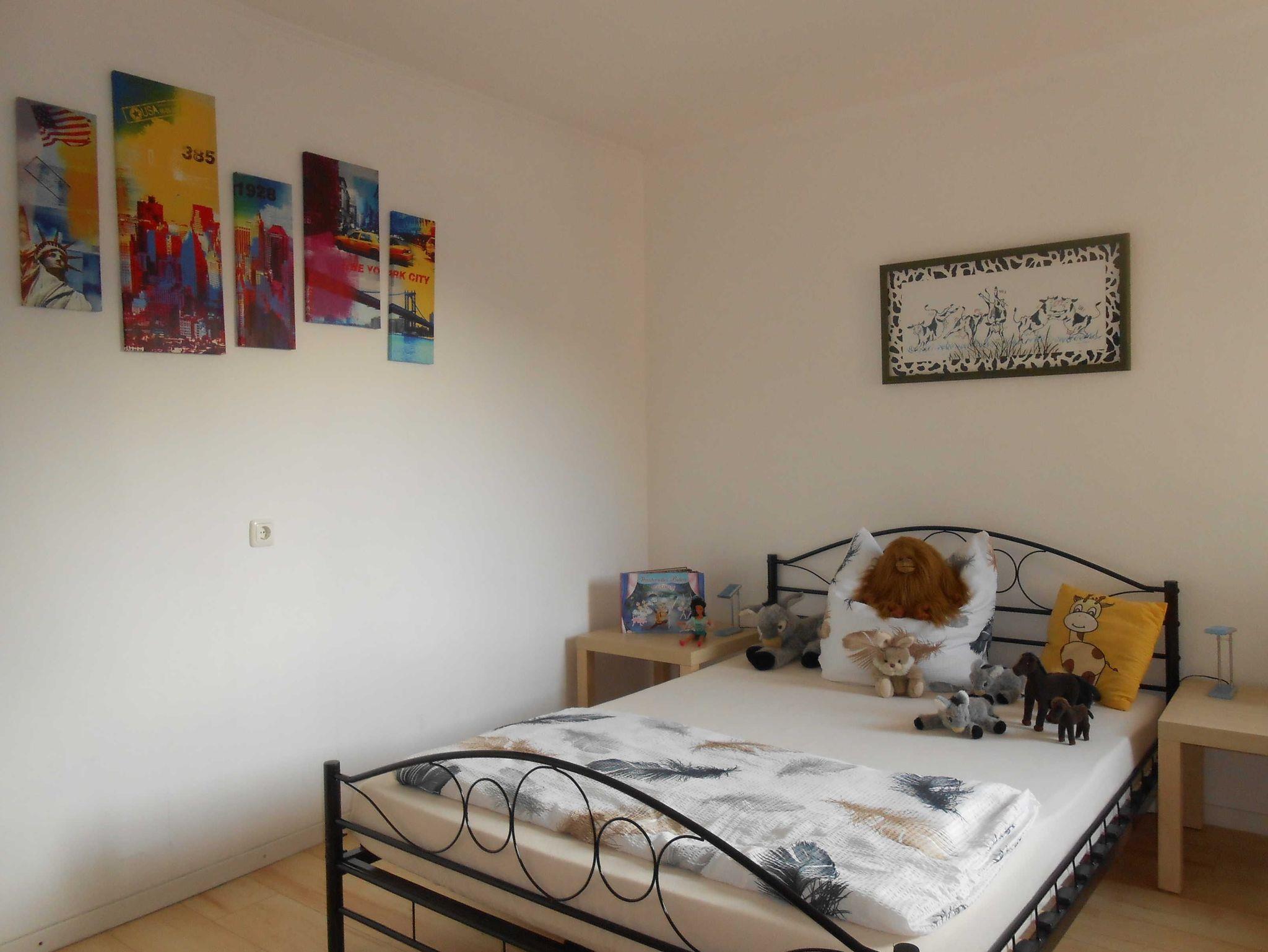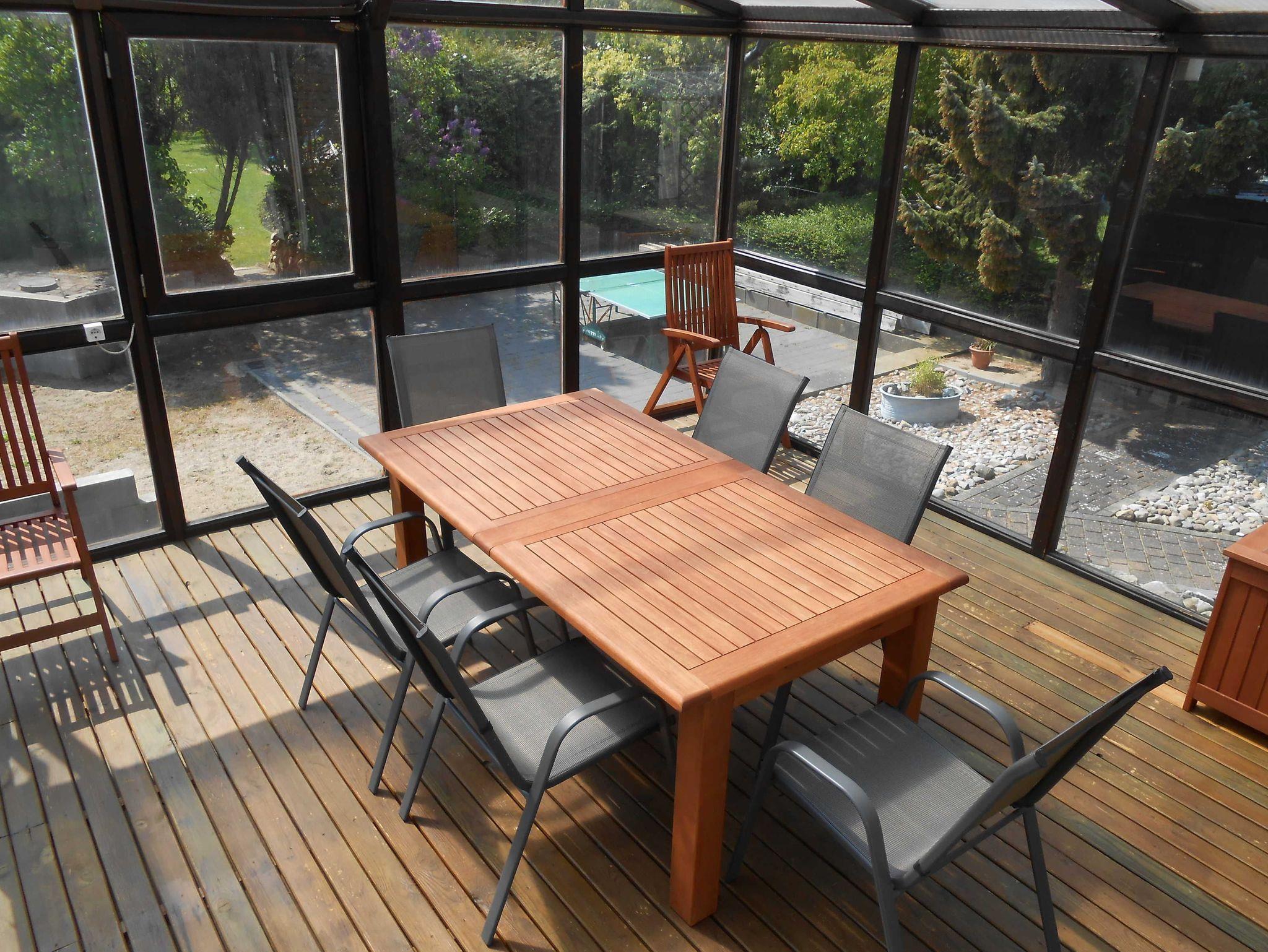 Die Ferienwohnung hat ein Bad mit Badewanne sowie eine Gästetoilette. Die Küche (mit Spülmaschine) und Flur besitzen Bodenfliesen, im Rest der Wohnung ist Laminat verlegt worden. Zwei Schlafzimmer haben französische Betten (140 x 200 cm), ein weiteres Schlafzimmer hat ein Bett (180 x 200 cm). Im Anbau im Wohnzimmer steht zusätzlich noch eine Schlafcouch für zwei Personen. Direkt vom Anbau gelangt man in den 20 m² großen Wintergarten, der einen direkten Zugang in den Garten hat. Dort gibt es einen Platz im Carport für ein Fahrzeug. Der Kamin steht leider nicht zur Benutzung zur Verfügung. Im Garten kann man die Seele baumeln lassen. Ein Kinderreisebett (ohne Bettwäsche!!!!) und ein Kinderstuhl werden gerne kostenlos zur Verfügung gestellt.