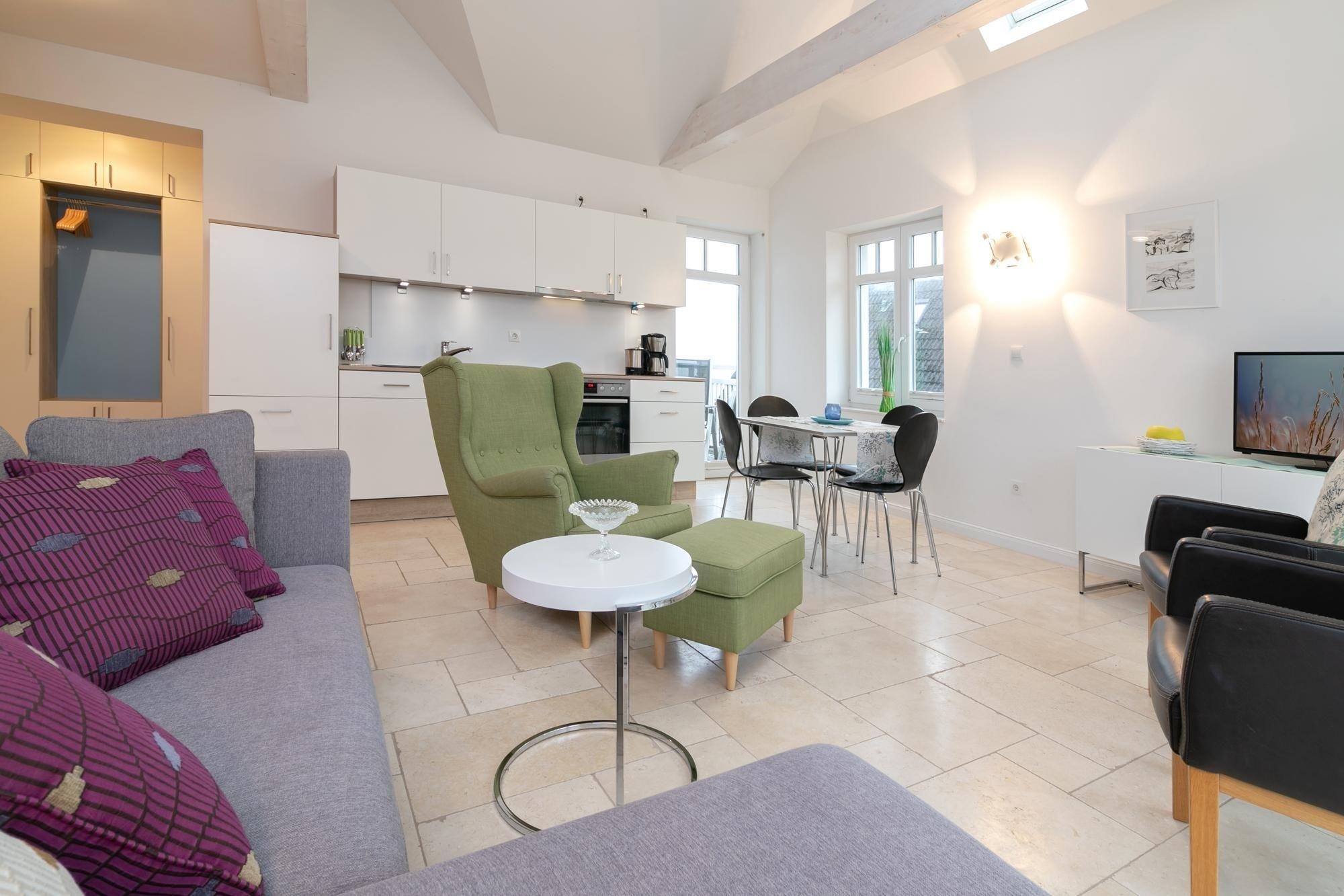 Modern und behaglich eingerichtet erstreckt sich das Sonnendeck über 2 Ebenen. In bester Lage von Haffkrug genießen Sie von 2 Balkonen den Meerblick oder den Blick ins Grüne. Eine offene Wohnküche mit Natursteinboden und Fußbodenheizung, ein modernes Bad mit Regendusche, sowie zwei gemütliche separate Schlafzimmer sorgen für Wohlbefinden. Ein Schlafzimmer verfügt über ein komfortables Doppelbett (2x 90x200 cm), ein weitere über zwei separate Einzelbetten (je 80x200 cm). Genießen Sie den wunderbaren Blick auf die Ostsee. Durch die Süd-West-Ausrichtung der Balkone können Sie die Sonnenstrahlen von mittags bis abends rundum auskosten.