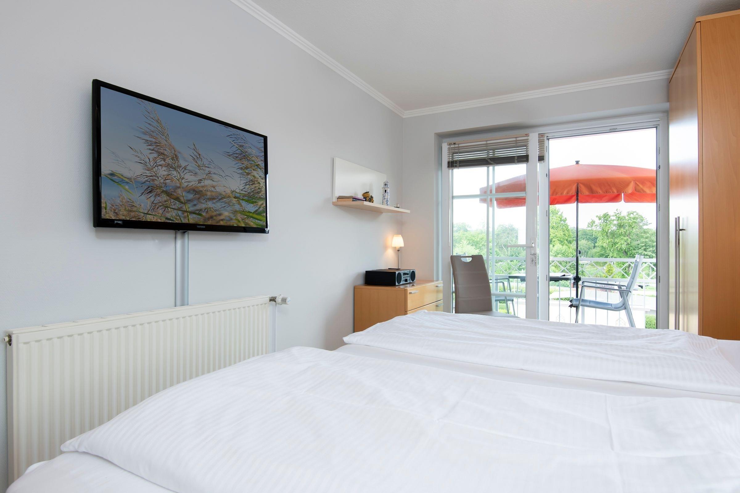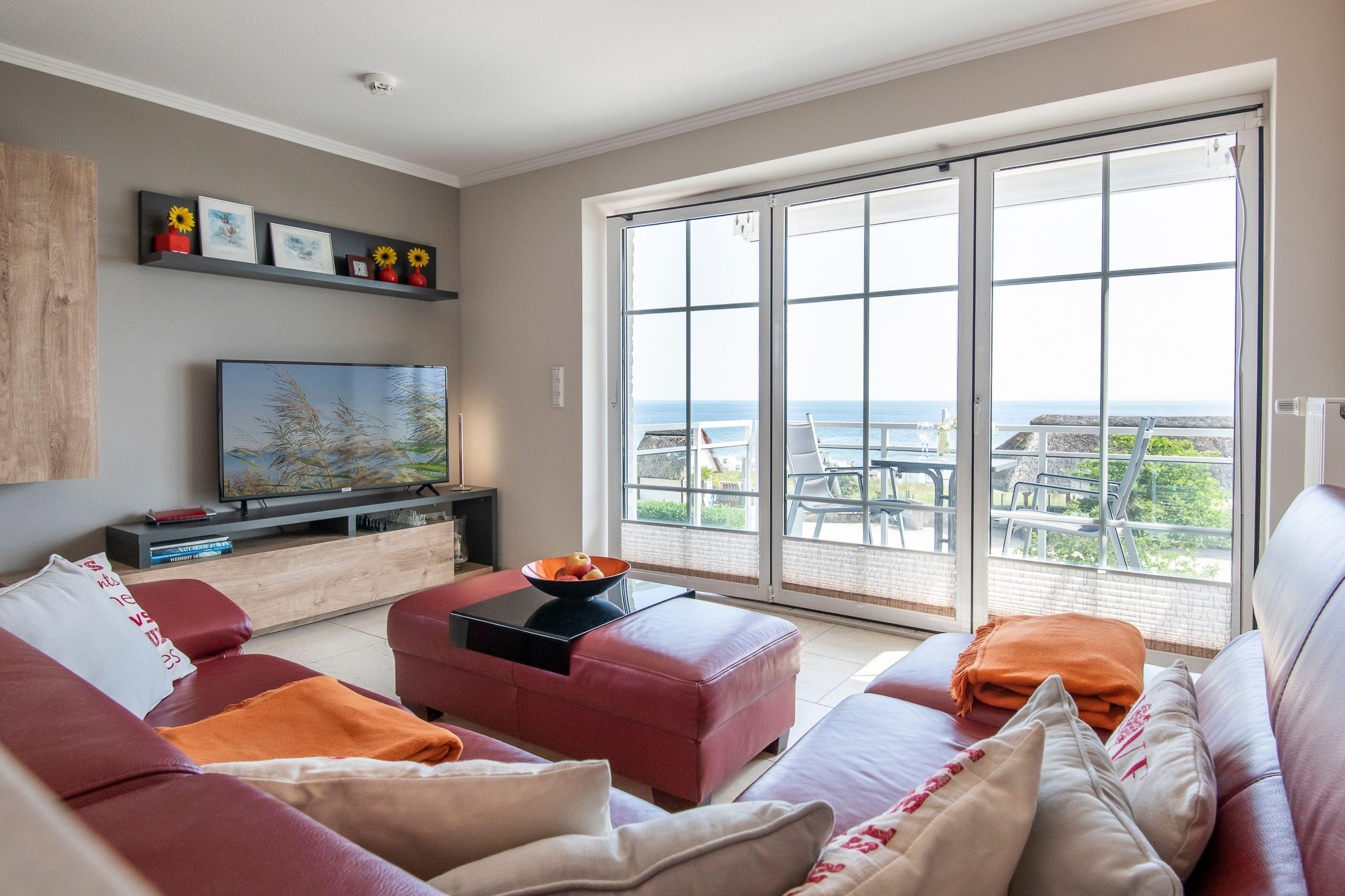 Im Wohnraum befindet sich ein Schlafsofa (120x180 cm) für 1 Person. Außerdem gibt es einen Smart-TV, eine Stereoanlage sowie einen kostenfreien WLAN-Anschluss. Der zum Wohnzimmer gehörende Balkon ist mit Gartenmöbeln, Sonnenschirm und Markise ausgestattet. Von hier haben Sie einen freien Ausblick auf die gesamte Lübecker Bucht. Die exklusive Küchenzeile (Backofen, Cerankochfeld, Geschirrspüler, Mikrowelle, Kaffeemaschine, Wasserkocher, Toaster) ist zusammen mit der Essecke im Wohnraum integriert. Das Schlafzimmer ist mit einem Boxspring-Doppelbett (2x 90x200 cm) und einem geräumigen Kleiderschrank sowie einem zweiten TV-Gerät möbliert. Das Badezimmer verfügt über eine Dusche, WC und einen Waschtisch mit Spiegelschrank. Hier befindet sich auch die Waschmaschine.