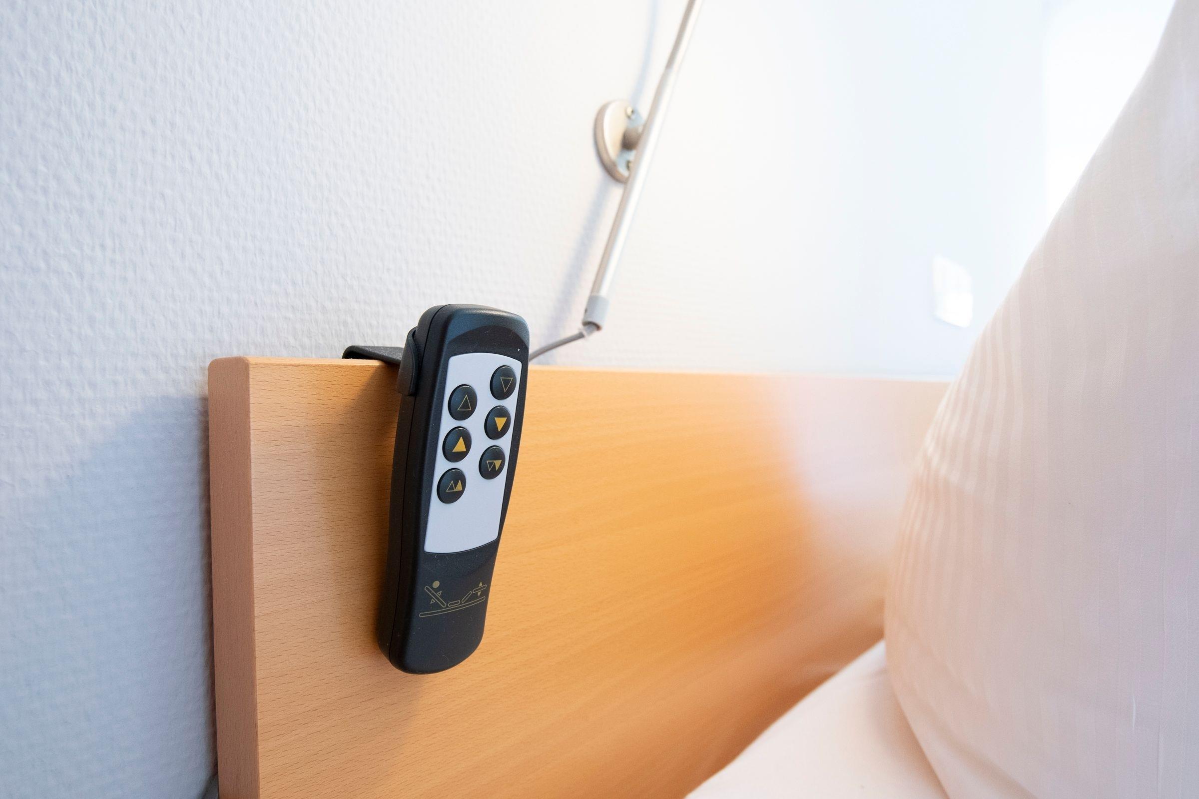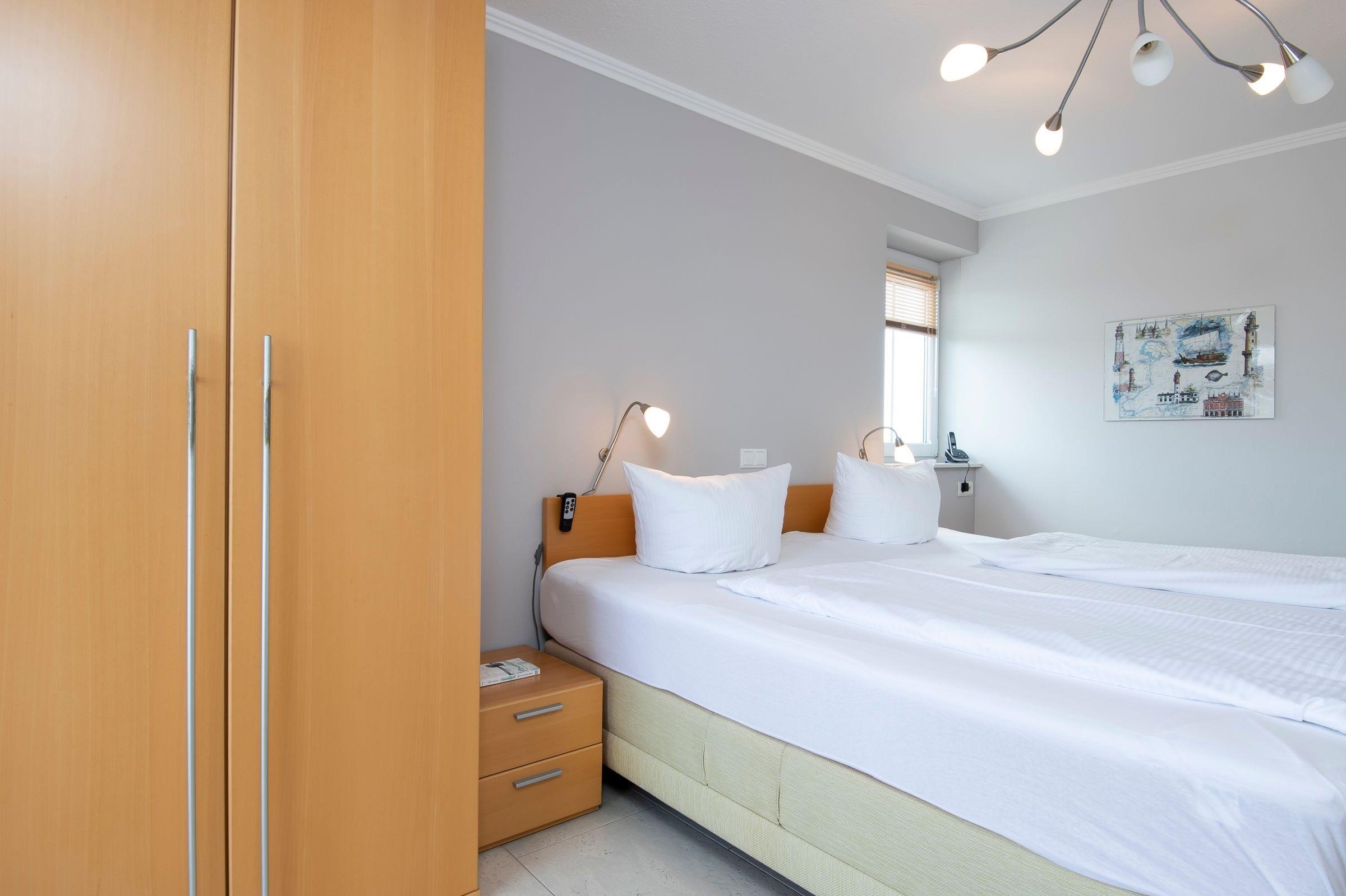 Schlafzimmer: 1 Boxspring-Doppelbett (2x 90x200 cm), TV, Kleiderschrank, Verdunkelungsmöglichkeit
