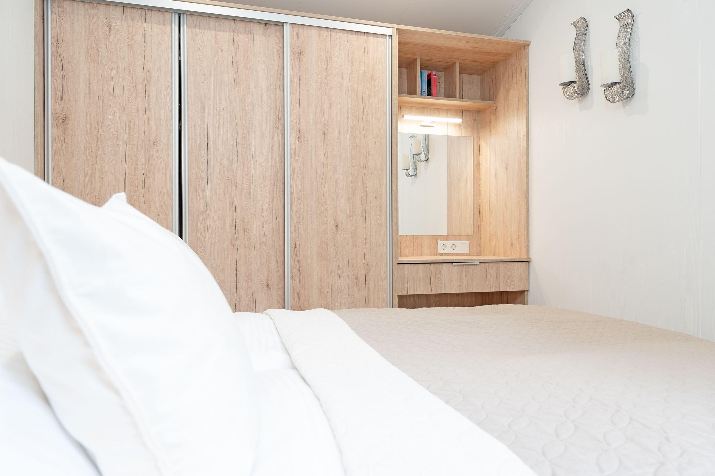 Schlafzimmer 1: kleines Doppelbett (ca. 160x200cm), Kleiderschrank, Verdunkelung: Thermogardine, TV, Platz für Kinderreisebett vorhanden
