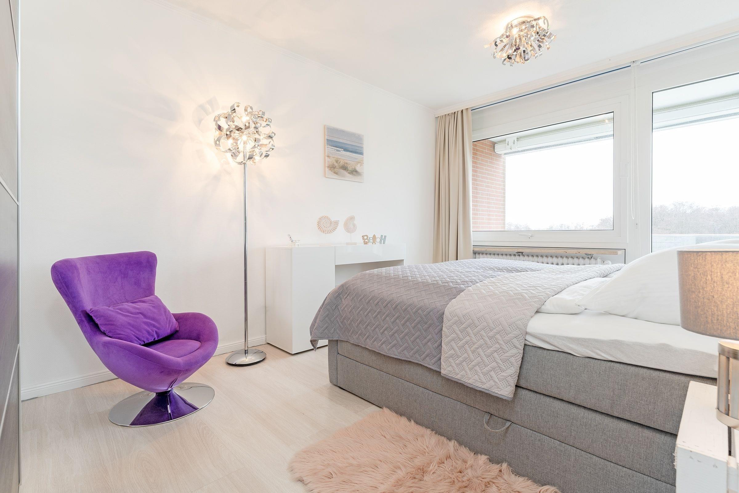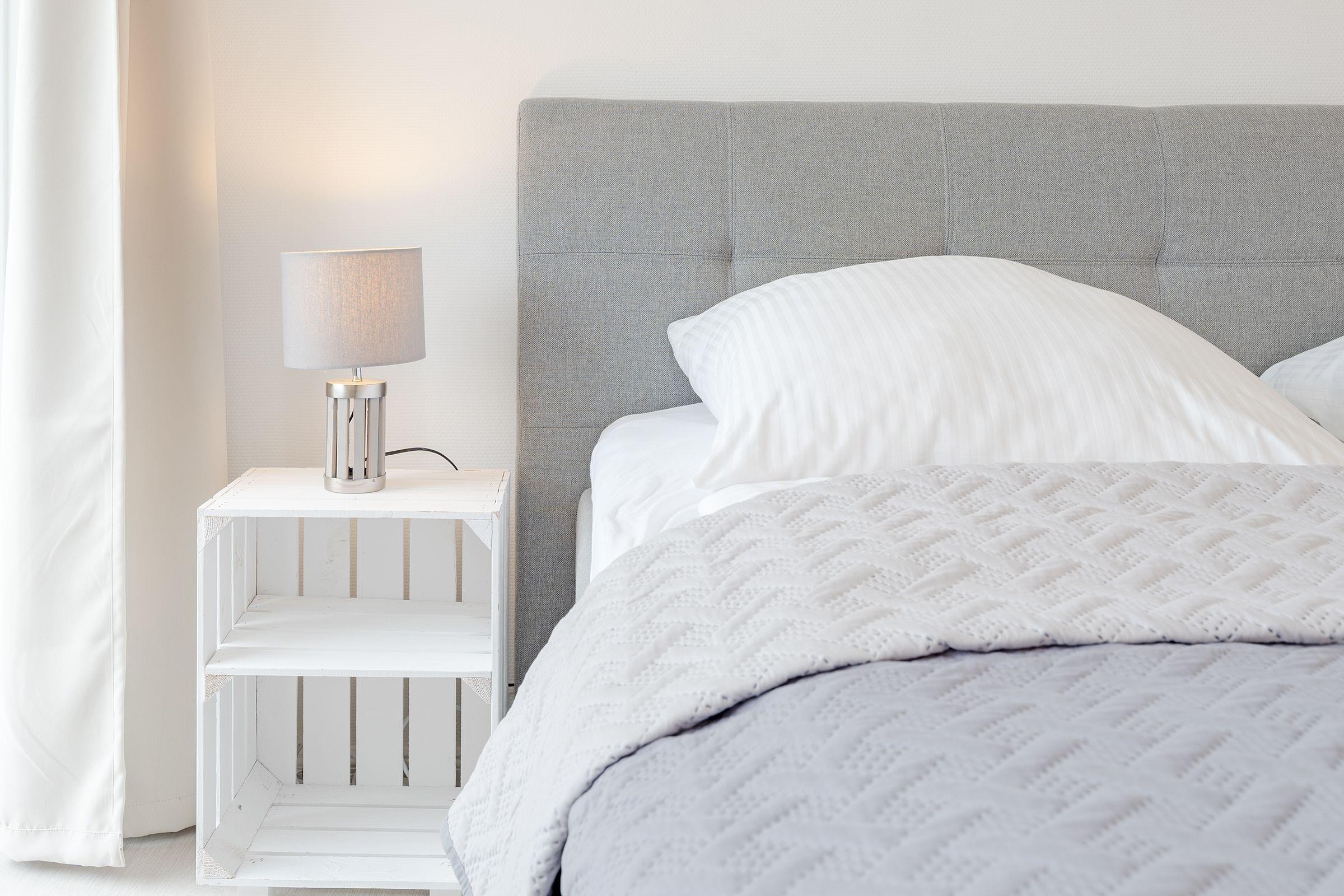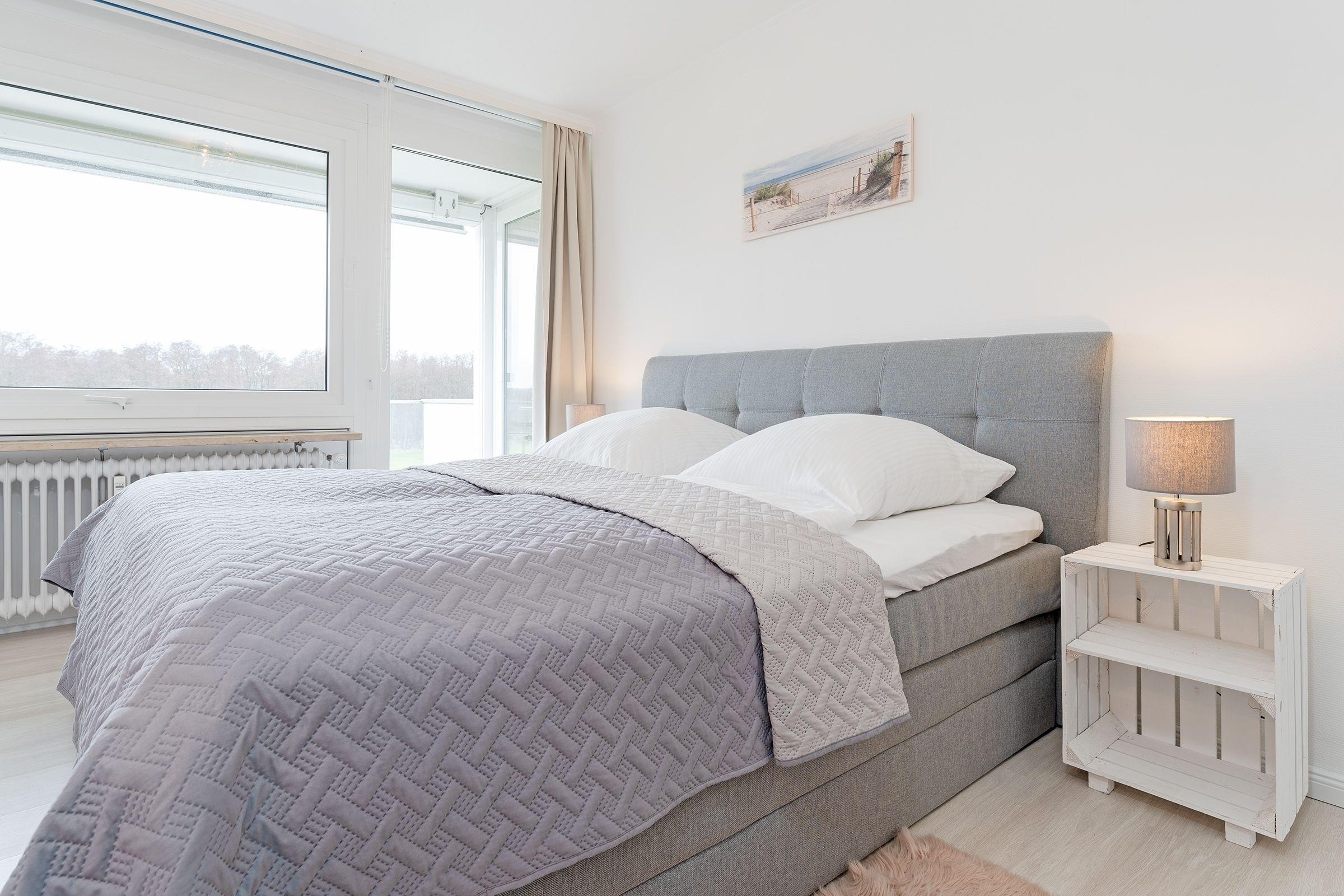 Schlafzimmer: 1 Doppelboxspringbett (180x200 cm), Kleiderschrank, Verdunkelung: Rollo & Gardinen, Platz für Babybett vorhanden