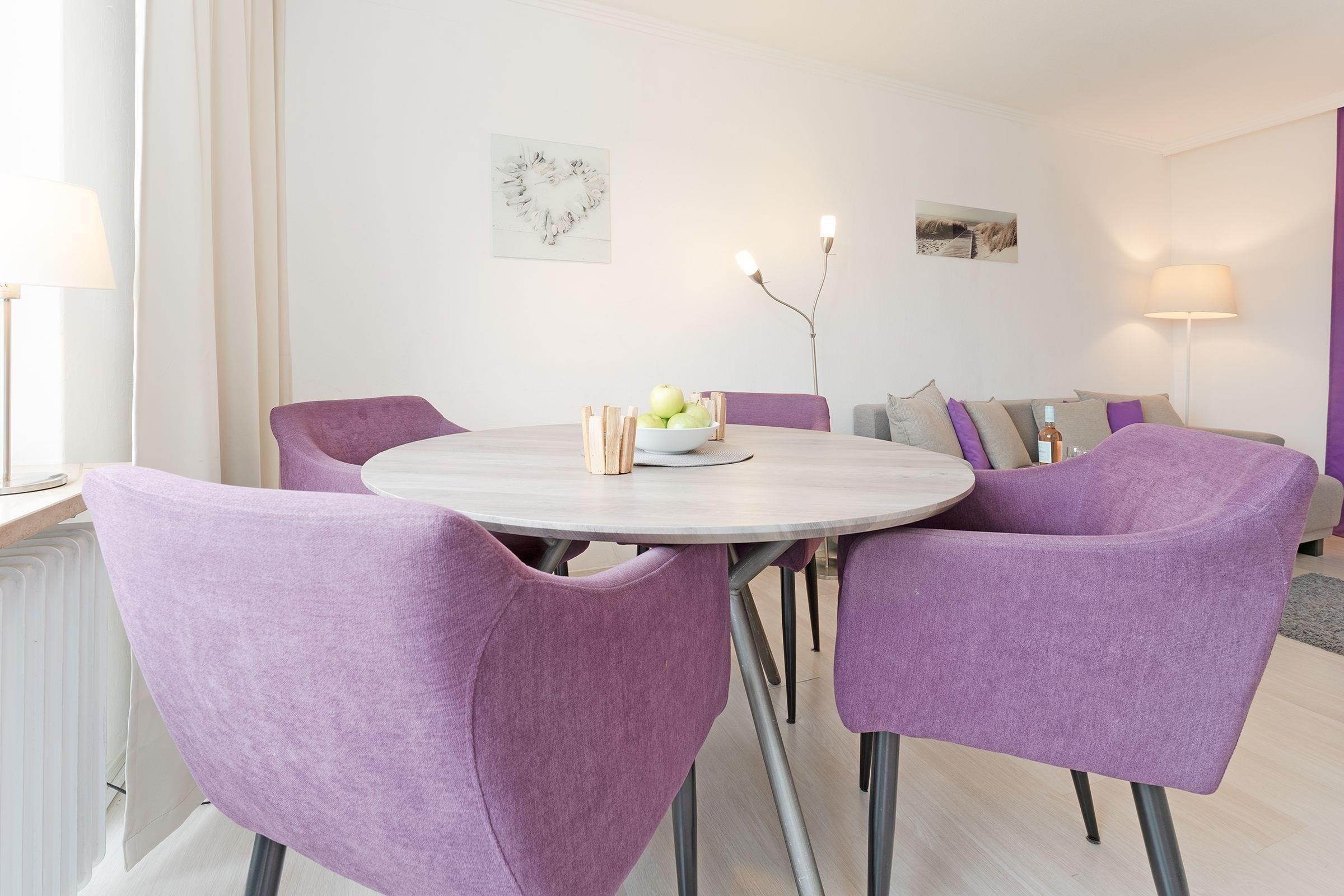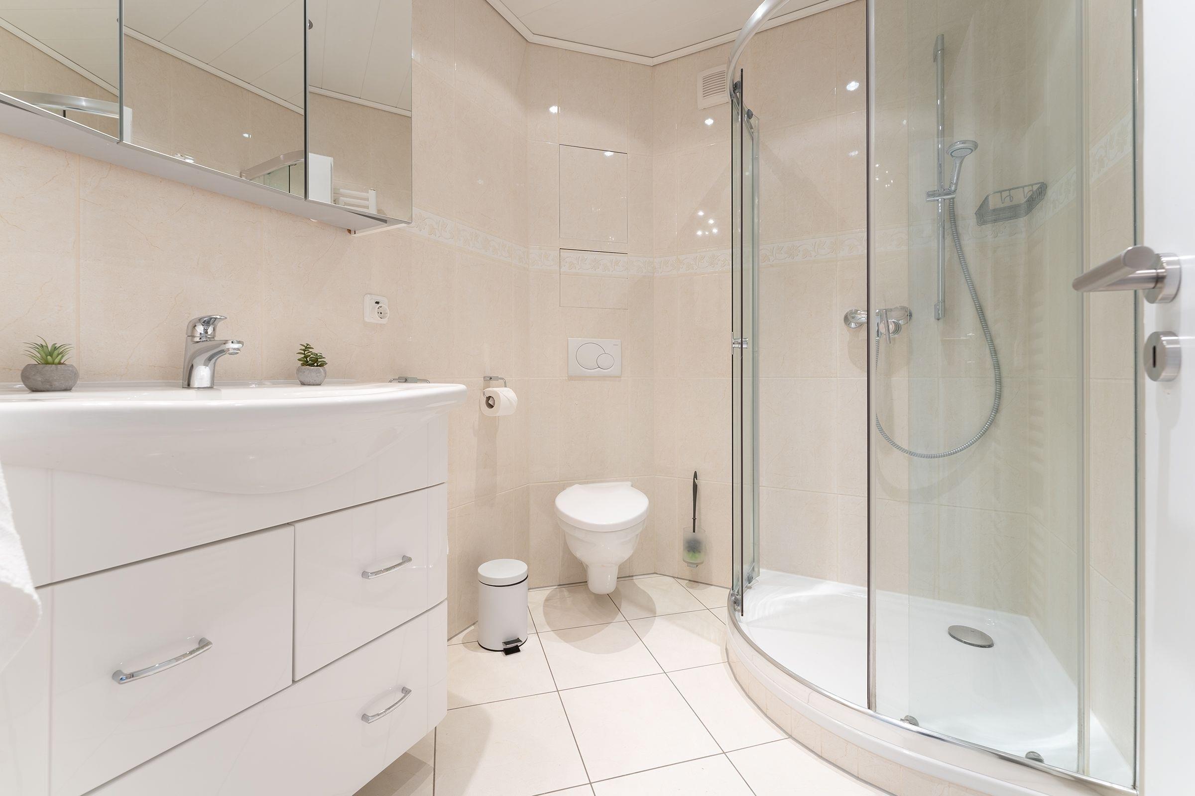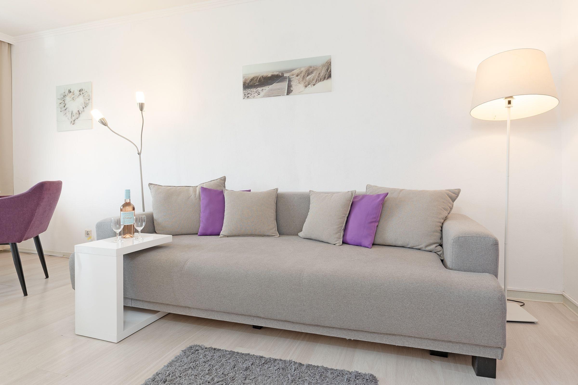 Nur gut 50 Meter vom Ostseestrand entfernt präsentiert sich das Feriendomizil Strandstern im Appartementhaus Nautica. Sowohl das große Sofa vor dem TV-Gerät als auch die gemütliche Essecke am Fenster laden zum Verweilen ein. Hier haben Sie auch Zutritt auf den möblierten Balkon mit West-Ausrichtung und einem Weitblick ins Grüne. Die kleine Kochnische mit Geschirrspüler ist funktional eingerichtet. Nach einem schönen Tag am Meer können Sie für die Nacht das Sofa in einen Schlafplatz (ca. 150x200 cm) verwandeln. Zudem steht im separaten Schlafzimmer ein Doppelboxspringbett (180x200 cm) bereit. Das innenliegende Duschbad ist hell gefliest.