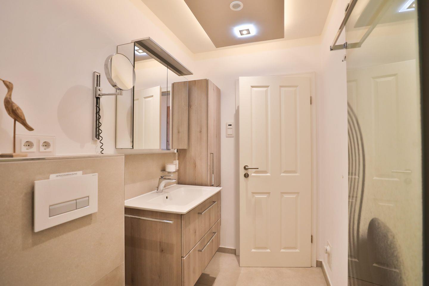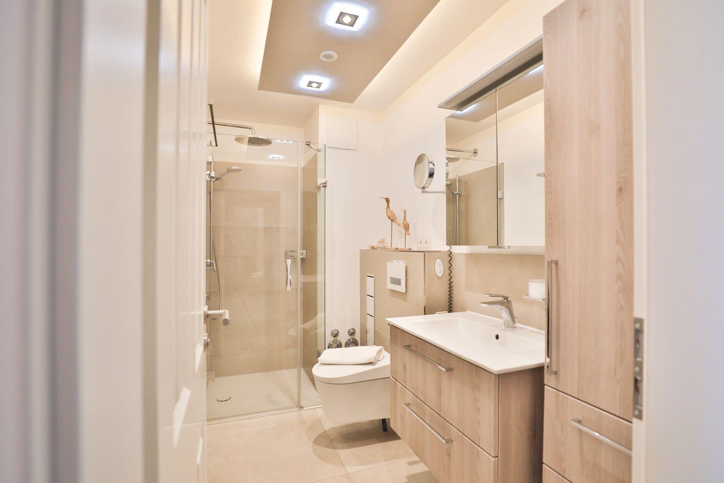 Das Badezimmer überzeugt mit Tageslicht und moderner, hochwertiger Ausstattung, inklusive einem Handtuchheizkörper.