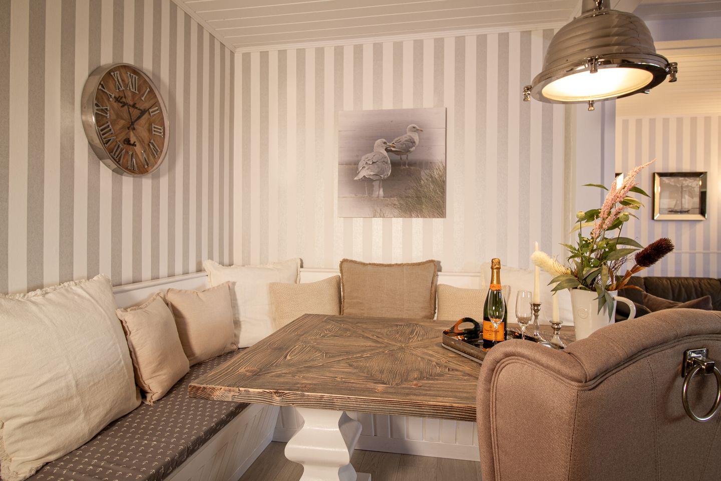 Beim Betreten durch die Garderobe gelangen Sie in den geräumigen Wohn- und Schlafbereich (Schlafsessel 0,90 x 2,00). Dort erwartet Sie ein gemütlicher Sitzbereich mit einer Eckbank und einem großzügigen Esstisch, perfekt für gemeinsame Mahlzeiten und Spieleabende. Vom bequemen Sofabereich aus haben Sie freien Blick auf den großen Flat-Smart-TV. Melden Sie sich mit Ihrem eigenen Netflix- oder Amazon Prime-Konto an, um auch im Urlaub Ihre Lieblingsfilme und -serien zu genießen. Ein großer King-Size-Sessel kann zu einem Bett ausgeklappt werden und bietet eine zusätzliche Schlafmöglichkeit für eine 7. Person. Zwei große Panoramafenster ermöglichen einen herrlichen Blick auf die Ostsee, und die sonnige Terrasse lädt mit Loungemöbeln zum Verweilen mit Familie und Freunden ein.