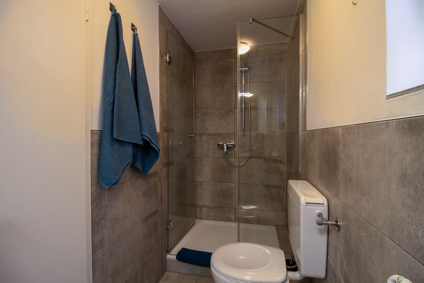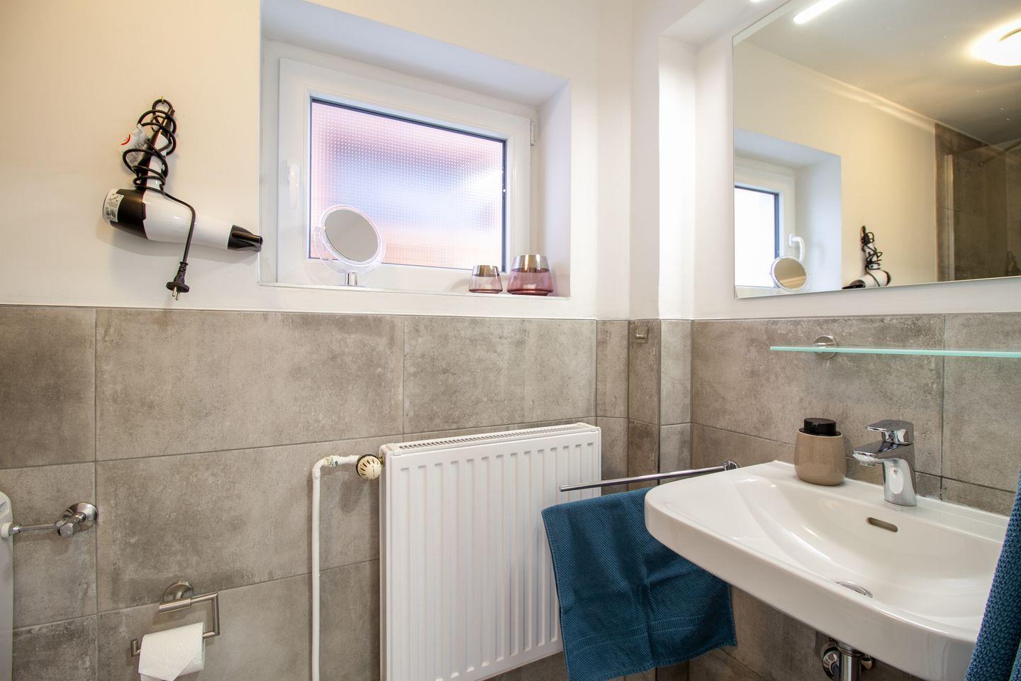 Das neu gestaltete Tageslicht-Badezimmer verfügt über eine Dusche, WC und Waschbecken.