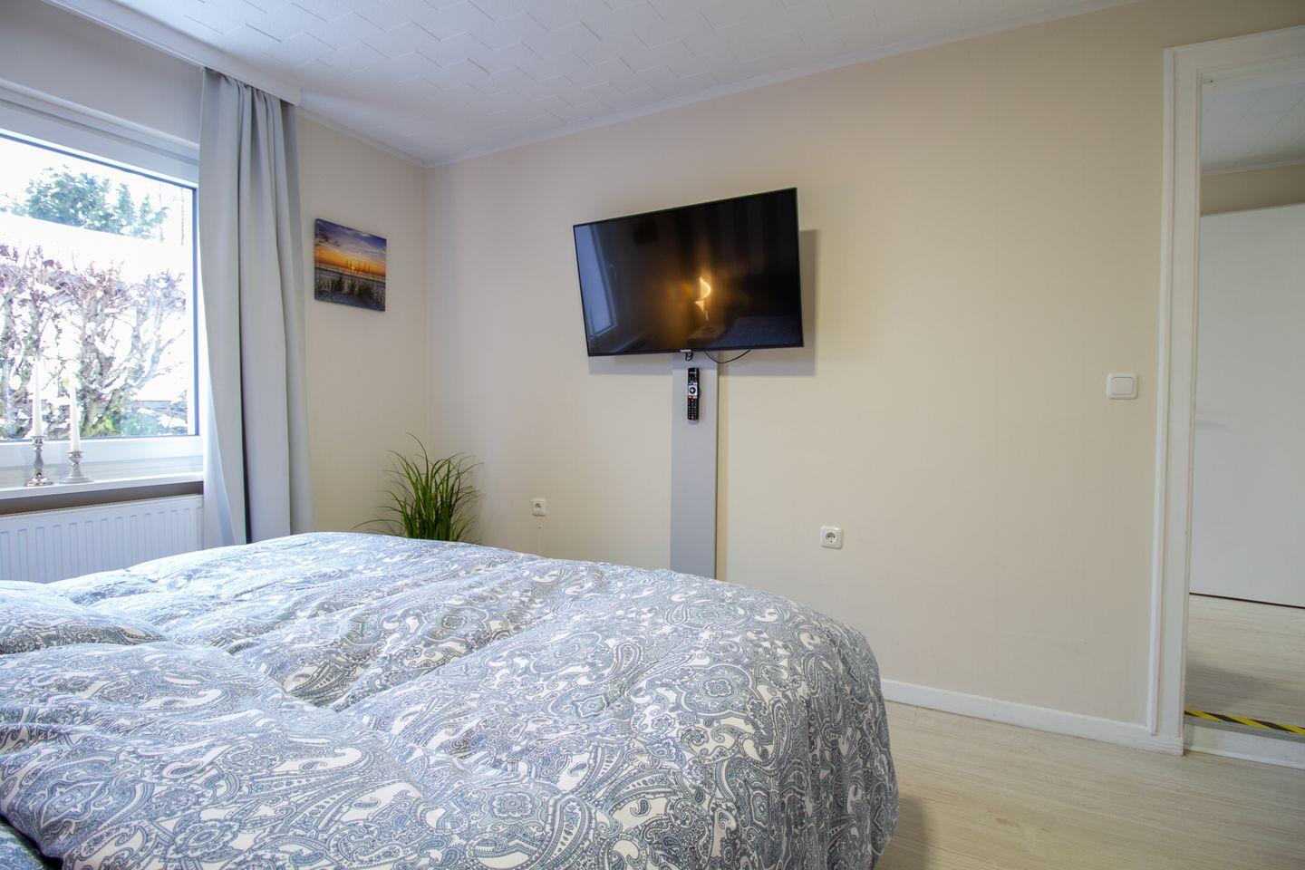 Vom Eingangsbereich mit Küchenzeile gelangen Sie in den Wohnbereich (Schlafsofa 1,60 x 2,00). Eine Tür führt Sie zum Schlafzimmer mit einem komfortablen Boxspring-Bett (1,80 x 2,00 m), einem großzügigen Kleiderschrank und einem Flat-Smart-TV.