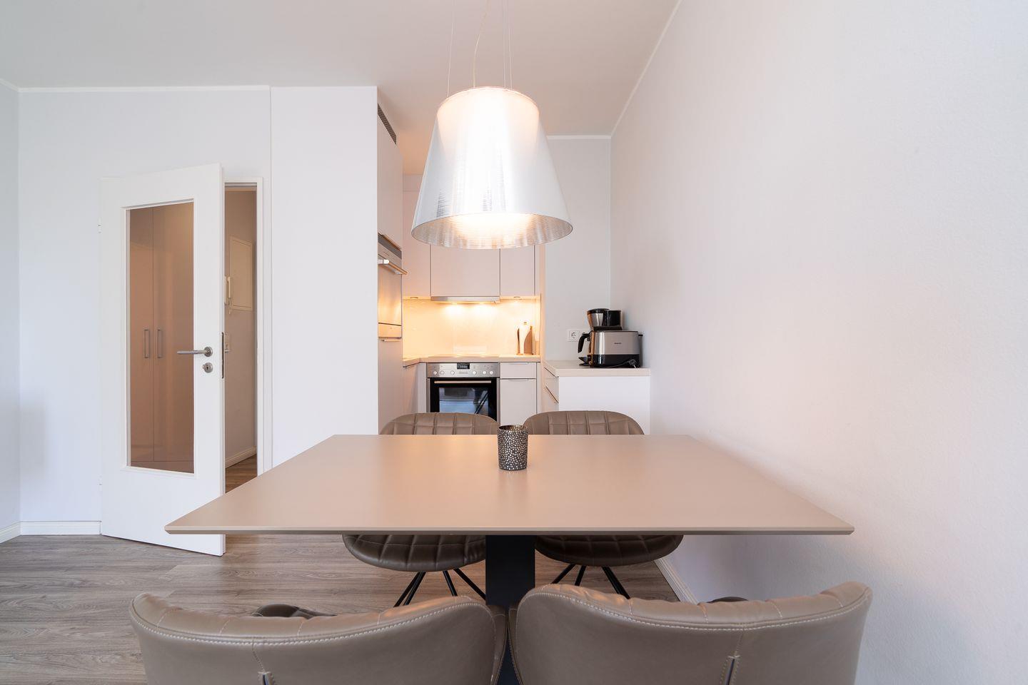In der Wohnung erwartet Sie ein modern gestalteter Wohnbereich mit einer offenen Küche, die mit hochwertigen Küchengeräten, wie einem Cerankochfeld, Backofen, Kühlschrank samt Gefrierfach sowie einer Spülmaschine ausgestattet ist. Hier finden Sie alles, was Sie benötigen, um köstliche Mahlzeiten zuzubereiten. Das gemütliche Sofa und der Essbereich laden dazu ein, entspannte Abende im Freundes- oder Familienkreis zu verbringen. Für gesellige Filmabende steht Ihnen ein großer Fernseher zur Verfügung, zudem gibt es WLAN und Radio, damit Sie auch während Ihres Aufenthaltes bestens unterhalten werden.