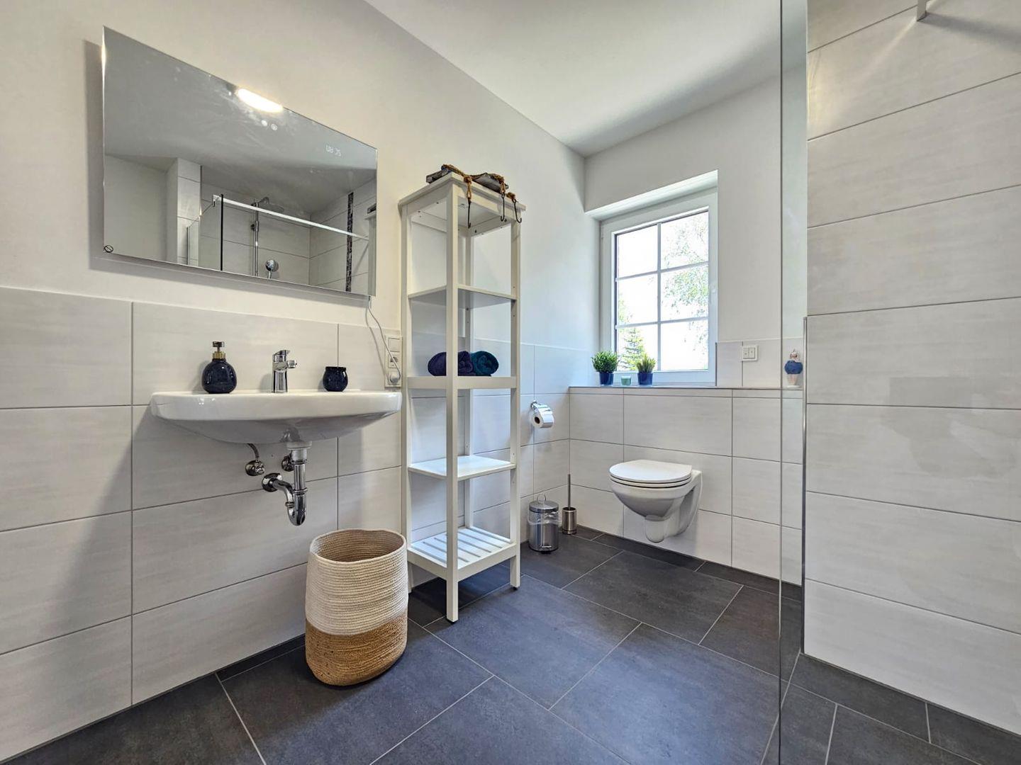 Das stilvolle Badezimmer ist hell, modern und komfortabel gestaltet. Es bietet Ihnen entweder eine Dusche oder eine Badewanne – ganz nach Ihren Wünschen. Zudem steht Ihnen eine hochwertige Infrarotkabine zur Verfügung, die für wohltuende Wärme und Entspannung sorgt – ideal nach einem langen Spaziergang am Meer. Eine Waschmaschine steht ebenfalls zur Nutzung bereit.