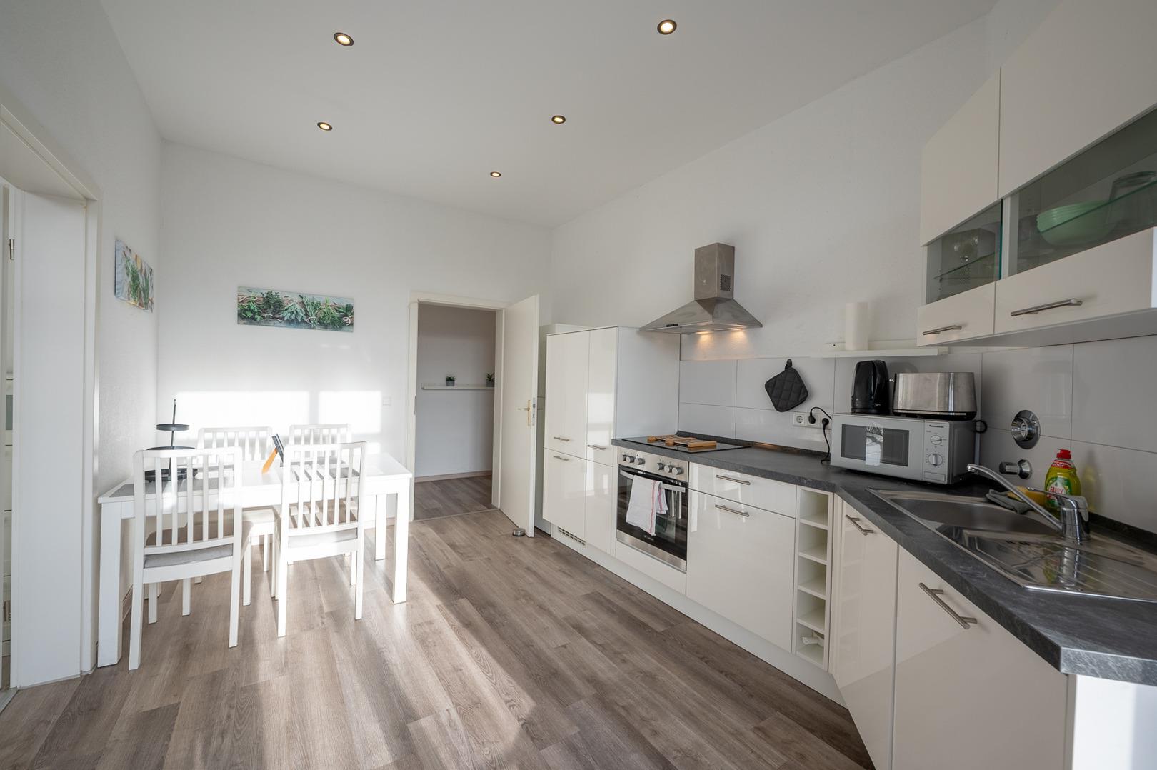 * Voll ausgestattete Küche mit Herd, Backofen, Kühlschrank, Kaffeemaschine, Wasserkocher, Töpfen, Pfannen & Geschirr