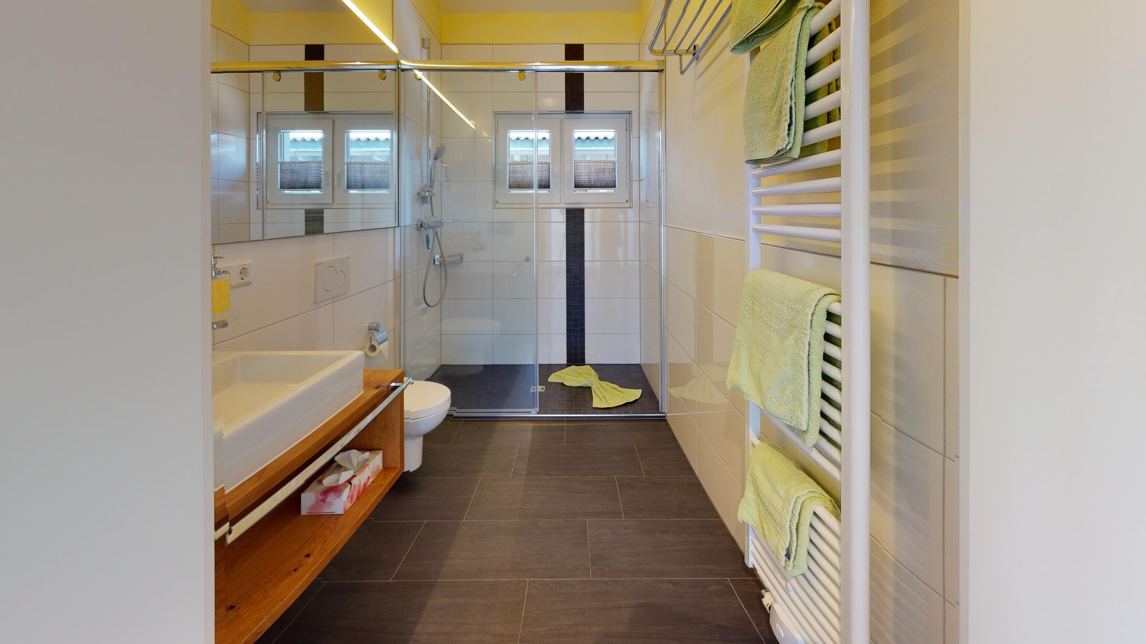 - begehbare Glasdusche, WC, Fön