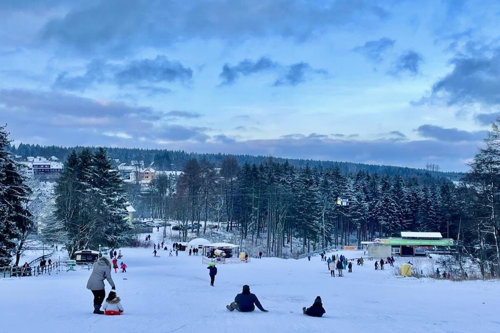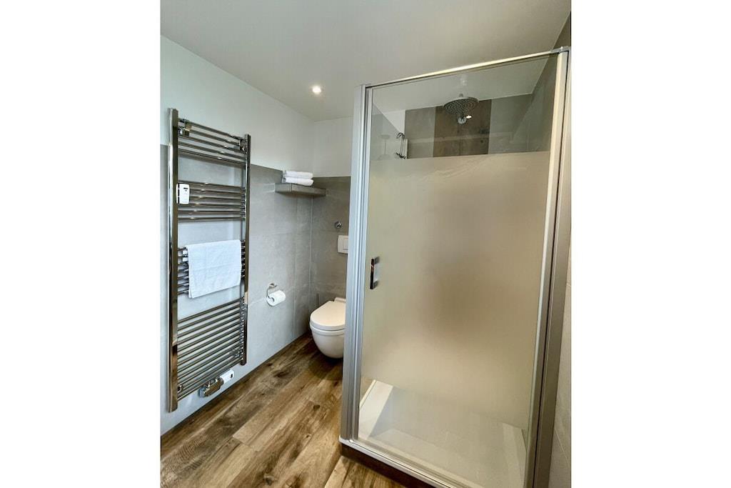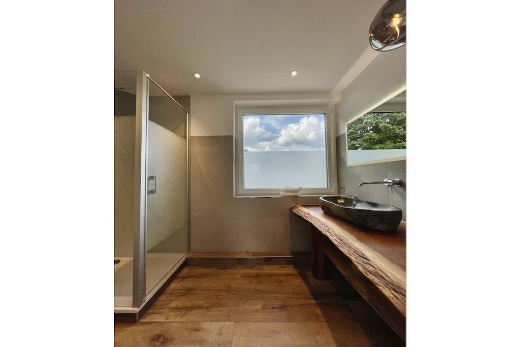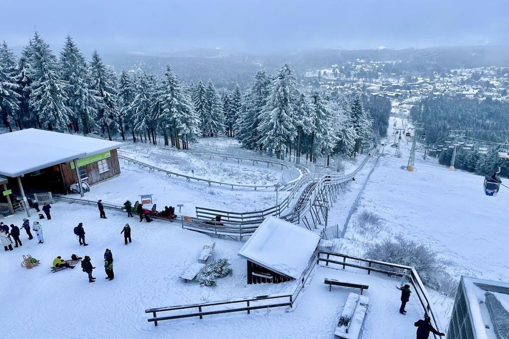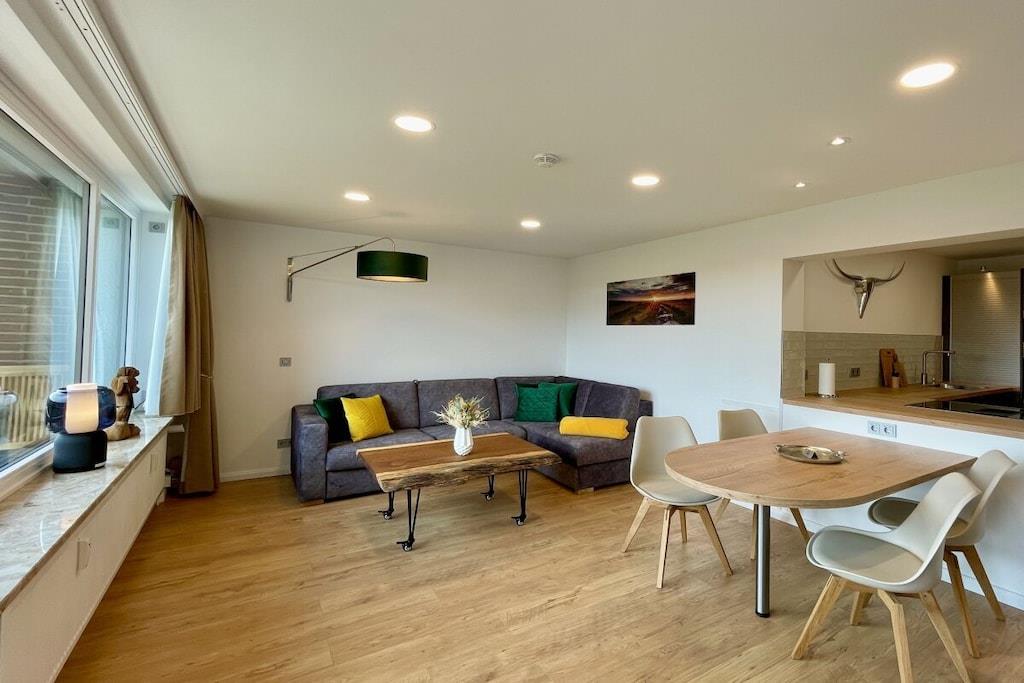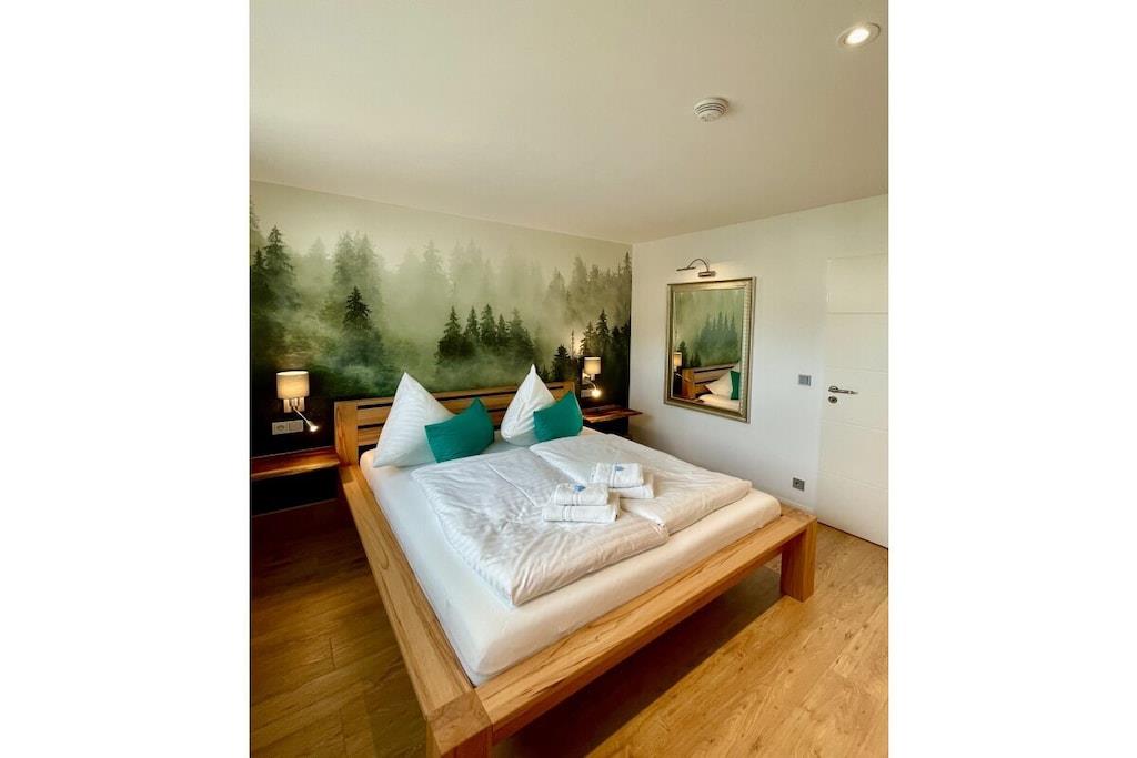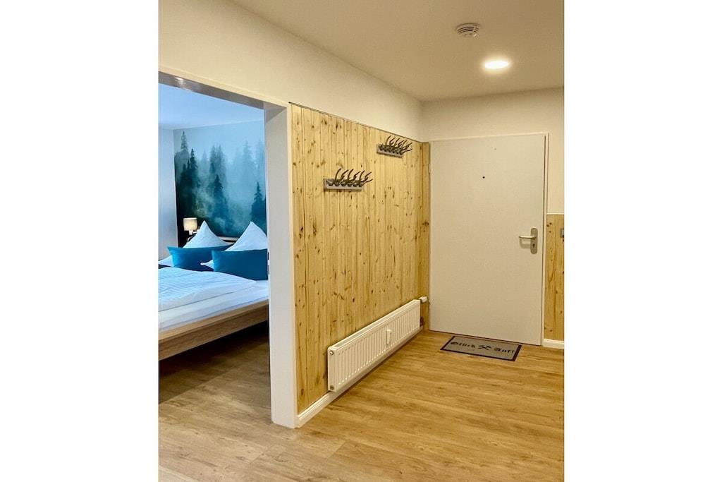 Die renovierte Ferienwohnung in Hahnenklee bietet erstklassigen Komfort und Exklusivität inmitten einer bezaubernden Umgebung. Diese 60 Quadratmeter große Oase in der 2. Etage eines herrlichen Domizils gewährt Ihnen den besten Ausblick auf den Wald, die Berge und den See. Im Jahr 2022 wurde die Wohnung von Grund auf saniert und auf den neuesten Stand gebracht. Die Wohnung bietet ausreichend Platz für bis zu drei Personen. Der behagliche Wohnbereich ist mit einem bequemen Ecksofa ausgestattet, das sich im Handumdrehen zu einem großzügigen Bett (1,50m x 2,00m) umwandeln lässt. Ein 75-Zoll Flachbildfernseher versorgt Sie mit unzähligen Unterhaltungsmöglichkeiten. In den kalten Monaten schafft ein Elektrokamin eine gemütliche Atmosphäre. Der sonnige Südbalkon lädt dazu ein, Ihre Gedanken bei einem Blick in die Harzer Natur schweifen zu lassen. Sie finden hier auch Terrassenmöbel, die es Ihnen ermöglichen, Ihr Frühstück oder Abendessen in aller Ruhe im Freien zu genießen. Der Balkon verfügt zudem über eine elektrische Markise. Das Schlafzimmer beherbergt ein gemütliches Bett (1,60m x 2,00m), in dem Sie erholsame Nächte verbringen werden. Hier steht ebenfalls ein Flachbildfernseher für Ihre Unterhaltung bereit. Eine Außenjalousie hält störendes Licht draußen. Das Badezimmer besticht durch ein Naturstein-Waschbecken und ist mit einer Regendusche, einem Handtuchwärmer, einem Waschtisch mit Kosmetikspiegel und einem Haartrockner ausgestattet. Ein Unterputzradio sorgt für eine angenehme Atmosphäre. Die offene Küche ist komplett ausgestattet und verfügt über einen Geschirrspüler, Backofen, Kühlschrank, Gefrierschrank, Mikrowelle, Induktionskochfeld, Toaster, Wasserkocher, Kaffeemaschine, Milchaufschäumer, Espressokocher, Mixer und Weinkühler. Am großzügigen Esstisch können Sie Ihr individuelles Dinner zelebrieren oder gesellige Gesellschaftsspiele mit Ihrer Familie genießen. Im geräumigen Flurbereich befindet sich ein elektrischer Schuhtrockner, um Ihre Wanderschuhe nach Ausflügen wieder trocken und bequem zu machen. Gegenüber der Wohnung steht ein kleiner Abstellraum für Koffer und zusätzliche Ausstattung zur Verfügung, darunter Kinderbett, Hochstuhl, Bügeleisen, Wäscheständer und Schlitten. Des Weiteren finden Sie dort Waschmarken für die Gemeinschaftswaschmaschine im Keller. Ein kostenloser Außenstellplatz vor dem Gebäudeeingang gehört ebenfalls zur Verfügung. Das WLAN mit einer Bandbreite von 150 Mbit ist für Sie kostenfrei nutzbar. Wir bitten um Verständnis, dass Haustiere und das Rauchen in der Wohnung aus Rücksicht auf andere Gäste nicht gestattet sind, aber auf dem Balkon ist das Rauchen erlaubt.
