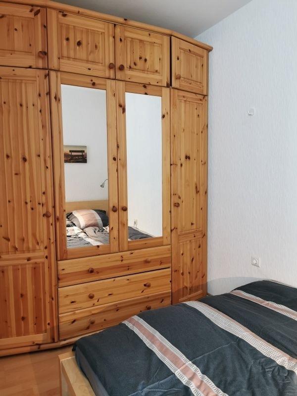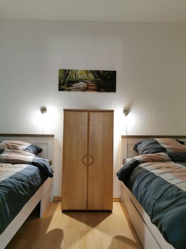 Ein Schlafzimmer ist mit einem 1,40 m breiten Bett, einem großen Schrank sowie einem Fenster ausgestattet. Das andere Schlafzimmer ist mit 2 90 cm Betten mit einer Kommode ausgestattet.