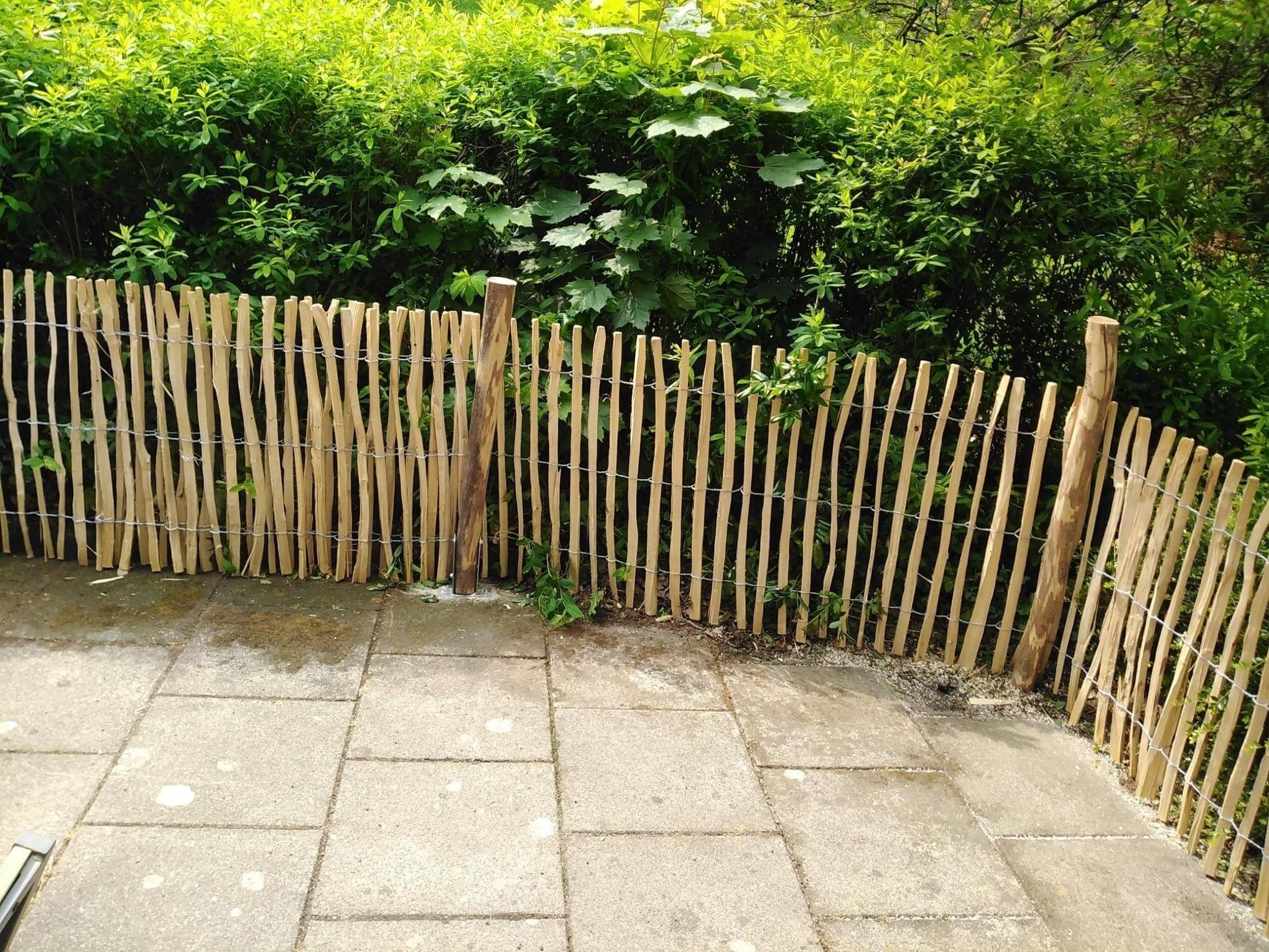 Die Terrasse ist mit einem Staketenzaun eingezäunt.