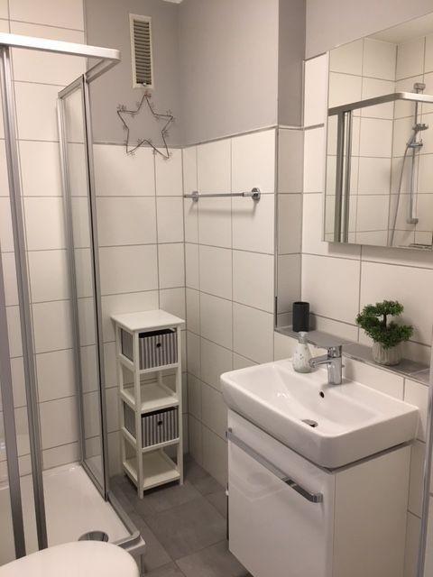 Ein helles, freundliches Duschbad rundet diese Einheit ab.