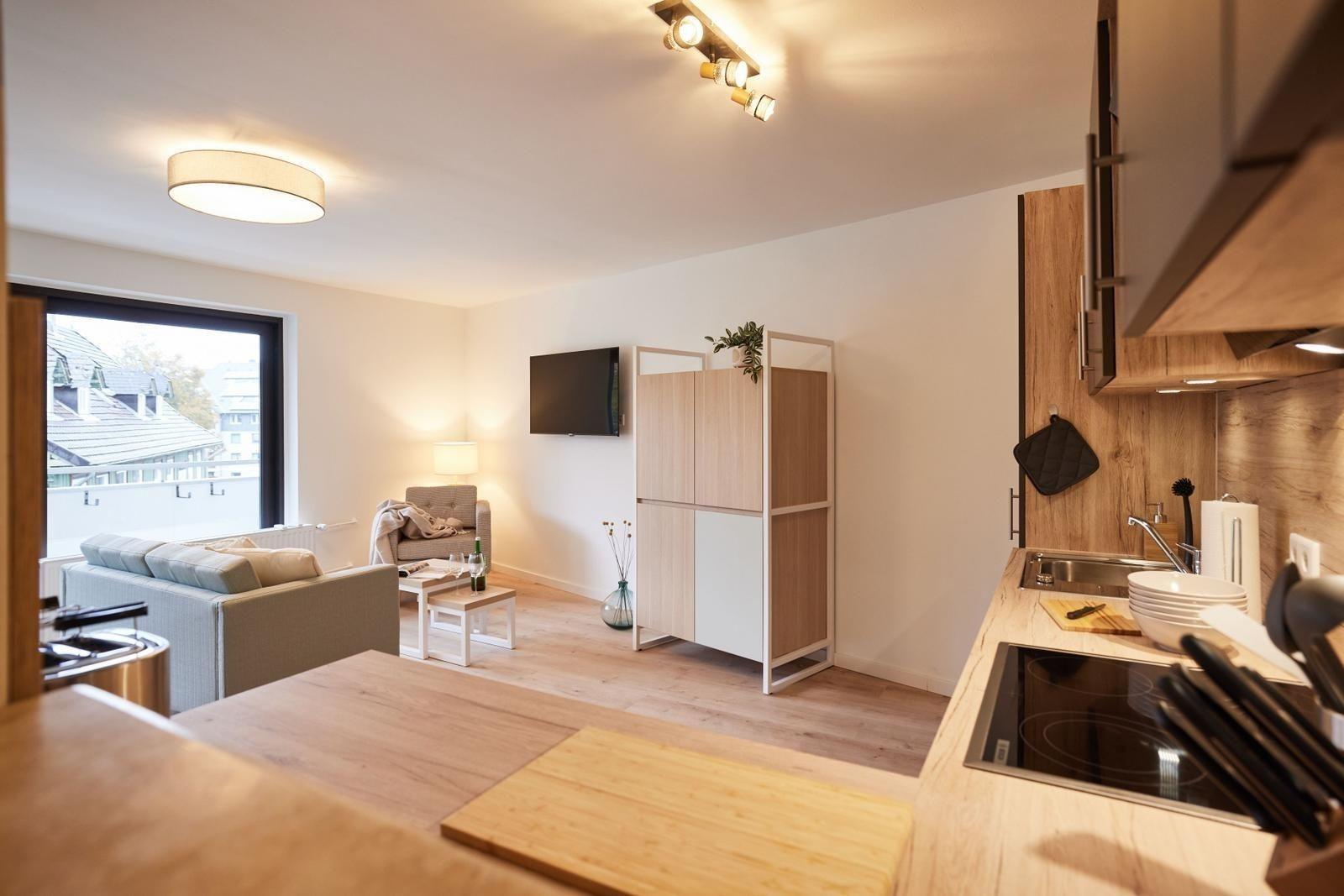 1 Zimmer mit viel Platz und offener Küche, Balkon. ausgestattetes Badezimmer.