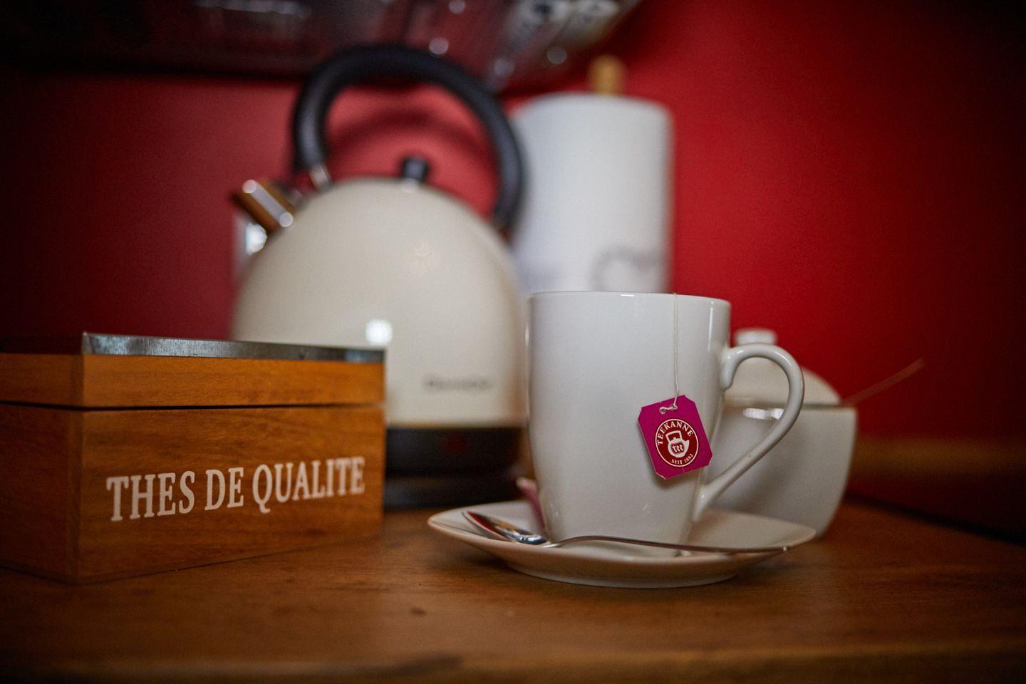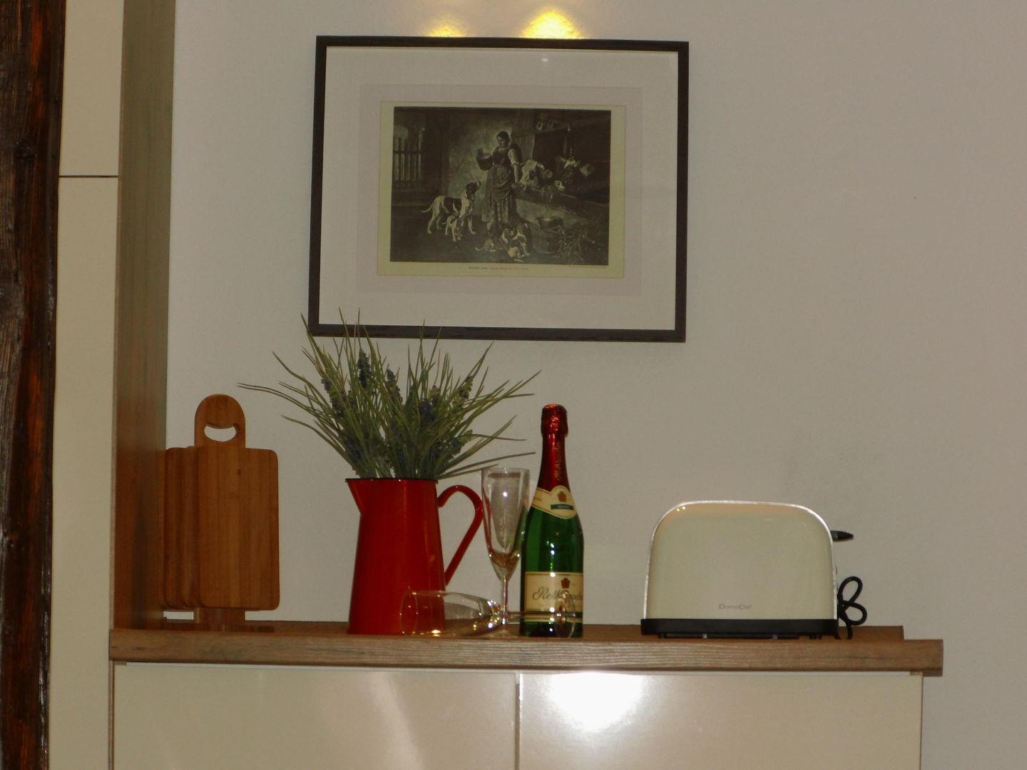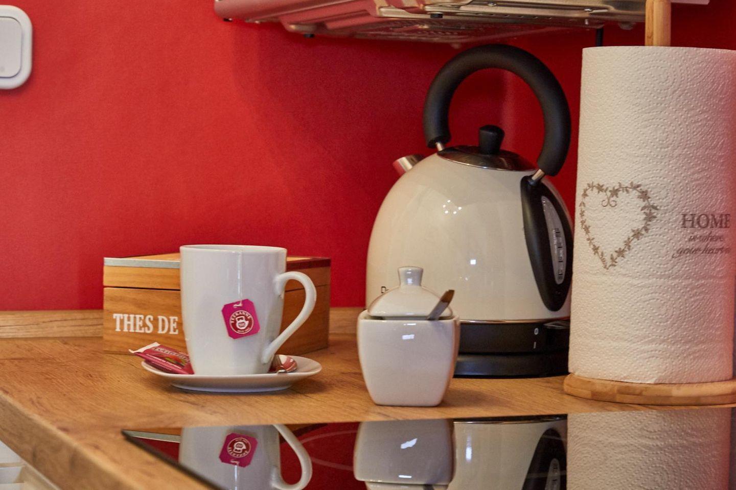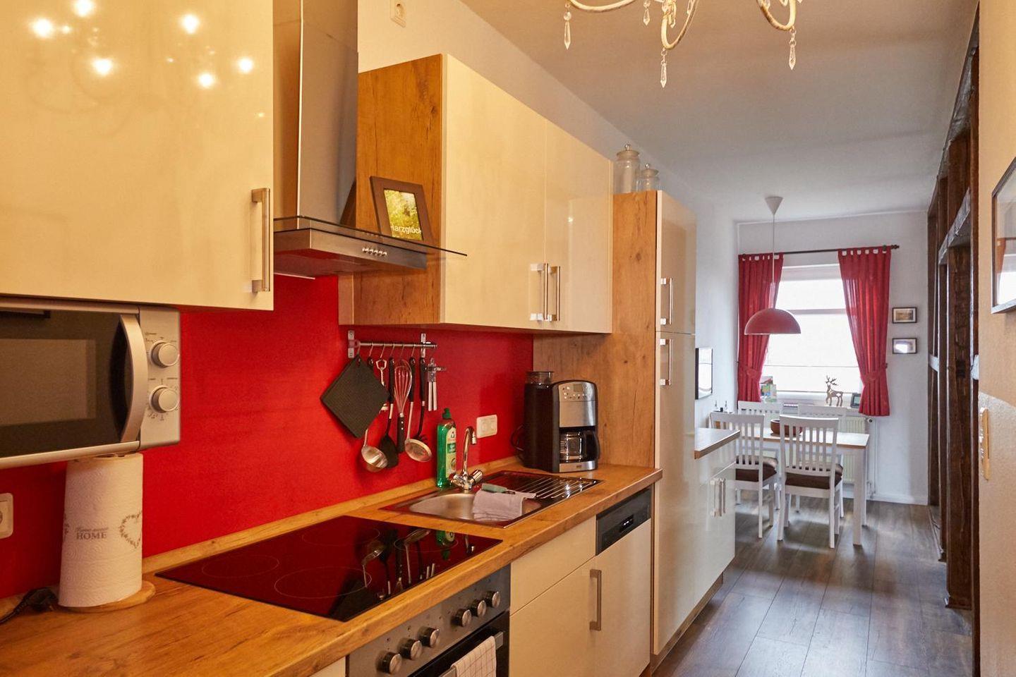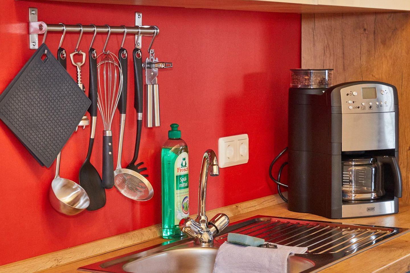 Die Küche ist mit Herd, Backofen, Geschirrspülautomat, Kühlschrank mit Tiefkühlfach, Kaffeeautomat, Mikrowelle, Wasserkocher, Toaster, Geschirr, Besteck, Gläser, Töpfe und Pfannen ausgestattet.
