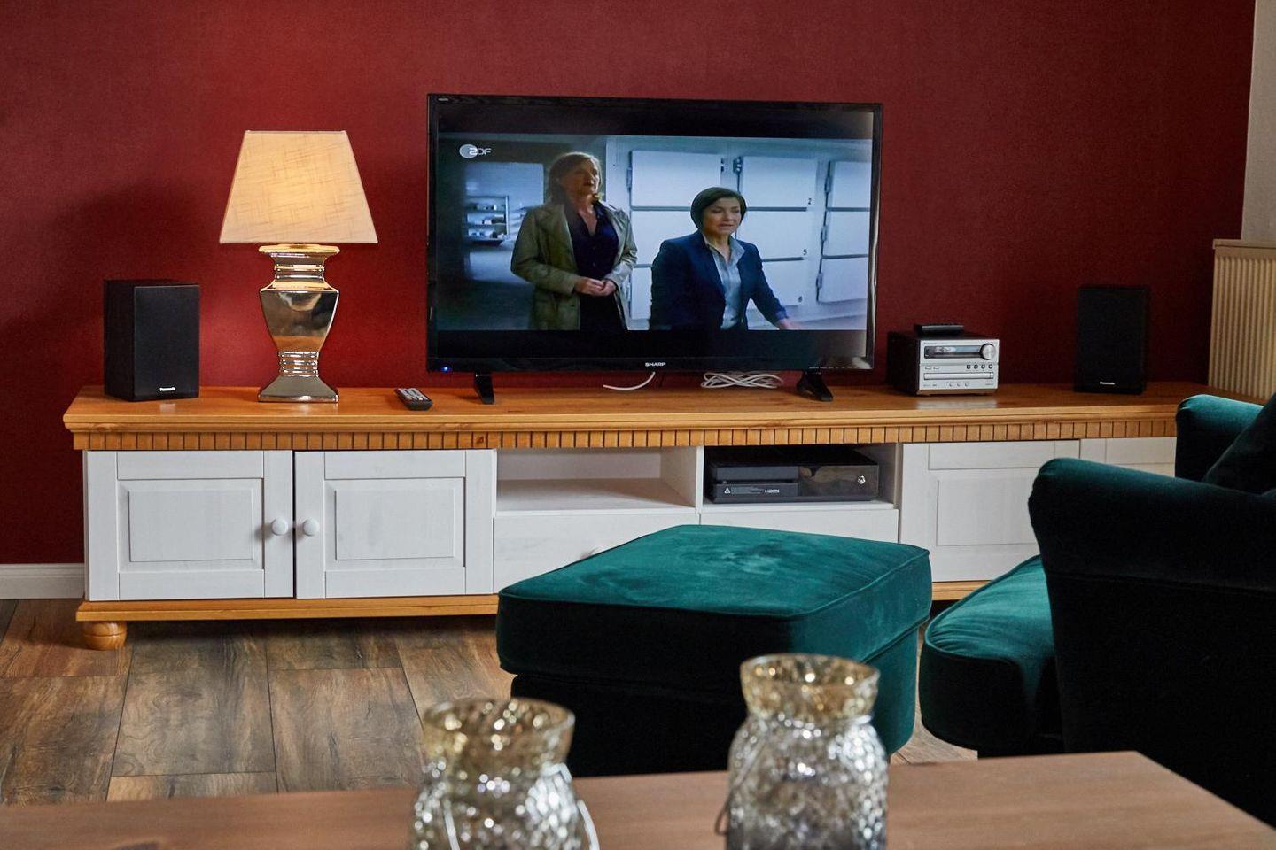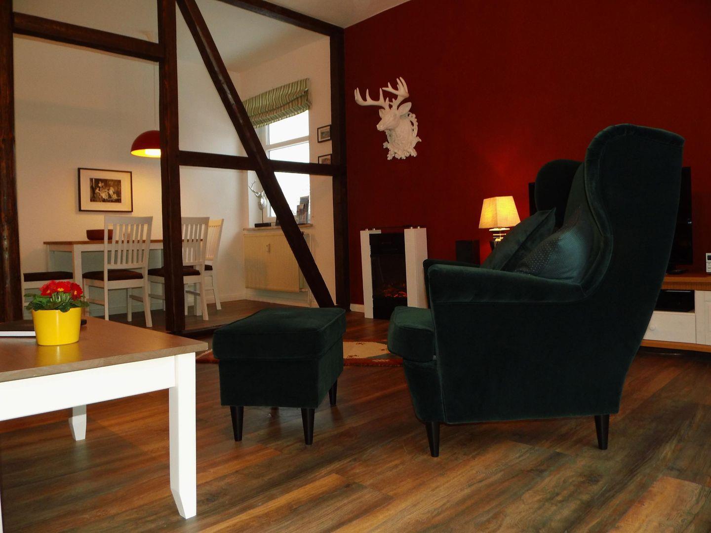 Sitzgruppe mit Schlafcouch, Essplatz, Kamin, TV, Musikanlage und X-Box.