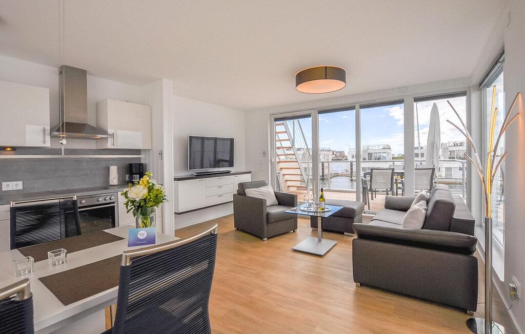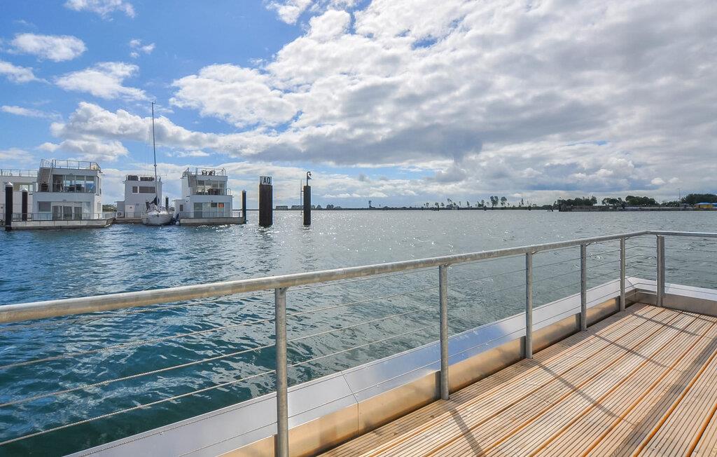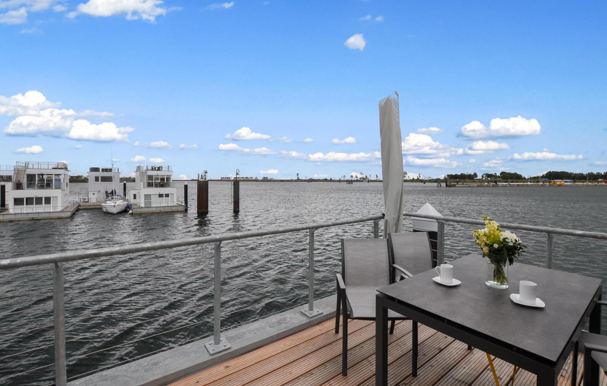 Et høydepunkt i det flytende feriehuset Haithabu er den 30 m² store takterrassen med sol hele dagen. Her kan du nyte utsikten over vannet fra komfortable loungemøbler. I tilknytning til stuen er det en annen terrasse med vinduer fra gulv til tak og en fenomenal utsikt over seil- og sportsbåthavnen i Østersjøen.